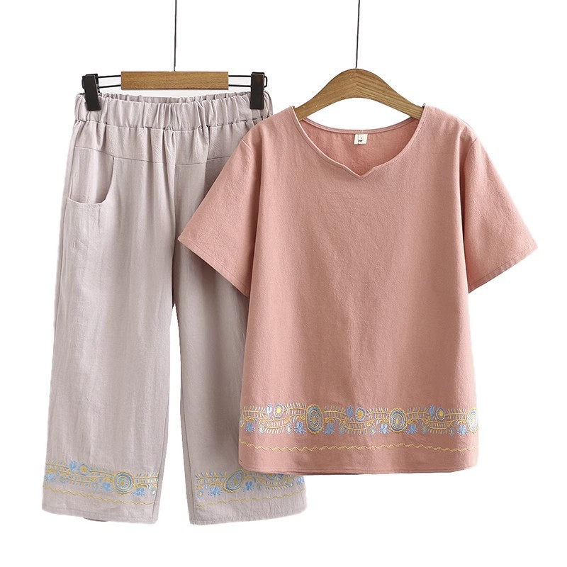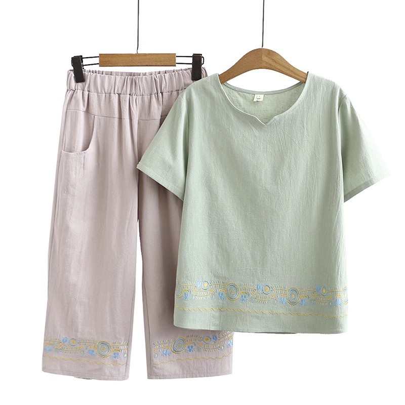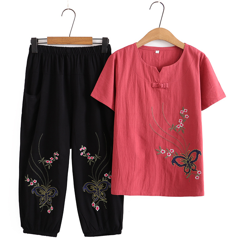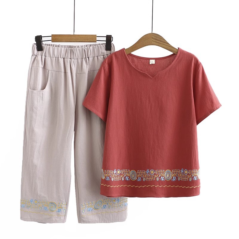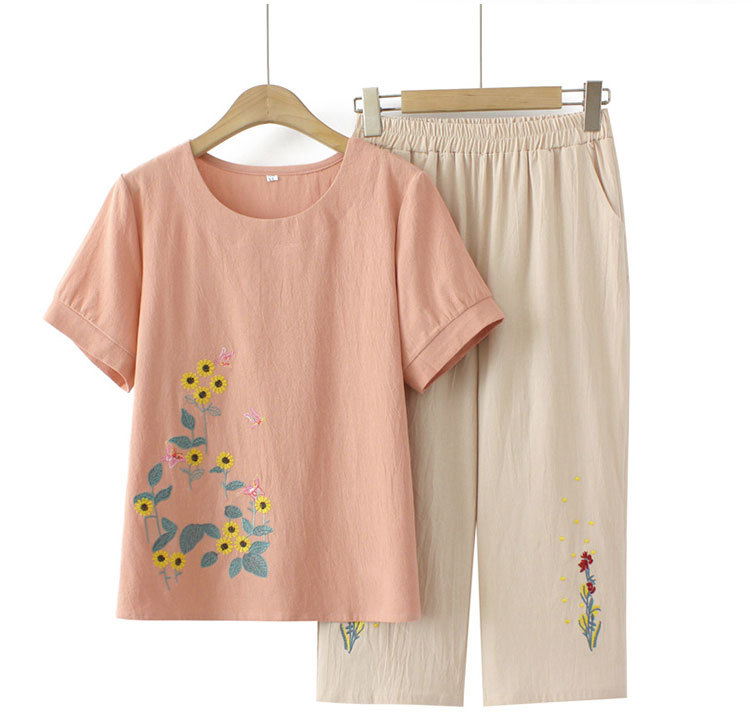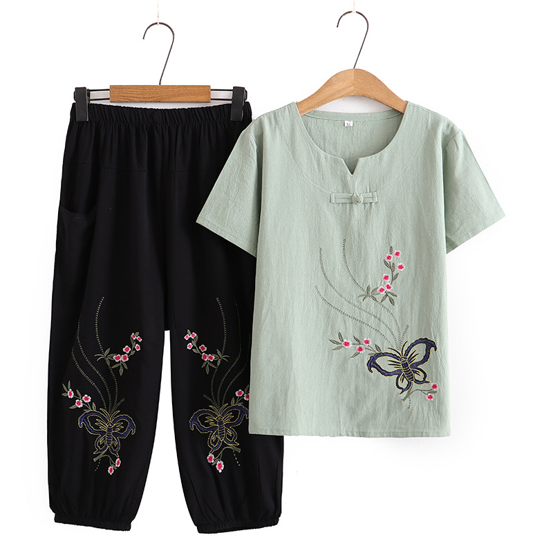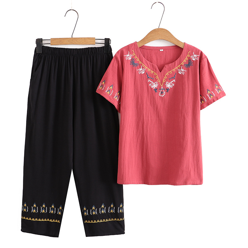 Летний костюм больших размеров для мам среднего и пожилого возраста с вышивкой, женская тонкая футболка с короткими рукавами, женский модный комплект из двух предметов
