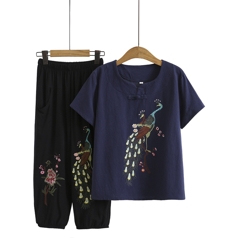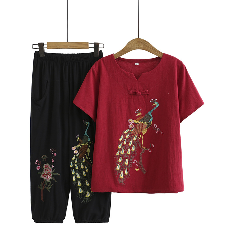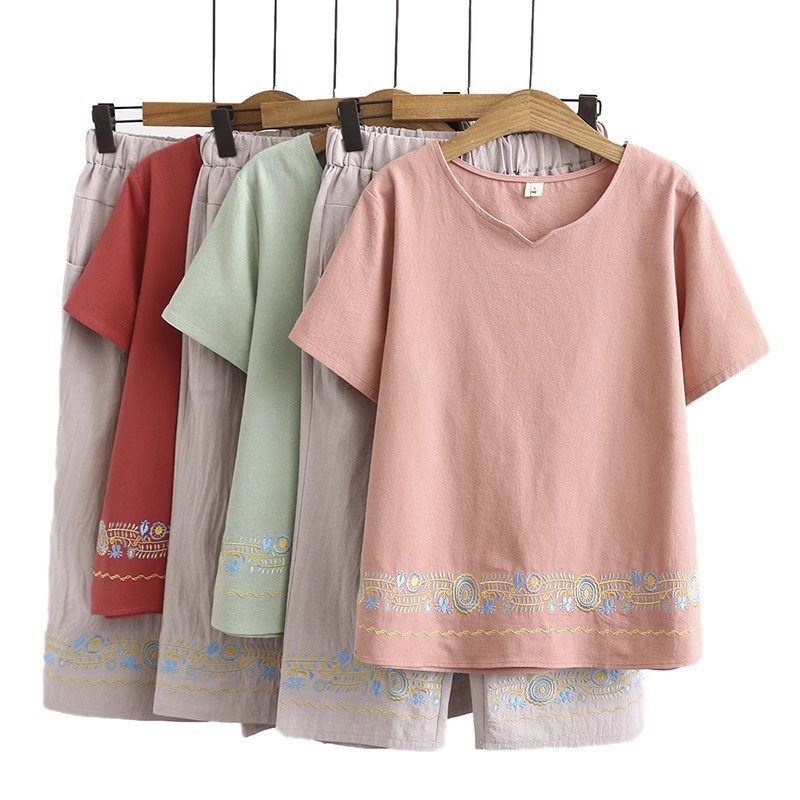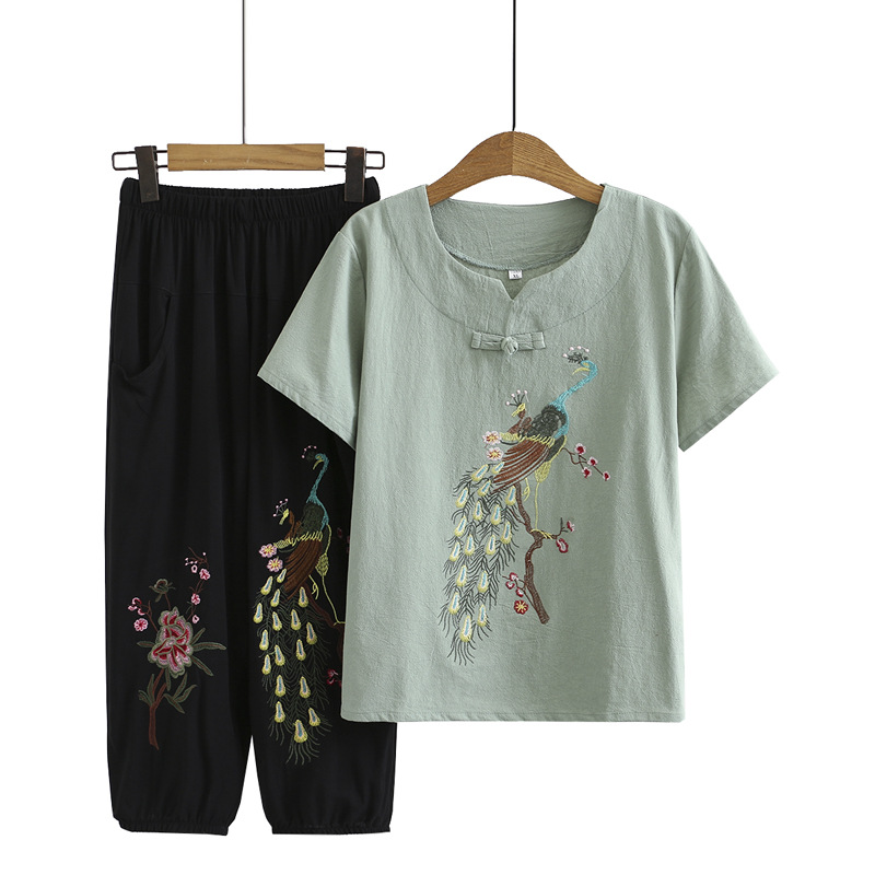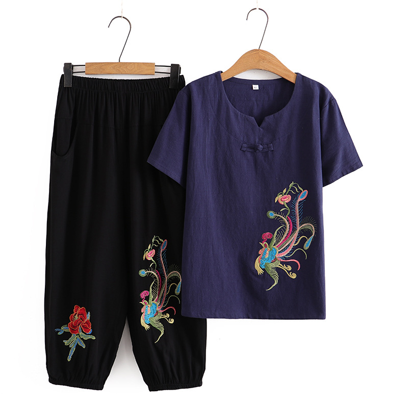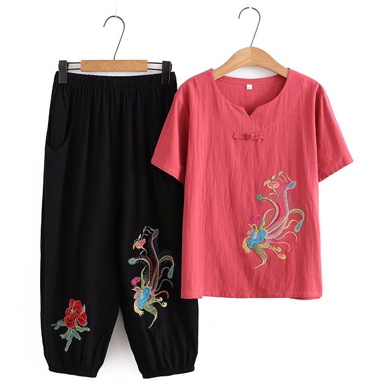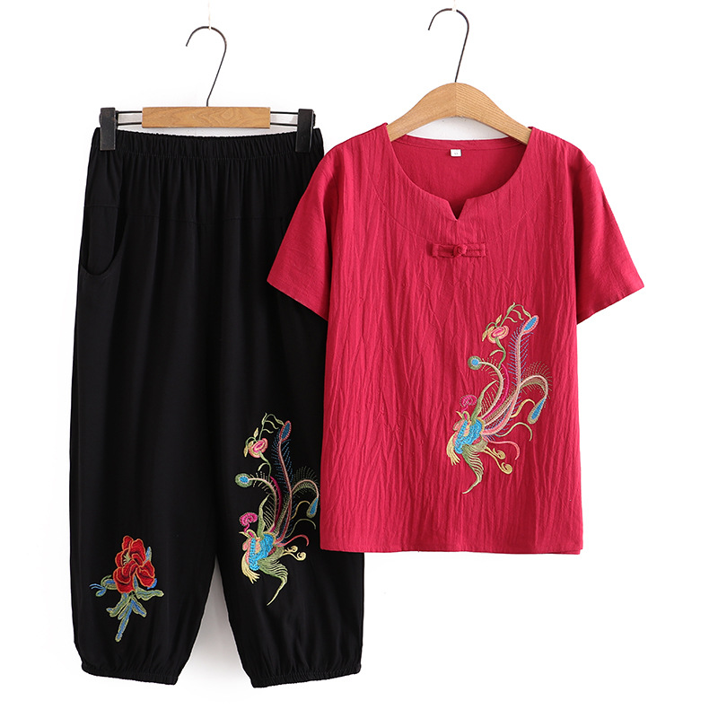 Летний костюм больших размеров для мам среднего и пожилого возраста с вышивкой, женская тонкая футболка с короткими рукавами, женский модный комплект из двух предметов