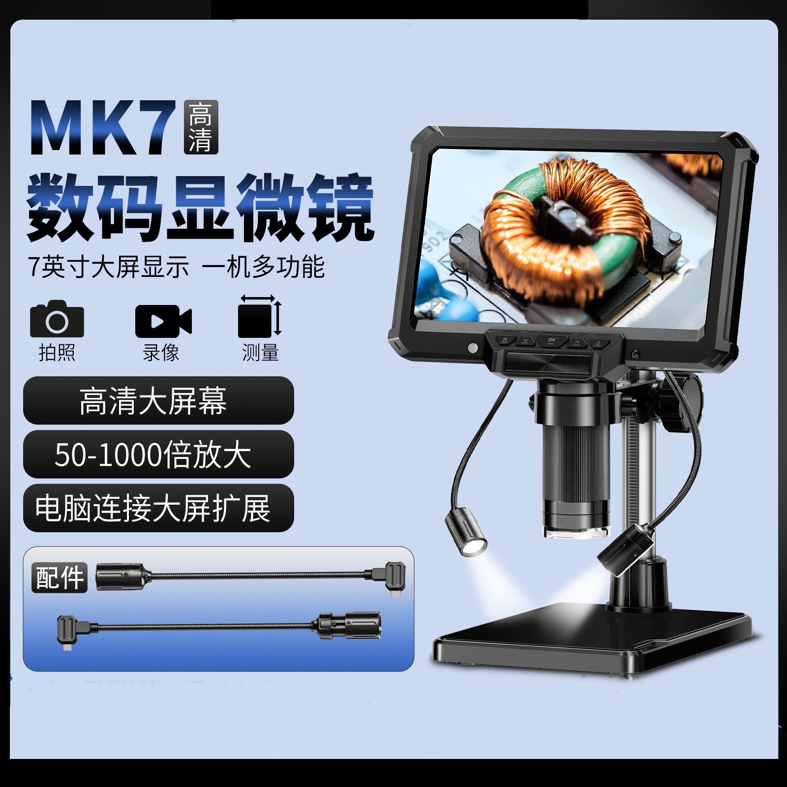 新款7英寸IPS高清数码电子工业显微镜 带2个弯管补光灯 维修检测参数: