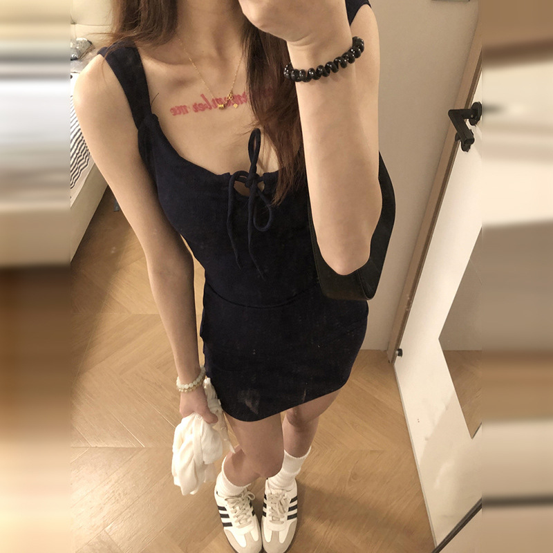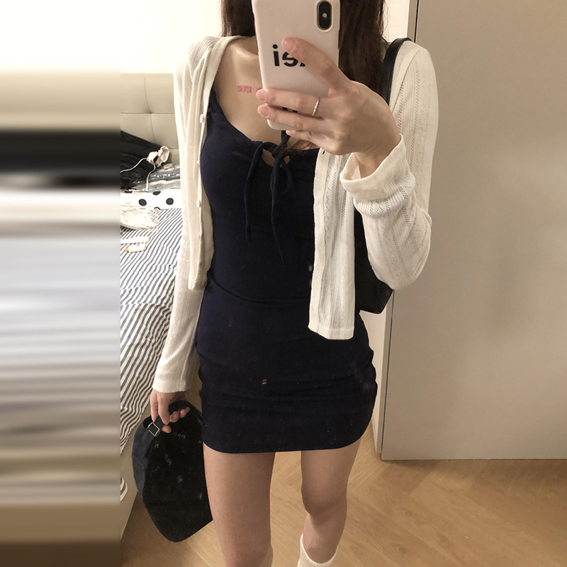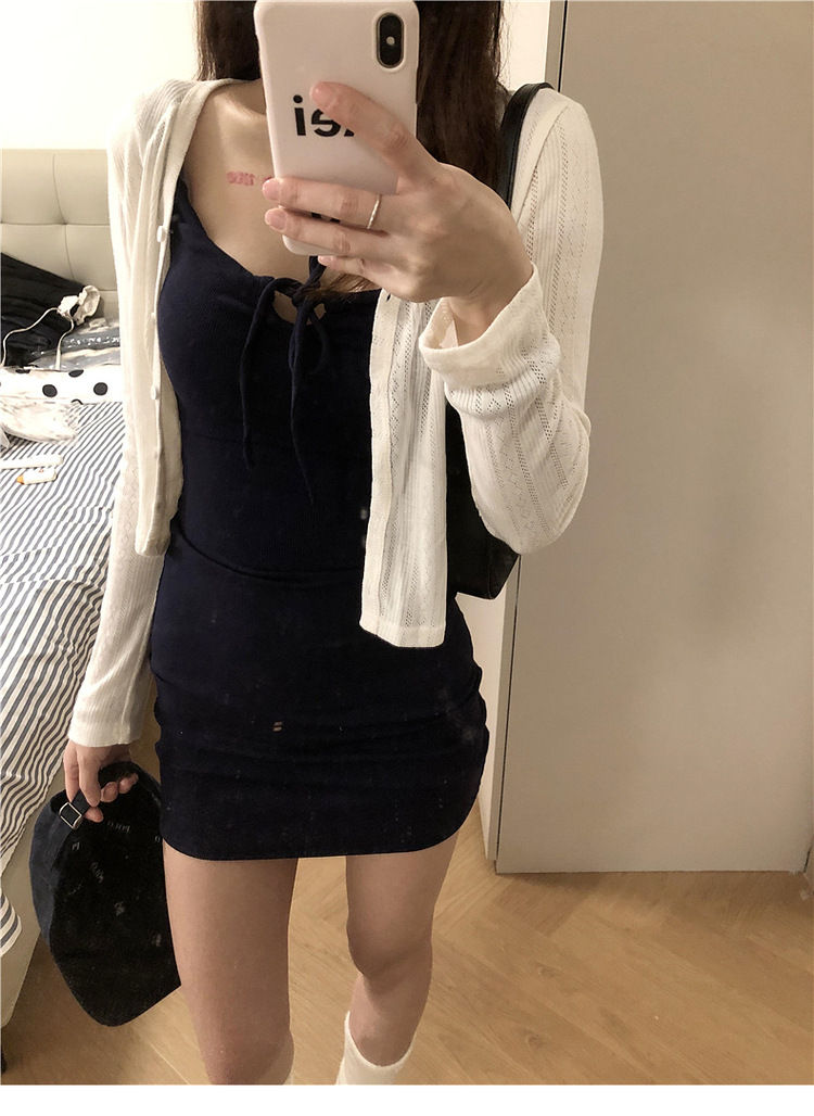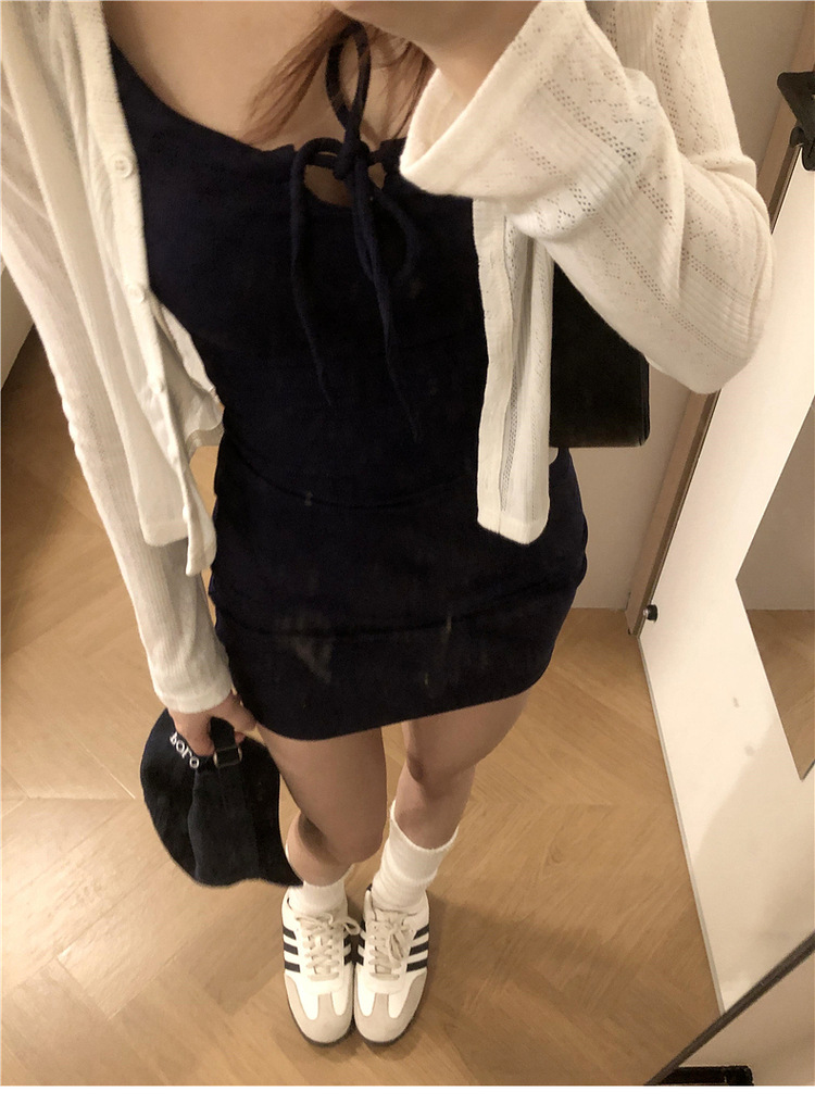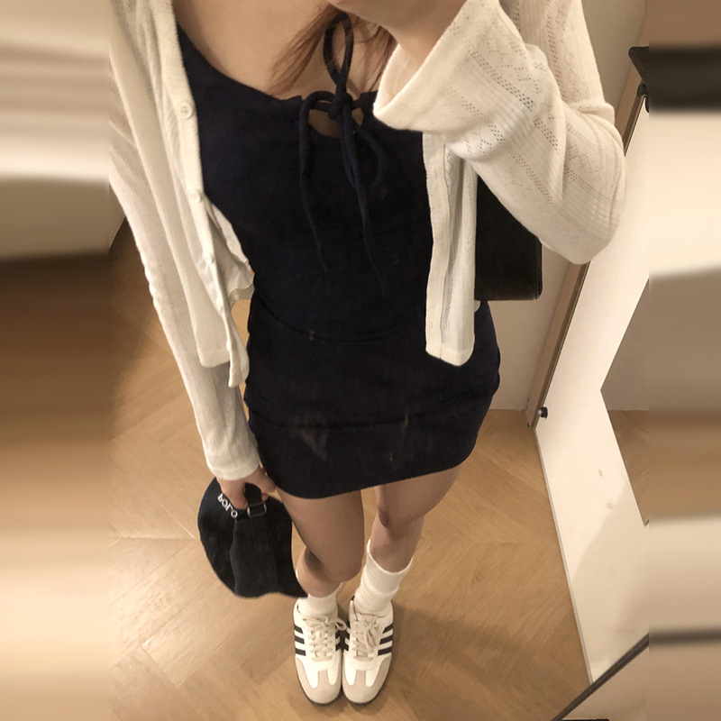 [Темно-синий] Наряд для ранней летней поры 2025 года/наряд для путешествий/популярный в этом году/очень милый/супер милый/прекрасный для лета/в корейском стиле, миниатюрный/стильный; 【Белый кардиган】Утягивающий весенне-летний наряд / Элегантный топ для ранней летней погоды / Летний образ OOTD / Модная женская одежда этого года / Новая женская мода 2025 / Подчеркнутая талия / Лето