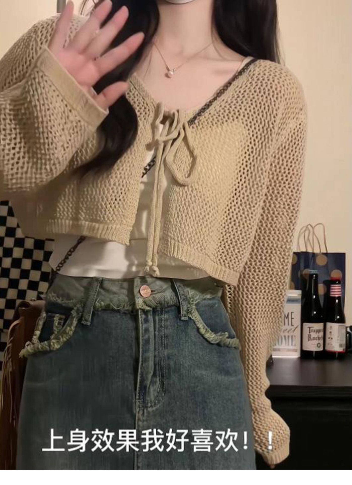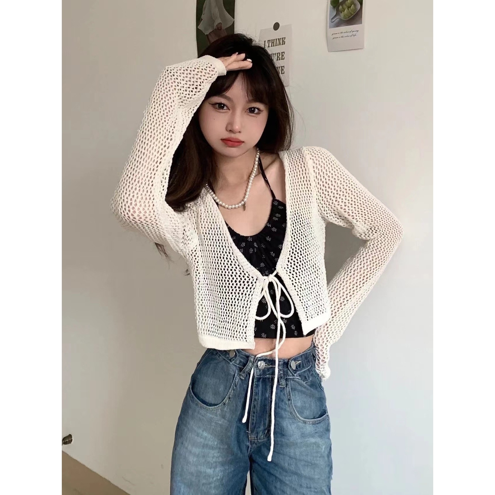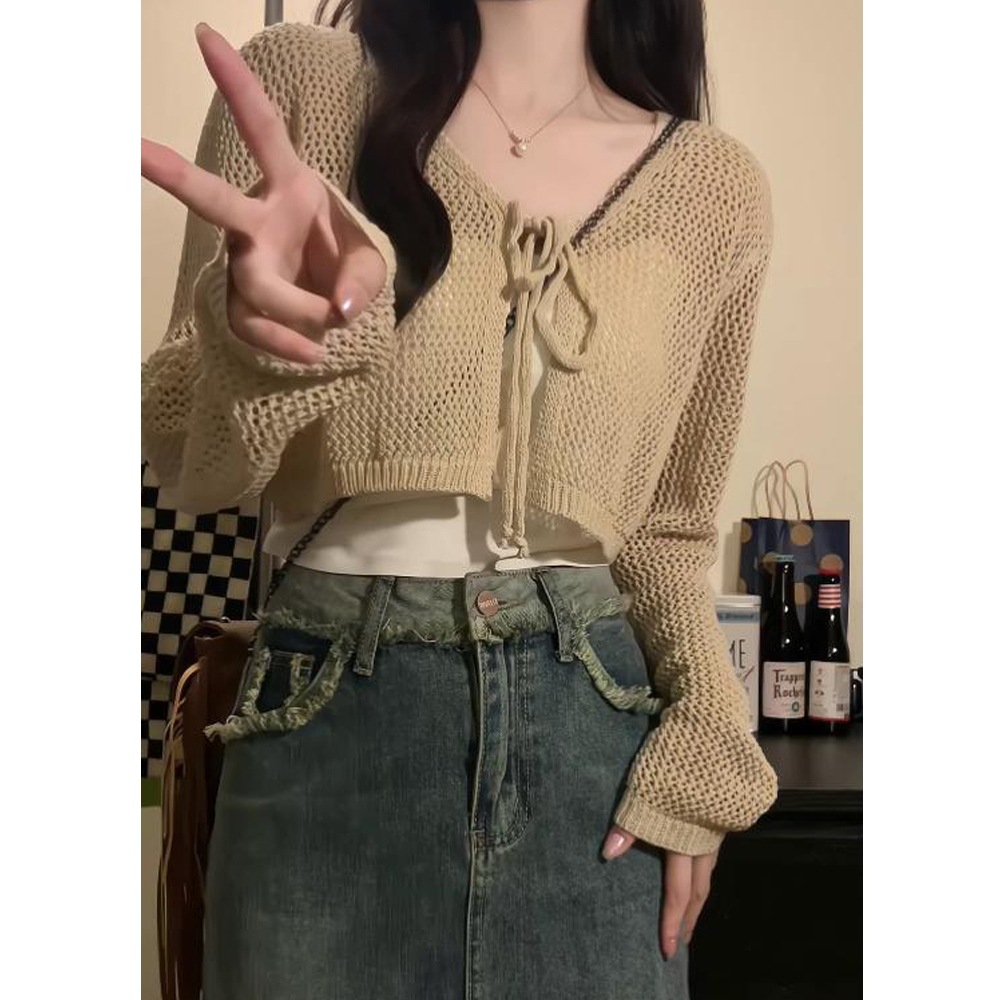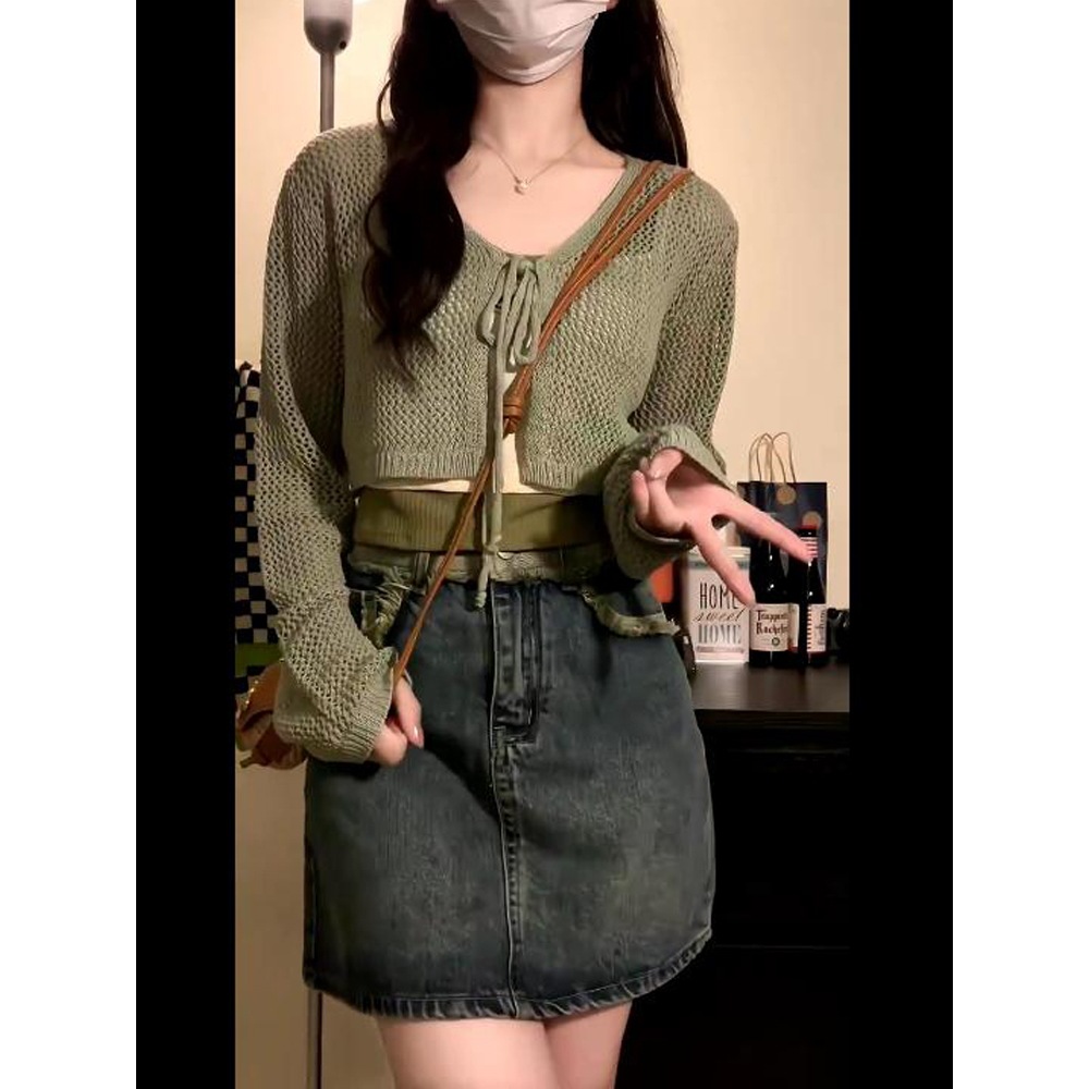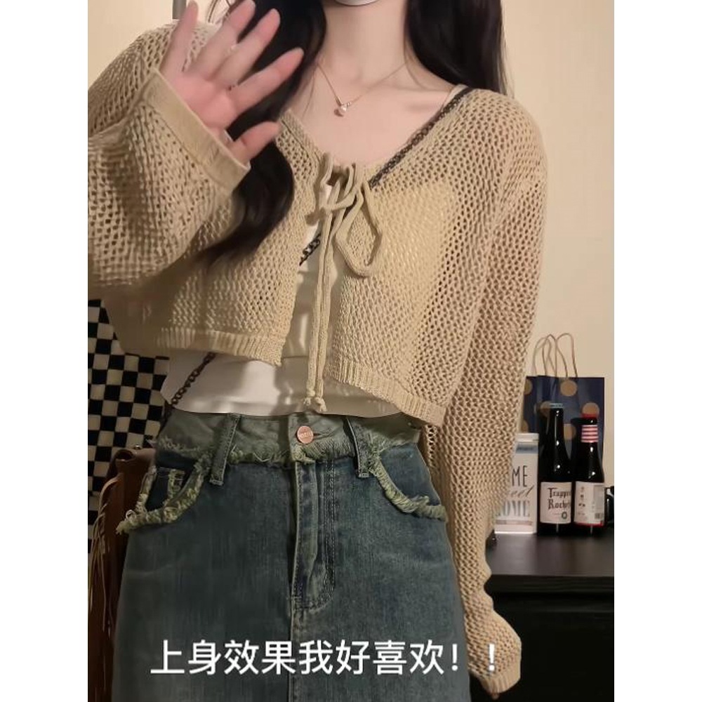 Летний тонкий солнцезащитный кардиган для женщин с юбкой на подтяжках, блузкой-шалью, вязаным маленьким жилетом, короткой курткой с вырезами.