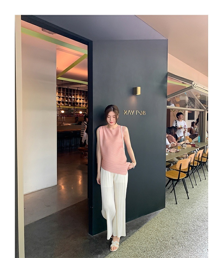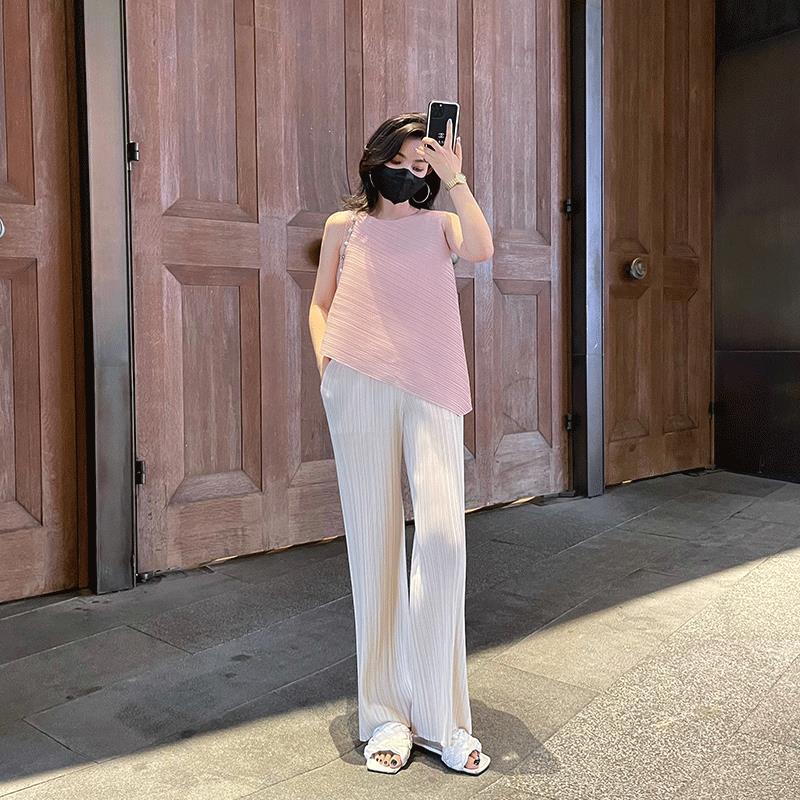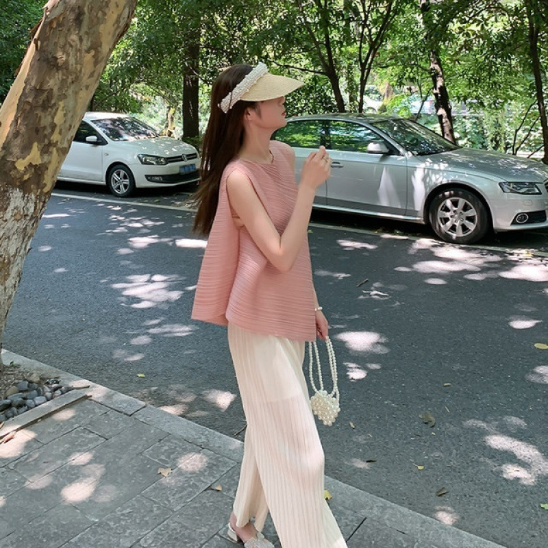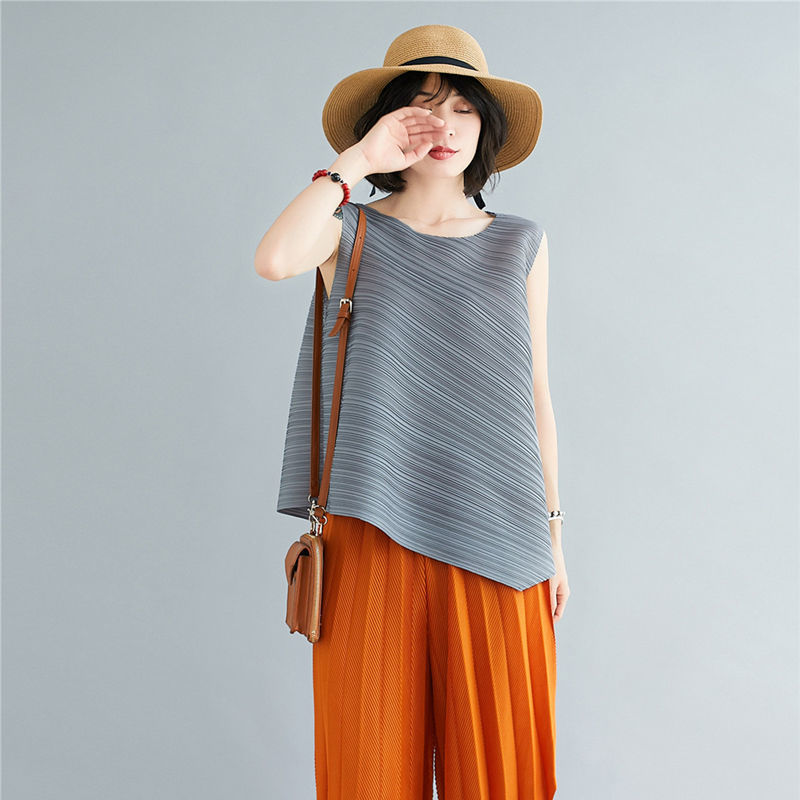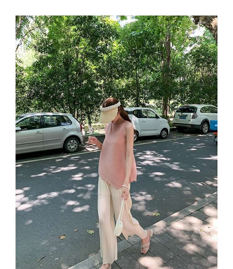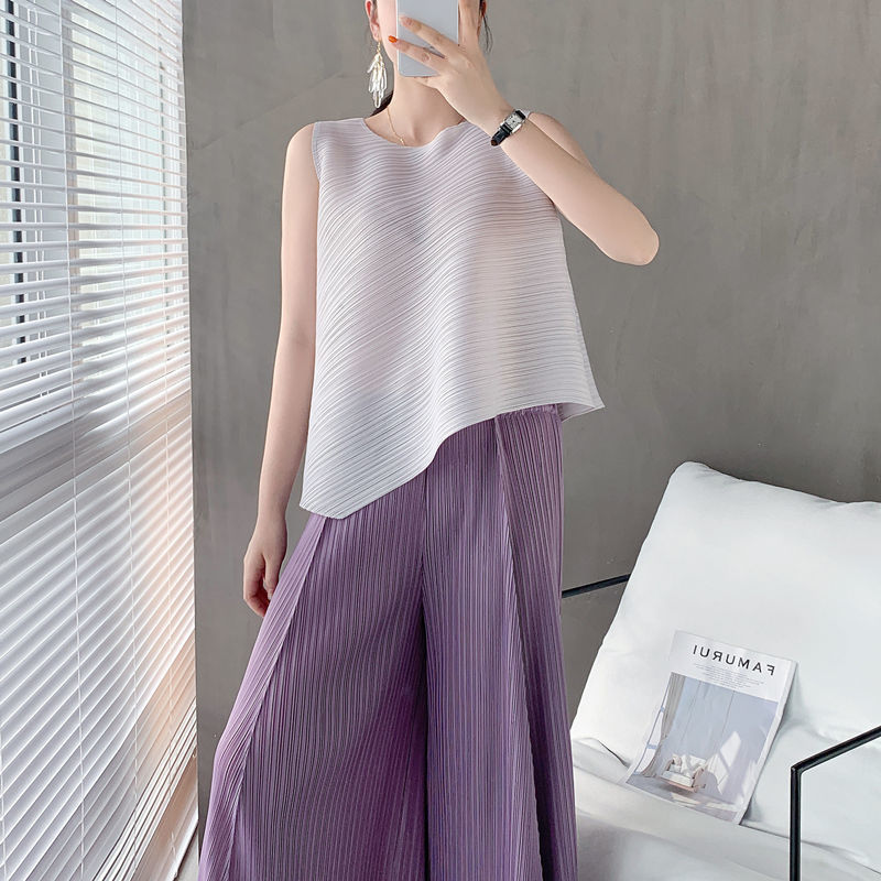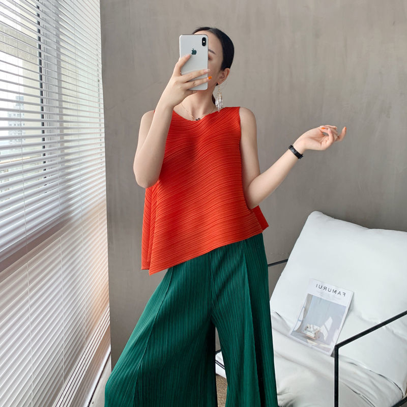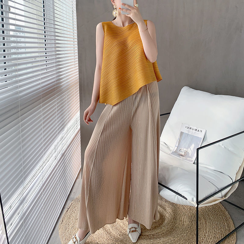Mengmengjia, плиссированная футболка нестандартного дизайна Miyake, женский летний жилет без рукавов, топ + драпированные широкие брюки, комплект