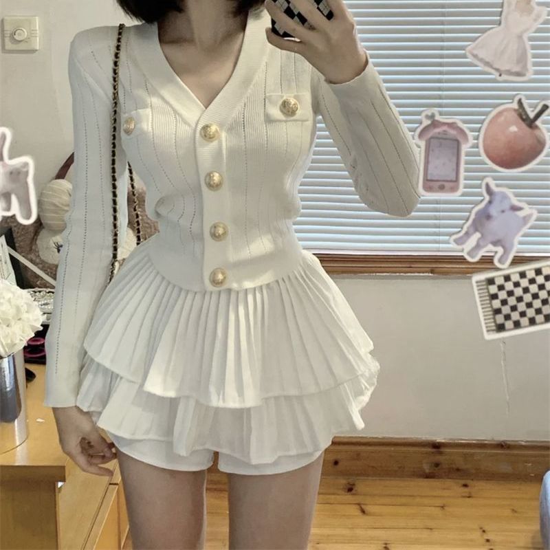 [Одиночная] Черная плиссированная юбка, высококачественное качество изготовления.; [Одиночная] Белая плиссированная юбка, высококачественное качество изготовления.; [Одиночный] Черный вязаный кардиган, высококачественное качество изготовления.; [Одиночный] Белый вязаный кардиган, высококачественное качество изготовления.; [Набор из двух предметов] Черный костюм, высококачественное качество изготовления.; [Набор из двух предметов] Белый костюм, высококачественное качество изготовления.