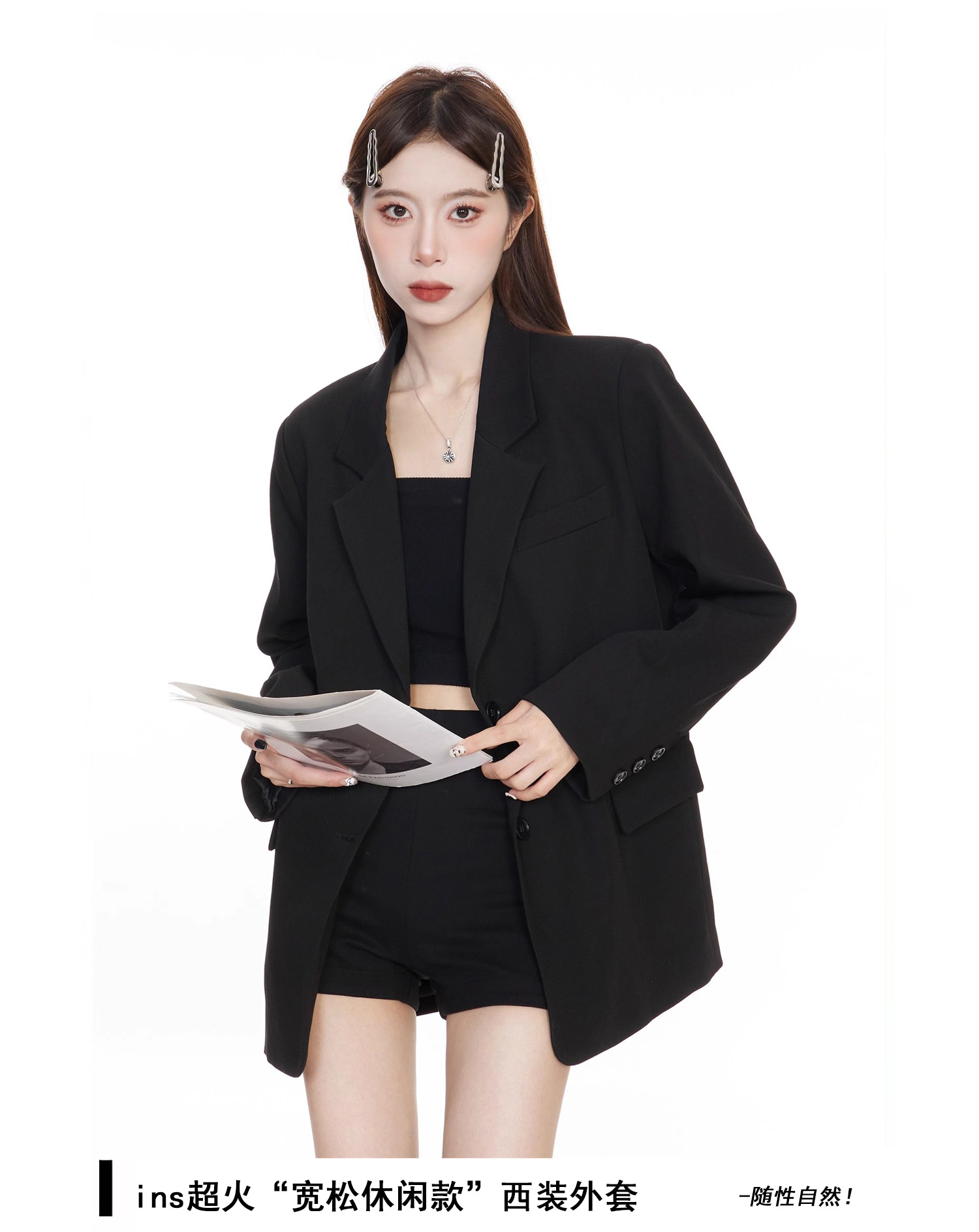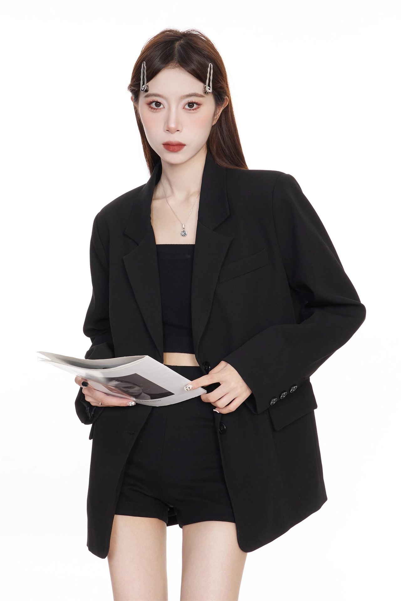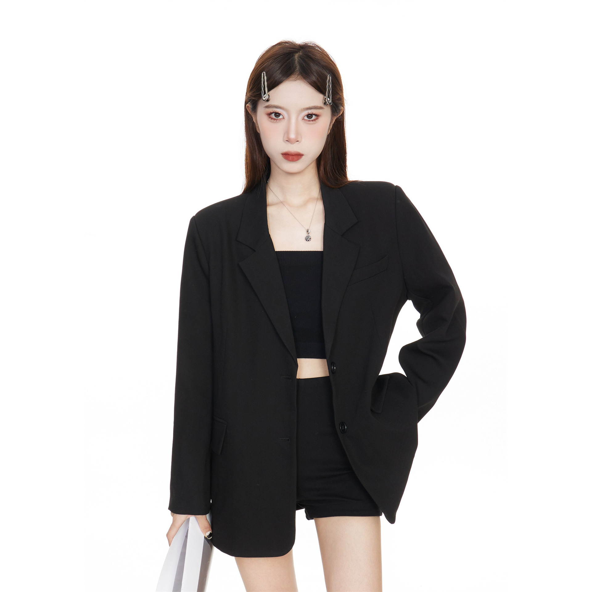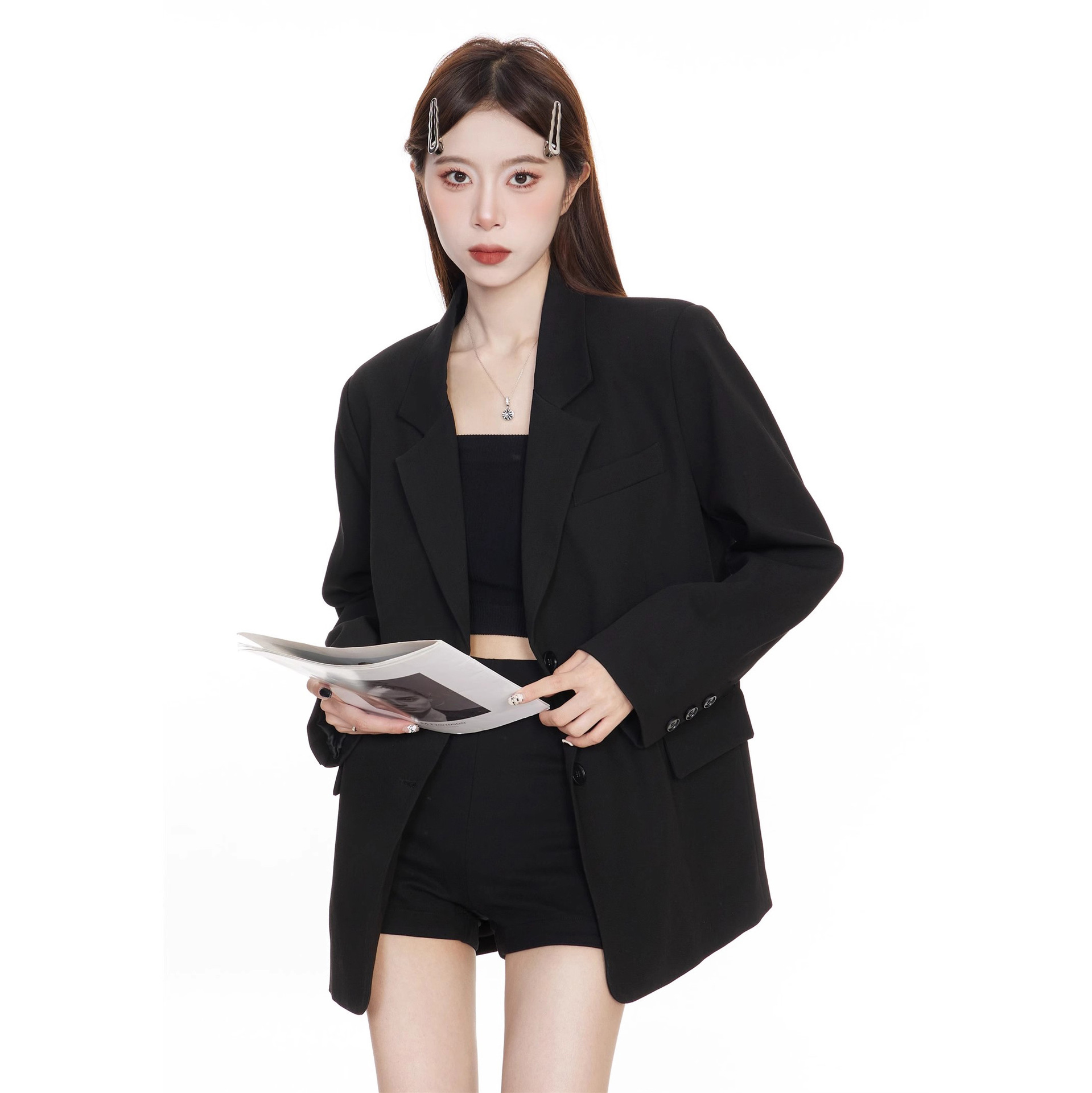 Черный блейзер для женщин, корейский стиль, повседневный дизайн, 2025 высококлассный, элегантный, свободный, стройнящий, костюм для миниатюрных.