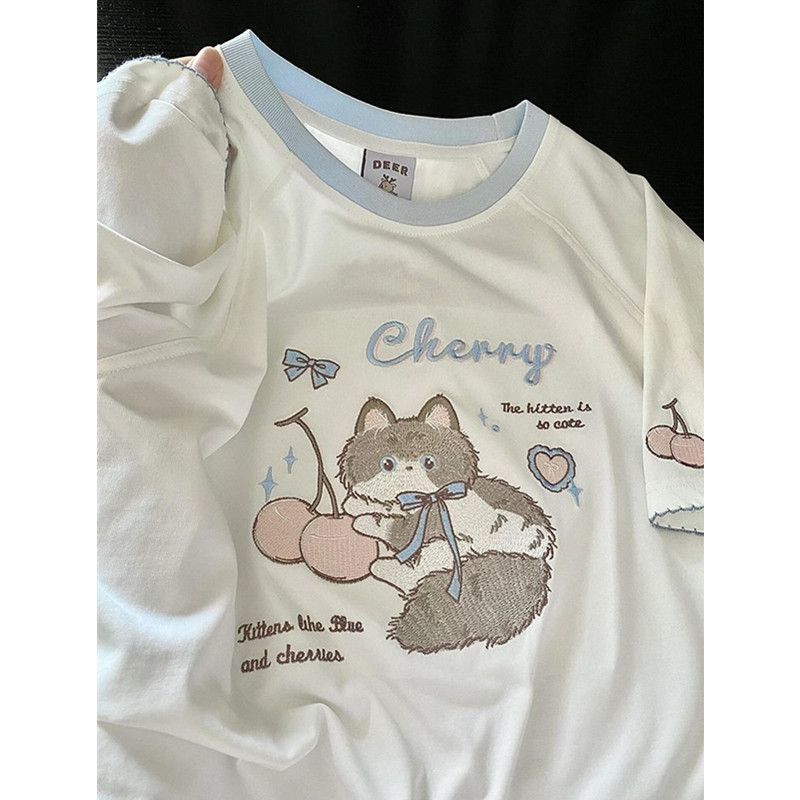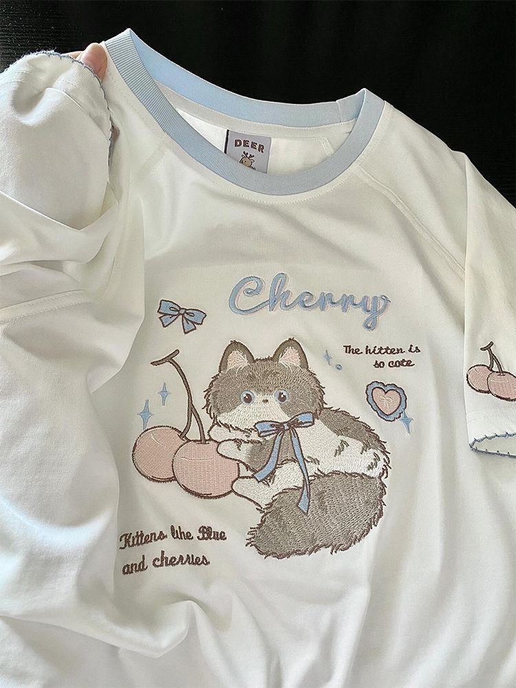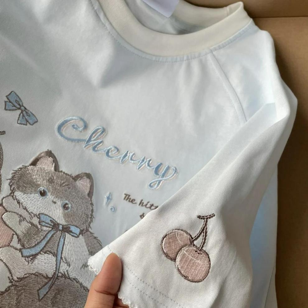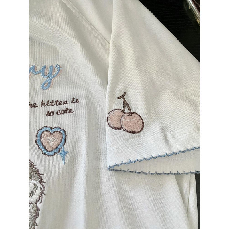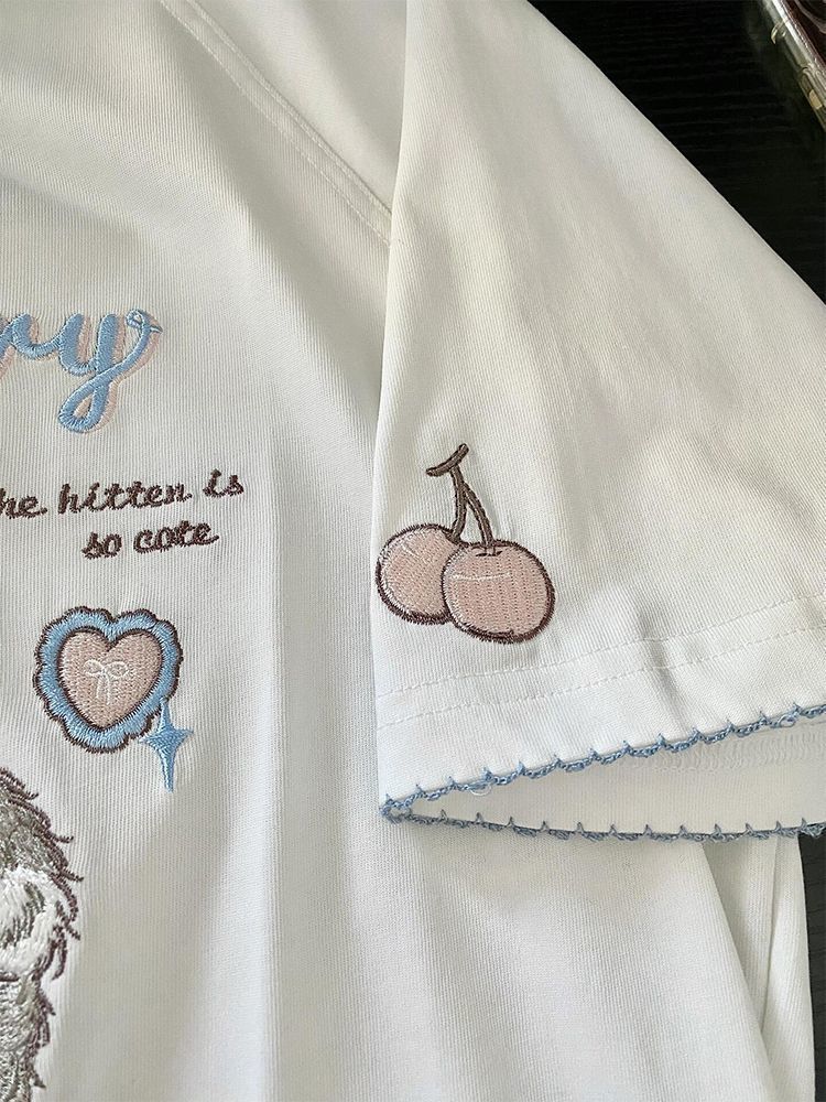 Рубашка с короткими рукавами из чистого хлопка/хлопка/хлопка/хлопка/хлопка/хлопка/хлопка с вышивкой котенка для женщин, летняя новая милая и милая кошка