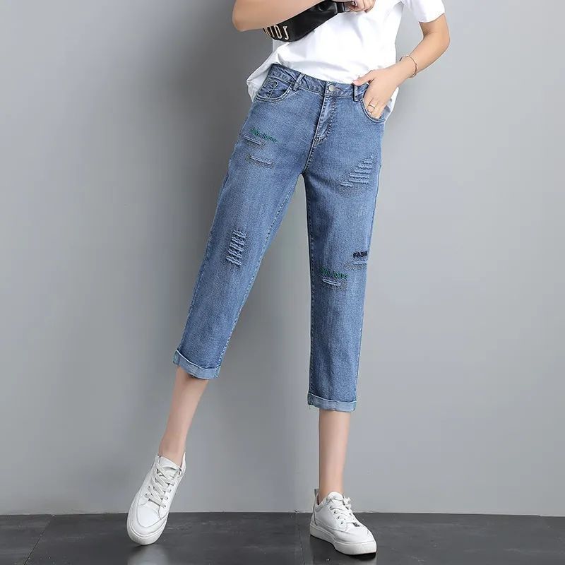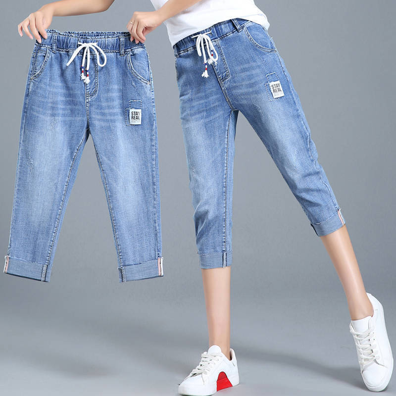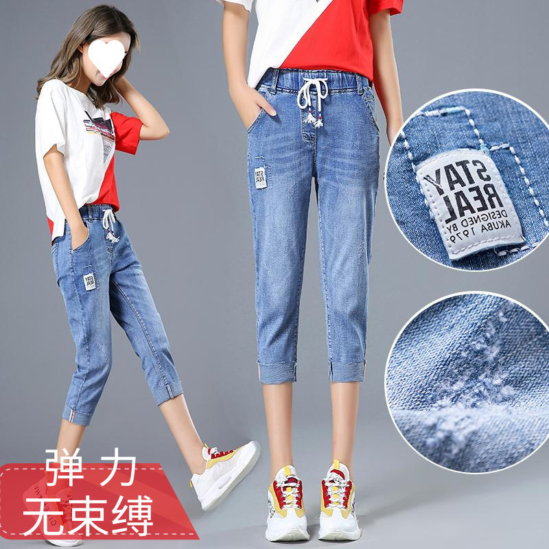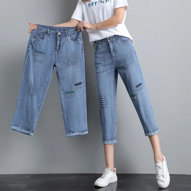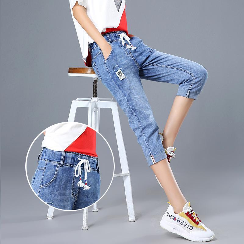 Джинсовые/хлопковые брюки, женские летние укороченные брюки с высокой талией, студенческие тонкие, большие размеры, утягивающие эластичные шаровары с широкими штанинами и эластичной резинкой на талии