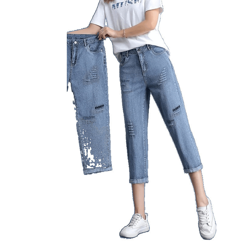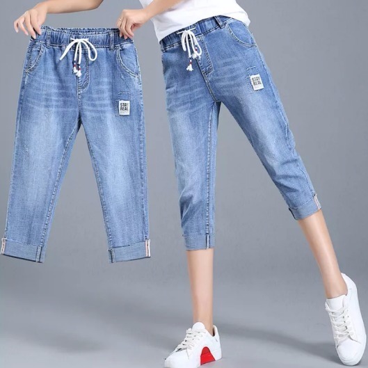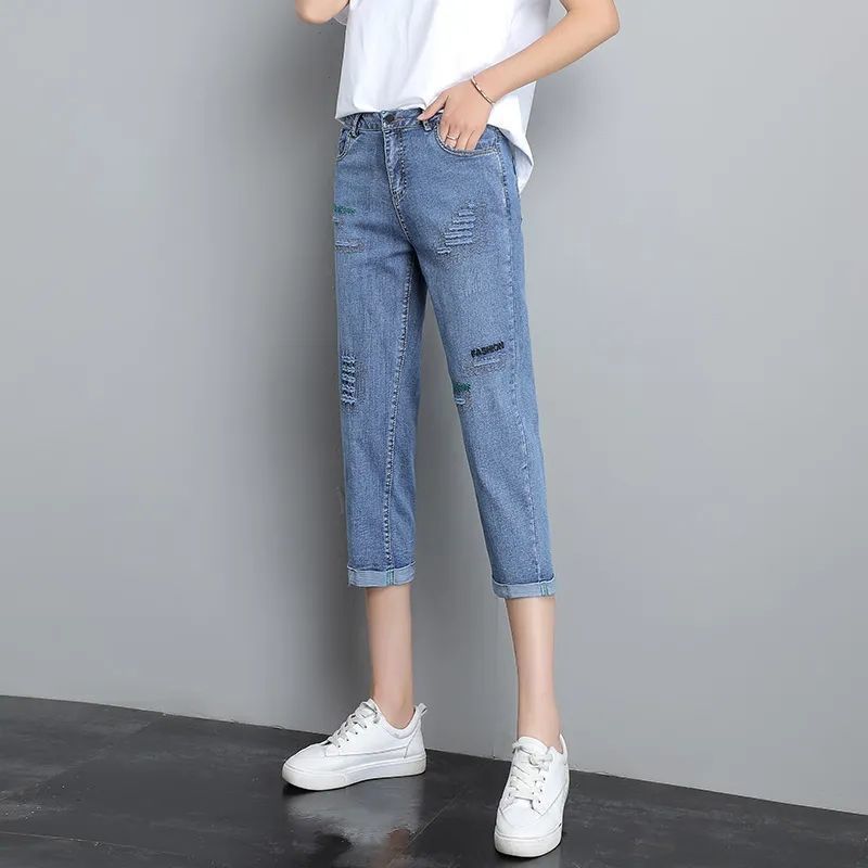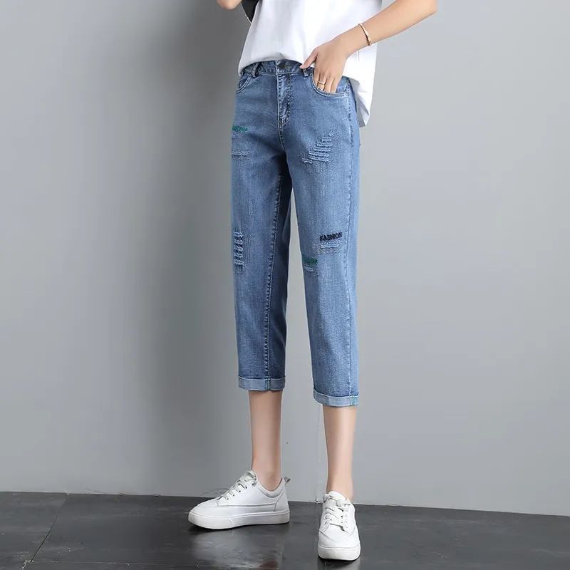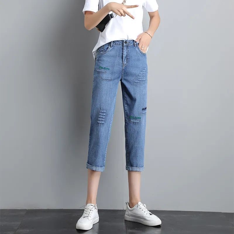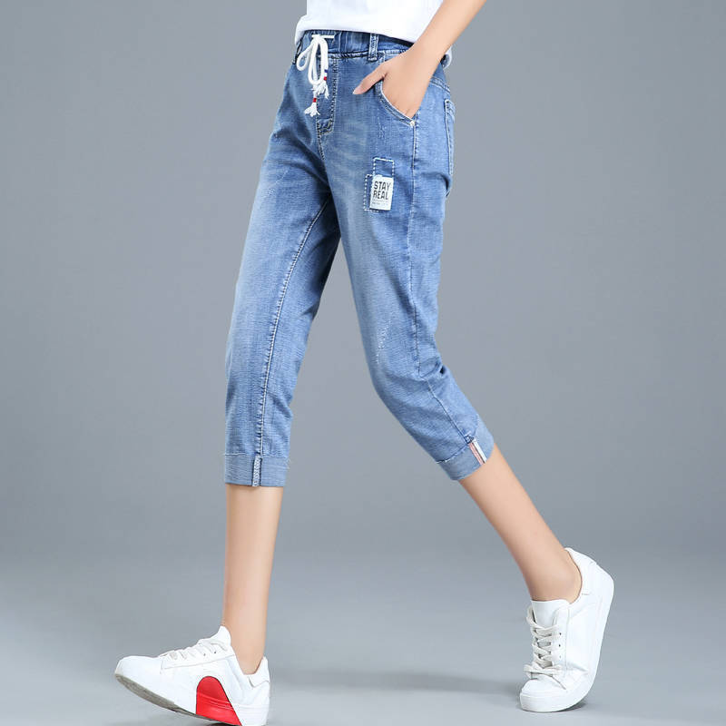 Джинсовые/хлопковые брюки, женские летние укороченные брюки с высокой талией, студенческие тонкие, большие размеры, утягивающие эластичные шаровары с широкими штанинами и эластичной резинкой на талии