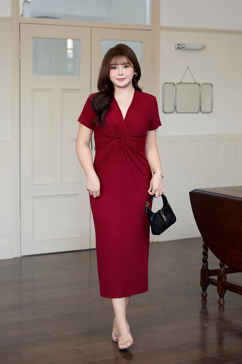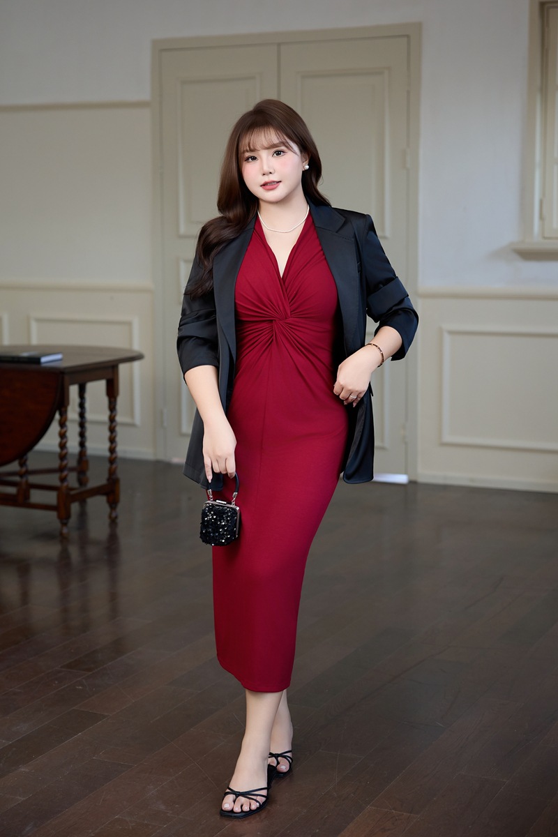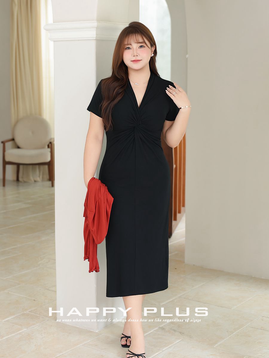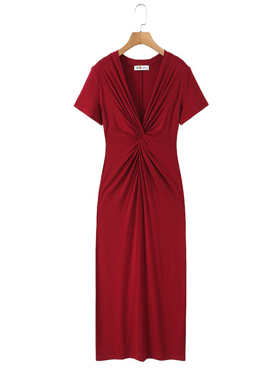 Красное платье Yujie с v-образным вырезом и разрезом на бедрах, с короткими рукавами, Runqi 9292, маленькое черное платье большого размера с вертикальным вырезом на талии