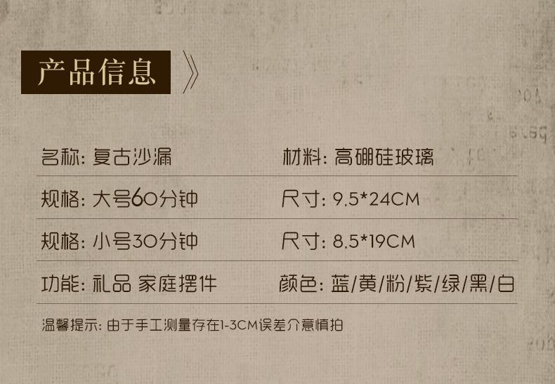 Труба желтого песка 15 минут; Труба Зеленый песок 15 минут; Мелкий розовый песок 15 минут; труба синий песок; Мелкий фиолетовый песок 15 минут; Мелкий черный песок 15 минут; Труба Белый песок 15 минут; Самостоятельно установленная песочная труба в стиле ретро; Средний желтый песок 30 минут; Средний зеленый песок 30 минут; Средний порошок песка 30 минут; Средний синий песок 30 минут; Средний фиолетовый песок 30 минут; Средний черный песок 30 минут; Средний белый песок 30 минут; Ретро самонабирающийся песок среднего размера; Большой желтый песок 45 минут; Большой зеленый песок 45 минут; Большой розовый песок 45 минут; Большой синий песок 45 минут; Большой фиолетовый песок 45 минут; Большой черный песок 45 минут; Большой белый песок 45 минут; Большой желтый песок 60 минут; Большой зеленый песок 60 минут; Большой розовый песок 60 минут; Большой синий песок, 60 минут — бесплатная гравировка; Большой фиолетовый песок 60 минут; Большой черный песок 60 минут; Большой белый песок 60 минут; Ретро самонабирающийся песок большого размера