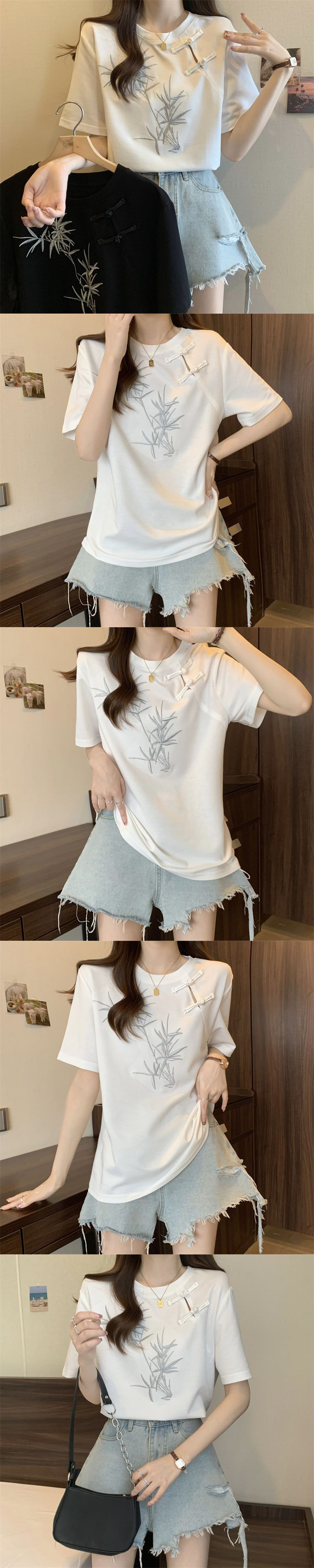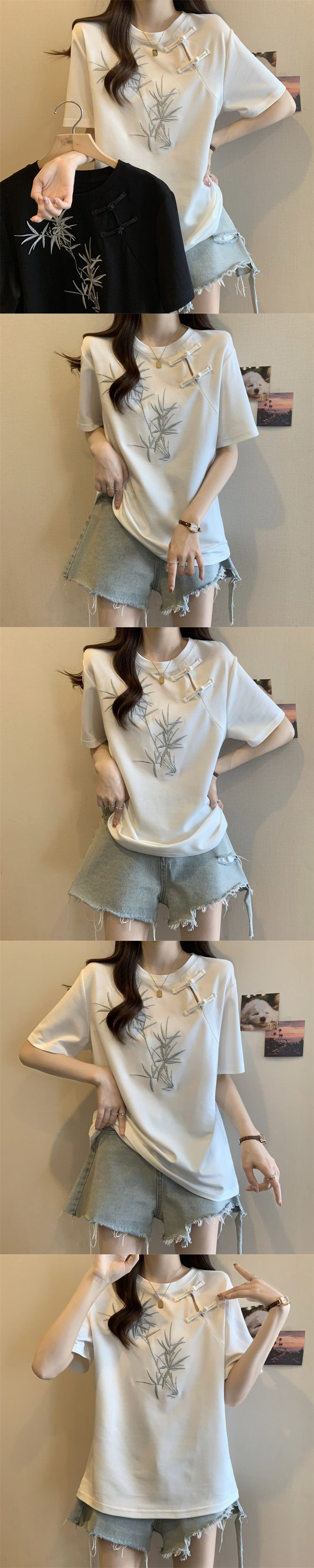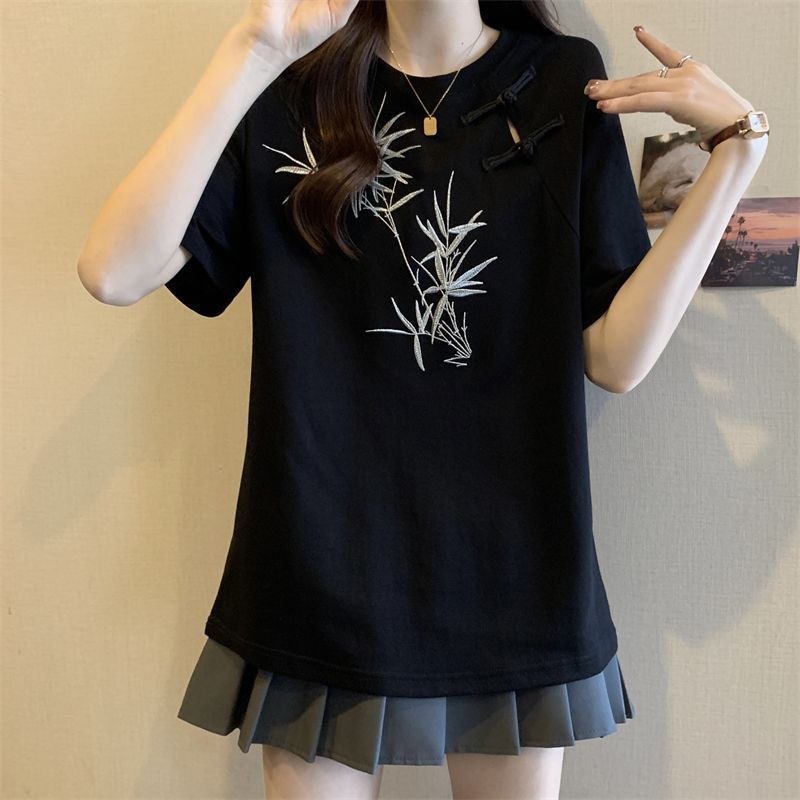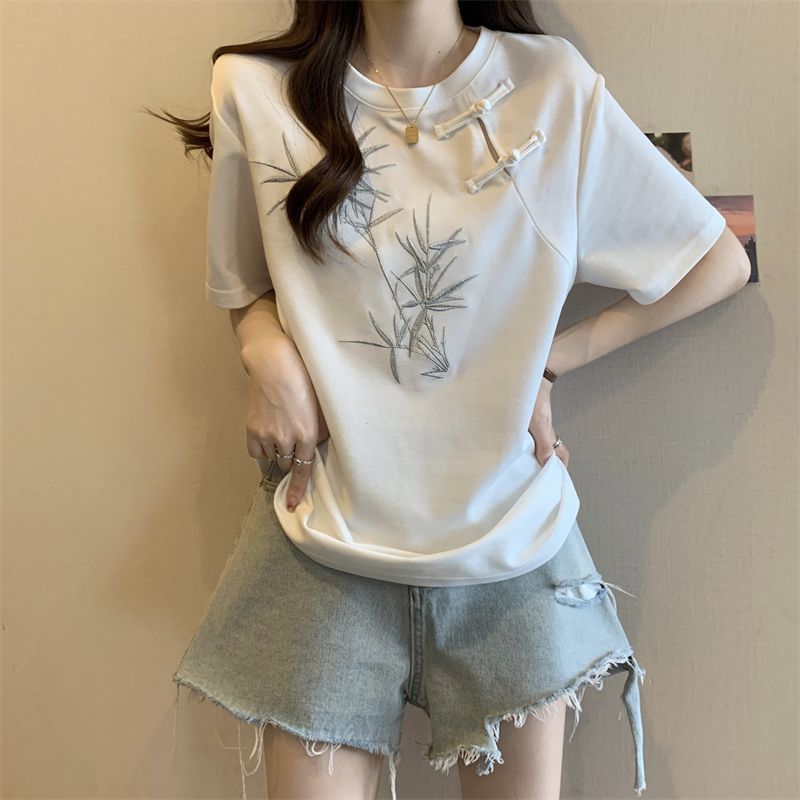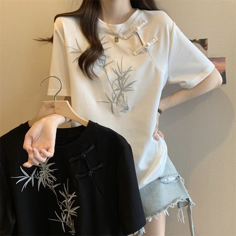 Новая женская рубашка с короткими рукавами в китайском стиле в национальном стиле с бамбуковой вышивкой и дисками, лето 2025, новый свободный утягивающий топ большого размера