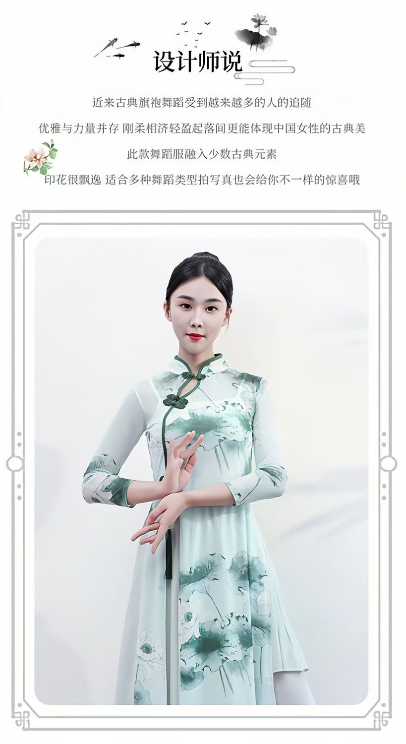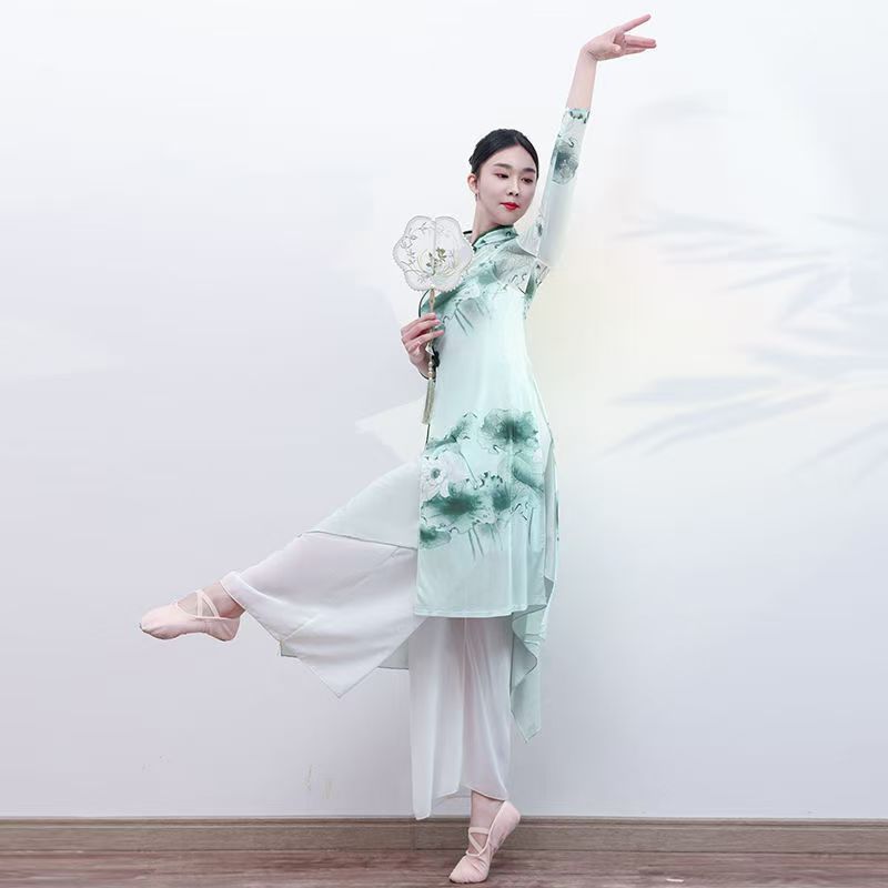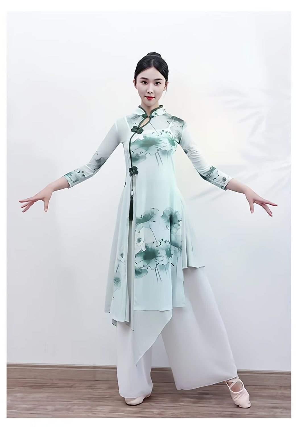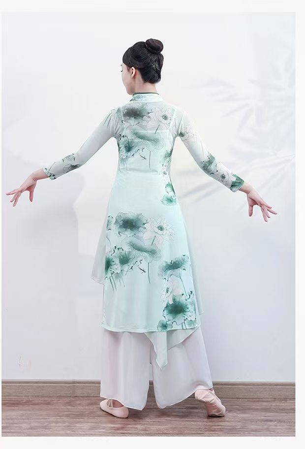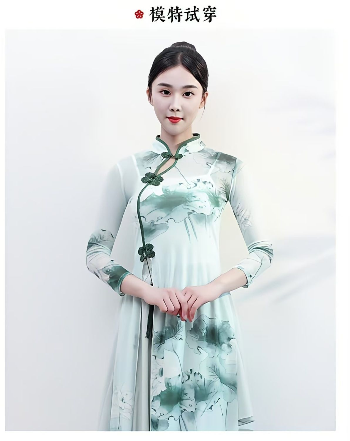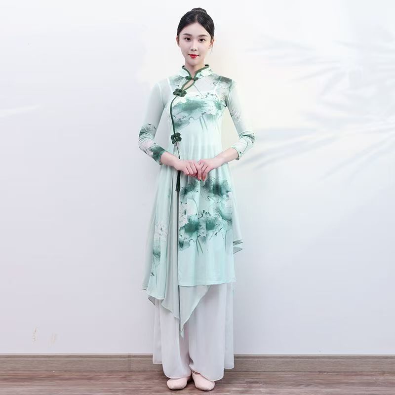 Новый классический танцевальный костюм, новый китайский шелковый чонсам с разрезом, эластичный струящийся китайский танцевальный костюм в китайском стиле.