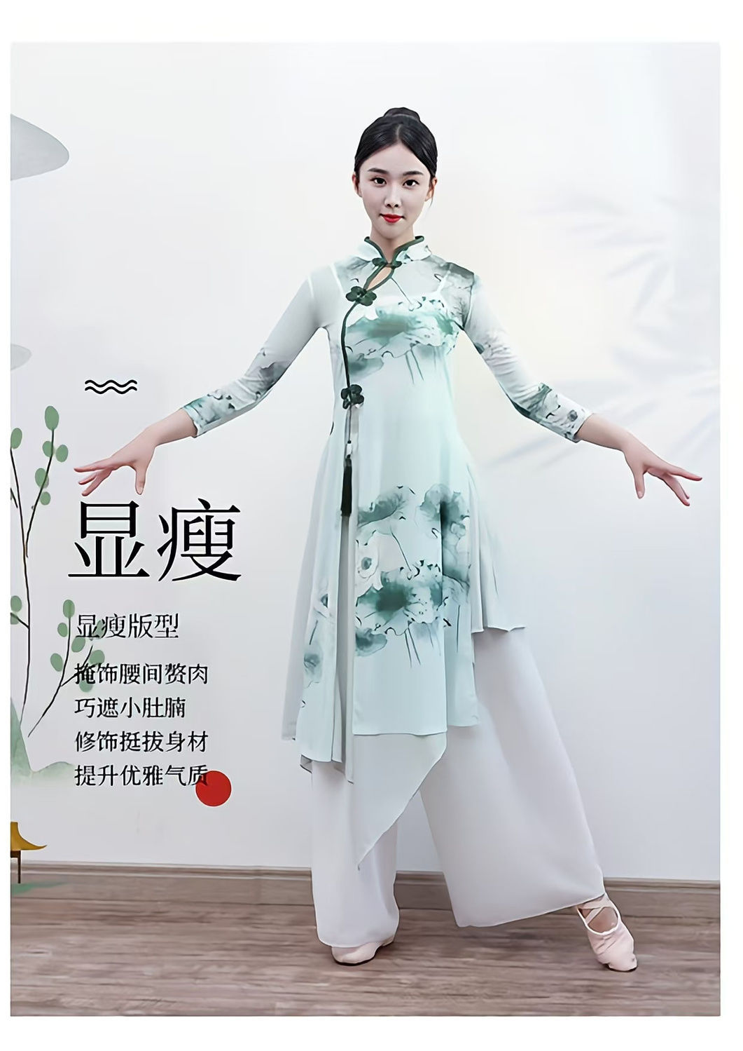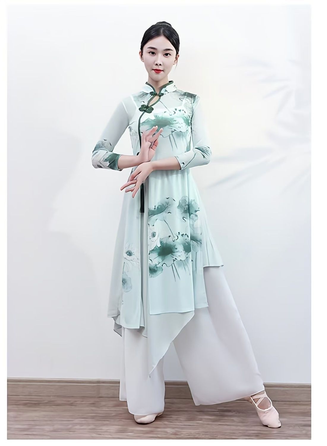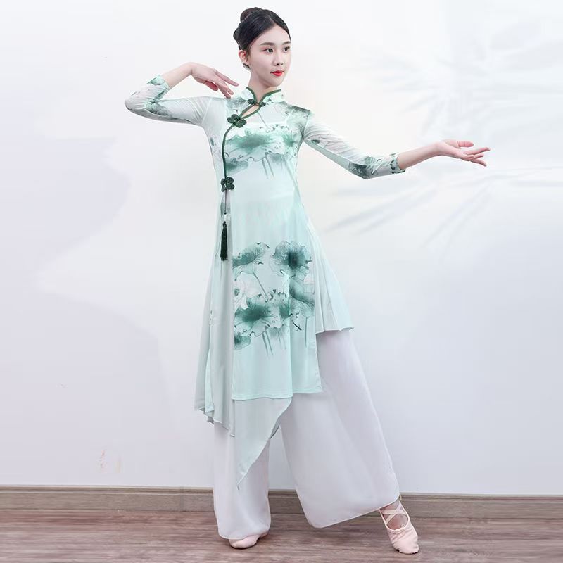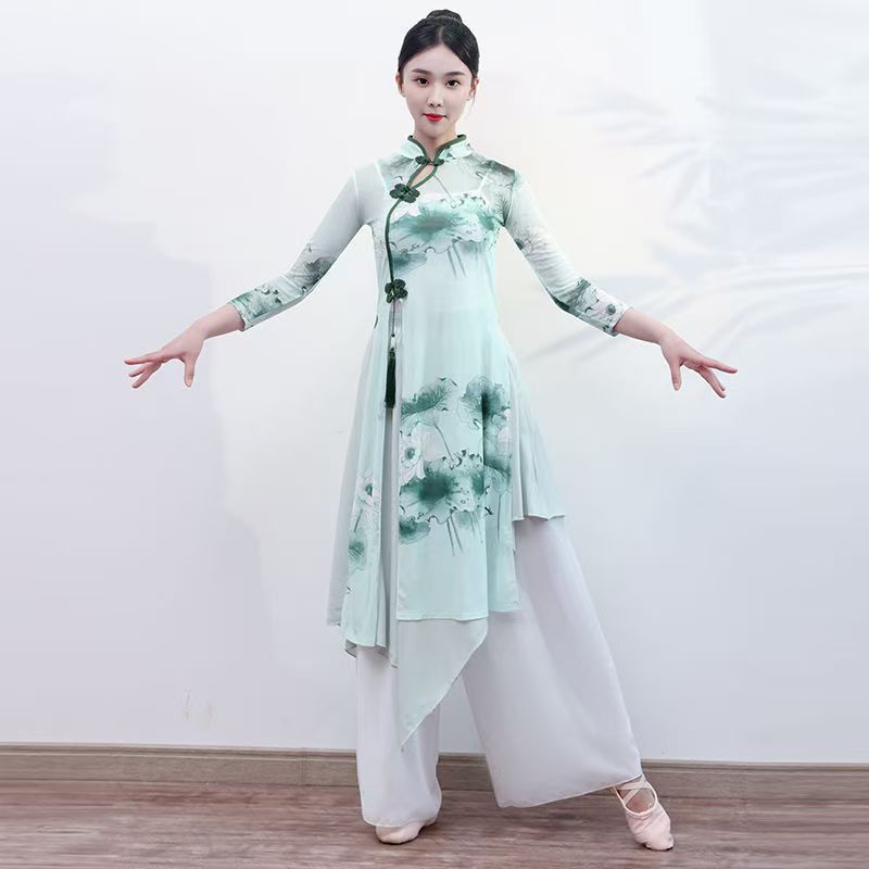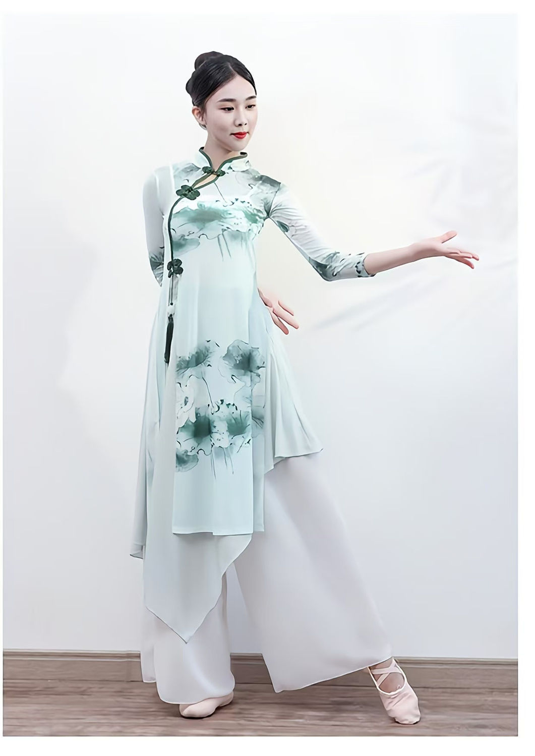 Новый классический танцевальный костюм, новый китайский шелковый чонсам с разрезом, эластичный струящийся китайский танцевальный костюм в китайском стиле.