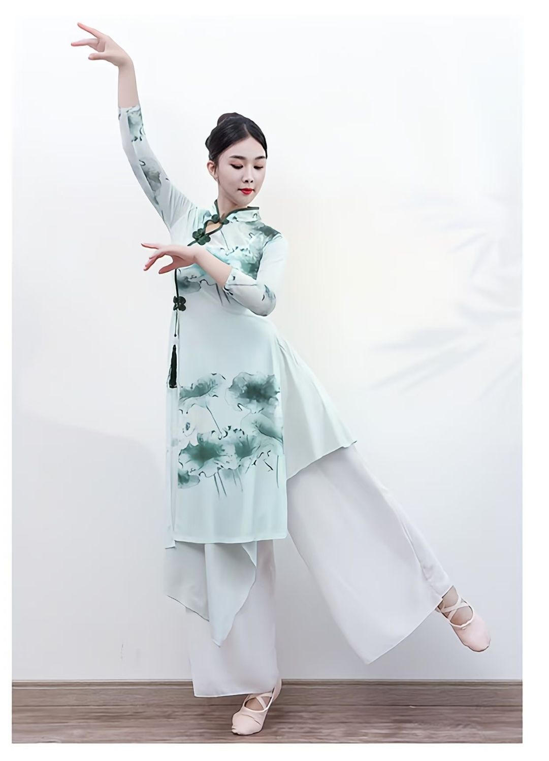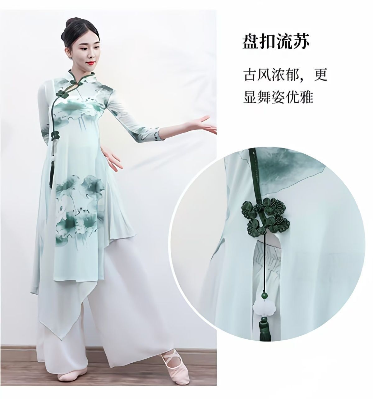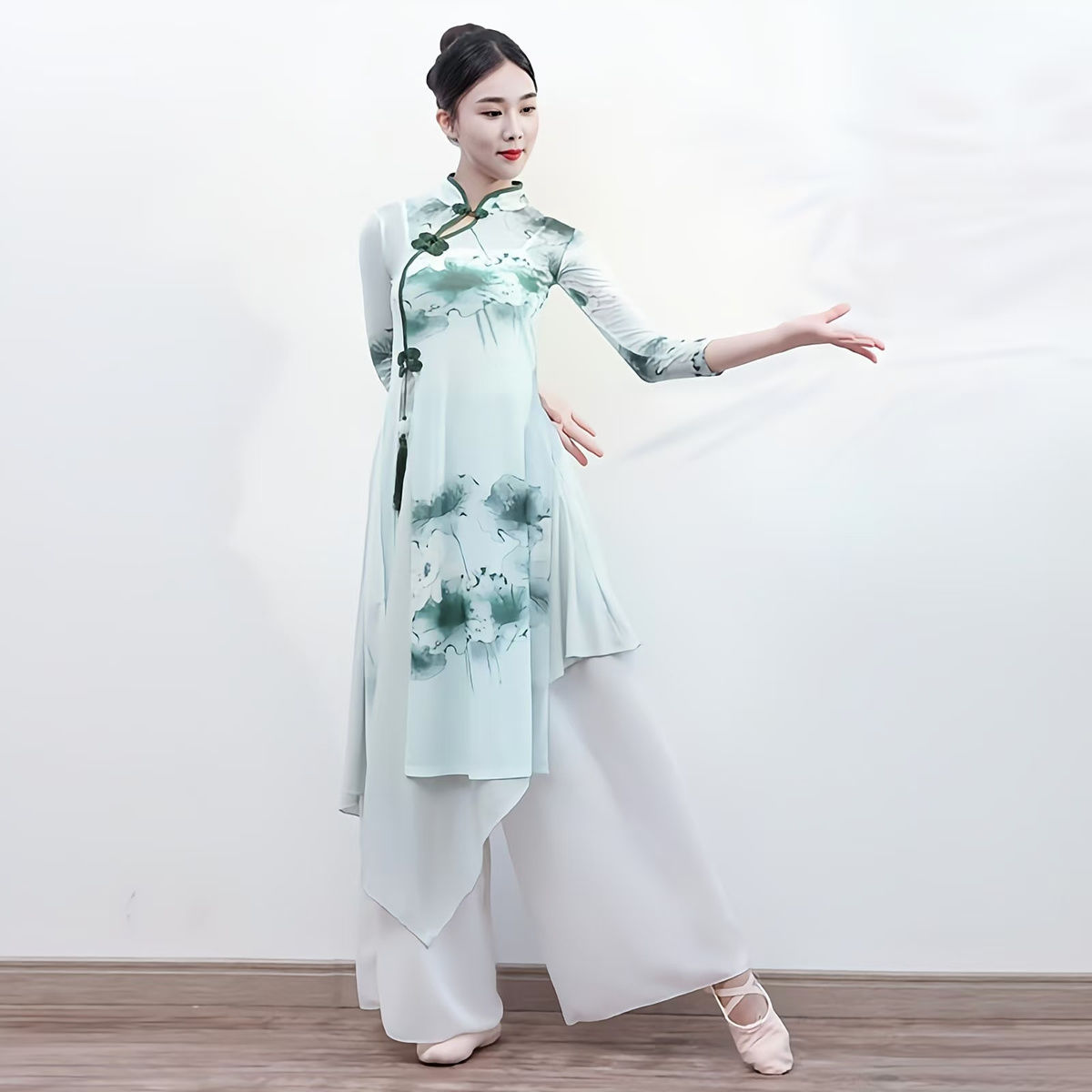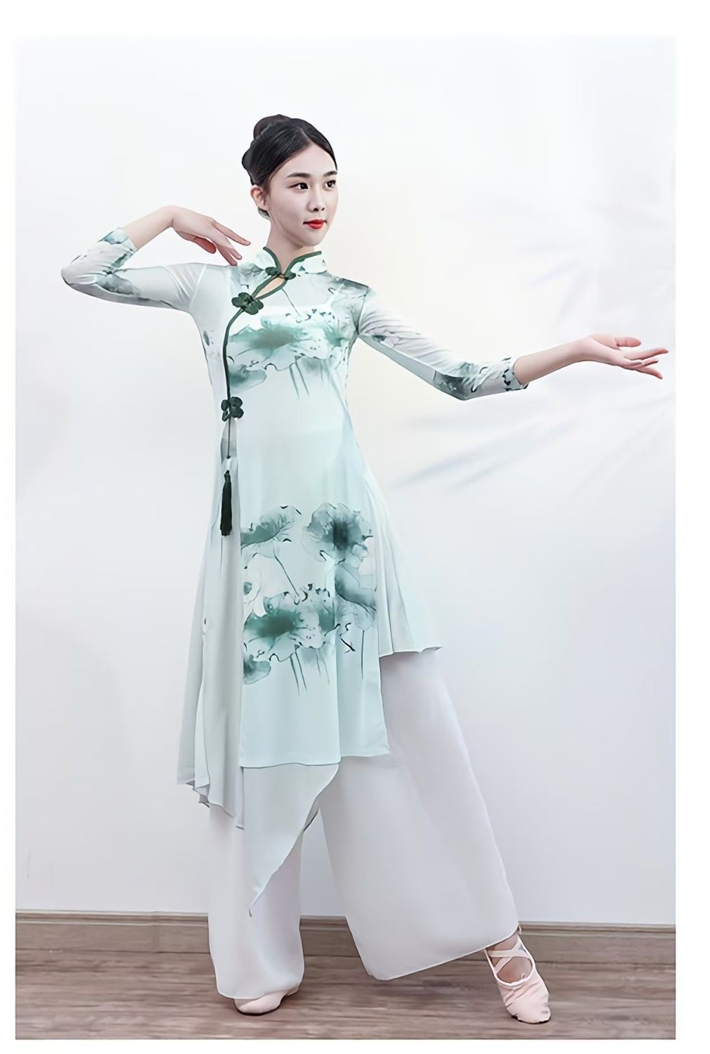 Новый классический танцевальный костюм, новый китайский шелковый чонсам с разрезом, эластичный струящийся китайский танцевальный костюм в китайском стиле.