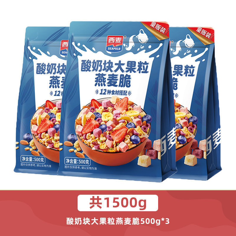 Йогурт кубиками крупные фруктовые гранулы овсяные хрустящие 500г; Кубики йогурта, крупные кусочки фруктов, овсяная хрустящая корочка 500 г*2; Кубики йогурта, крупные фруктовые гранулы и овсяная хрустящая хлопья 500 г*3