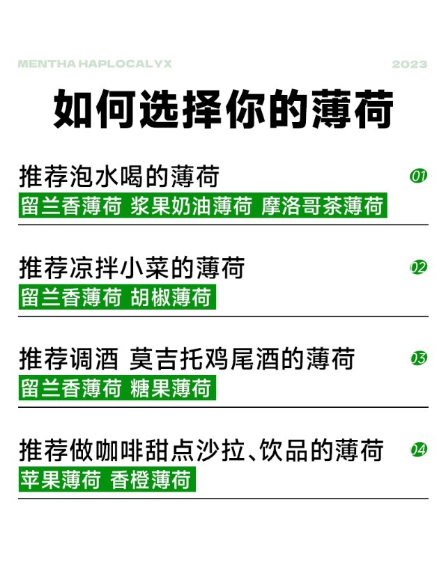 Зеленая мята*1 горшок самой продаваемой сорта [можно есть напрямую]; Candy Mint*1 горшок со сладким и освежающим вкусом [хорошо взять с собой горшечные растения]; Ананасовая мята*1 баночка для повышения аппетита [не живая добавка]; Зимняя мята*1 горшок для освежения ума [хорошо взять с собой горшечные растения]; Лаванда и мята*1 горшок мягкого аромата [можно взять с собой горшечные растения]; Вьетнамская мята*1 горшок с насыщенным ароматом [лучше взять с собой горшечные растения]; Pule Mint*1 горшок обладает хорошим репеллентным эффектом от комаров [лучше брать с собой горшечные растения]; Шоколадная мята*1 горшок со слабым вкусом какао [хорошо взять с собой горшечные растения]; Корсиканская мята*1 горшок декоративной мяты [горшечные растения лучше принести]; Растение в горшке земляной мяты*1 горшок для приготовления чая для облегчения жары [лучше взять с собой растения в горшках]; Марокканский чай с мятой*1 горшок освежающего аромата [лучше взять с собой горшечные растения]; Berry Cream Mint*1 горшок со светлым молочным вкусом [можно взять с собой горшечные растения]; Высококачественные растения розмарина в горшках обычно используются в западной кухне (их можно есть напрямую).; Яблочная мята*1 горшок аромата яблока [можно есть напрямую]; Перечная мята*1 чайник чая очень вкусен [можно есть напрямую]; Банановая мята*1 горшок с густыми и липкими листьями [можно есть напрямую]; Мятный шампанский*1 горшок со вкусом шампанского [можно есть напрямую]; Клубника Мята*1 баночка со слабым клубничным вкусом [можно есть напрямую]; Британский мятник*1 горшок имеет освежающую верхнюю ноту и согревающую базовую ноту [можно есть напрямую]; Римская мятная*1 горшок освежает и освежает [можно есть напрямую]; Тайская мята*1 горшок свежая и вкусная [можно есть напрямую]; Кельнская мята*1 баночка аромата грейпфрута [можно есть напрямую]; Мятная монета «Зеленый лист»*1 горшок подвесной мяты [можно есть напрямую]; Кошачья мята*1 горшок любимой кошачьей мяты [кошки любят есть]; Scotch Mint*1 горшок крупной рассады будет более пышным [легко выращивать и легко жить]