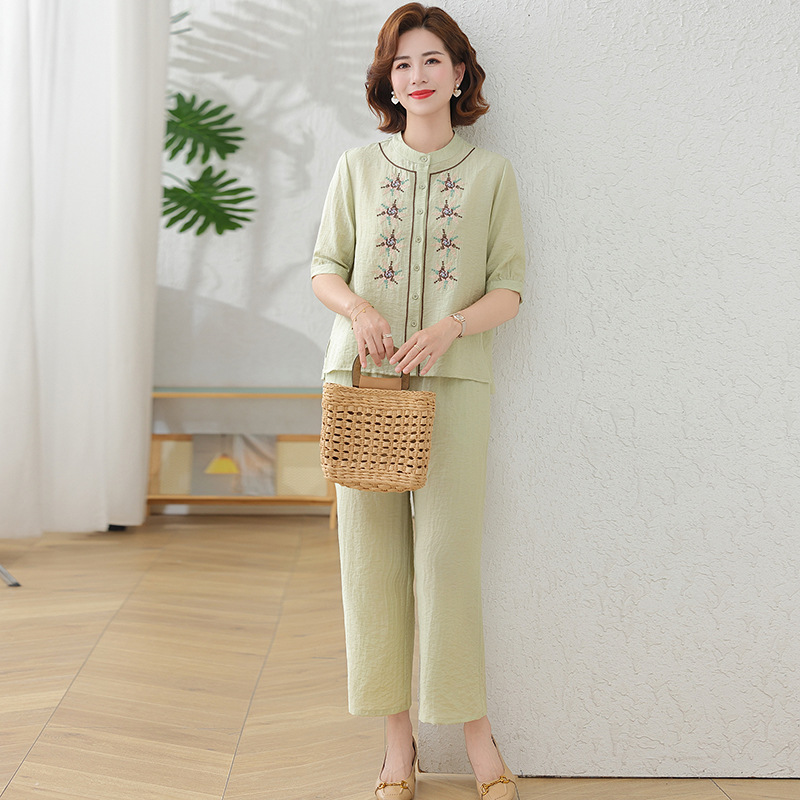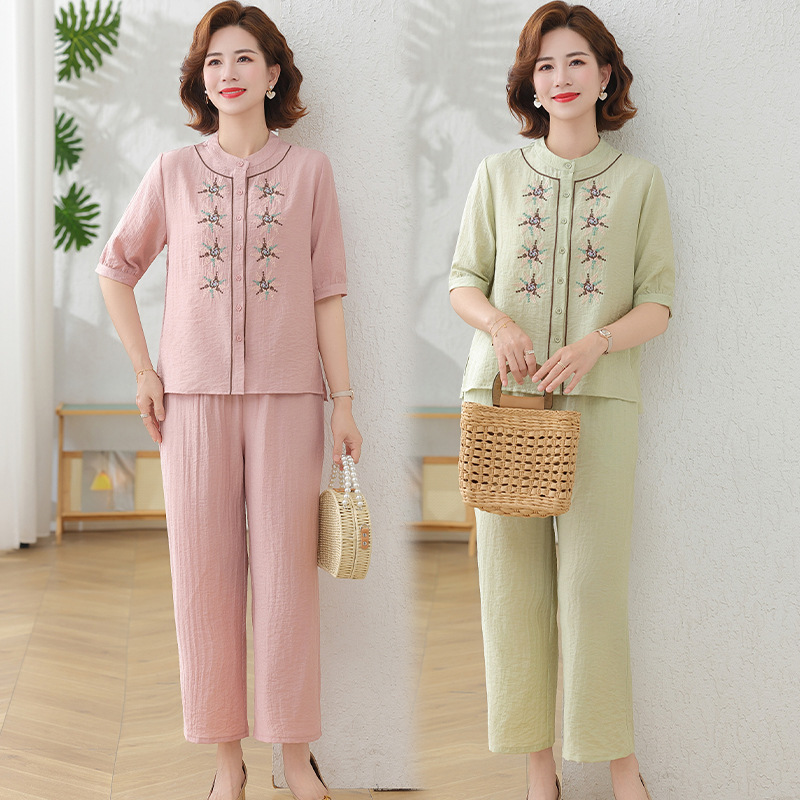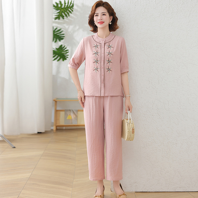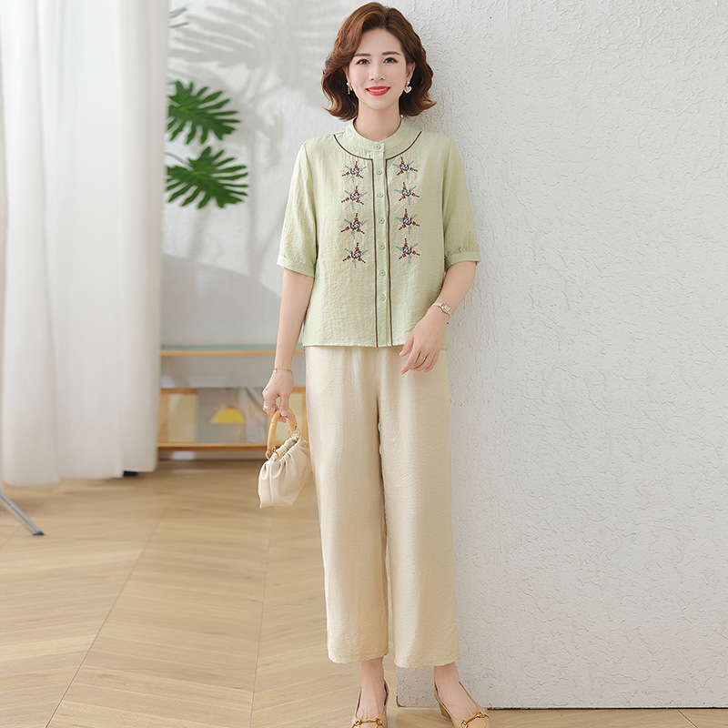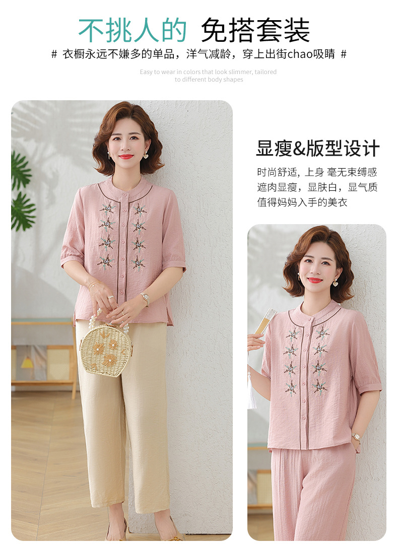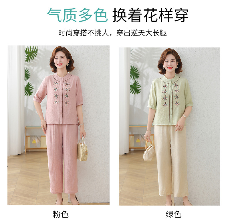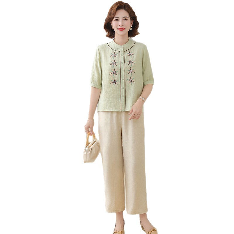Новый летний комплект из двух предметов для мамы для людей среднего и пожилого возраста, широкие брюки, маленькие рубашки, модный повседневный облегающий костюм.