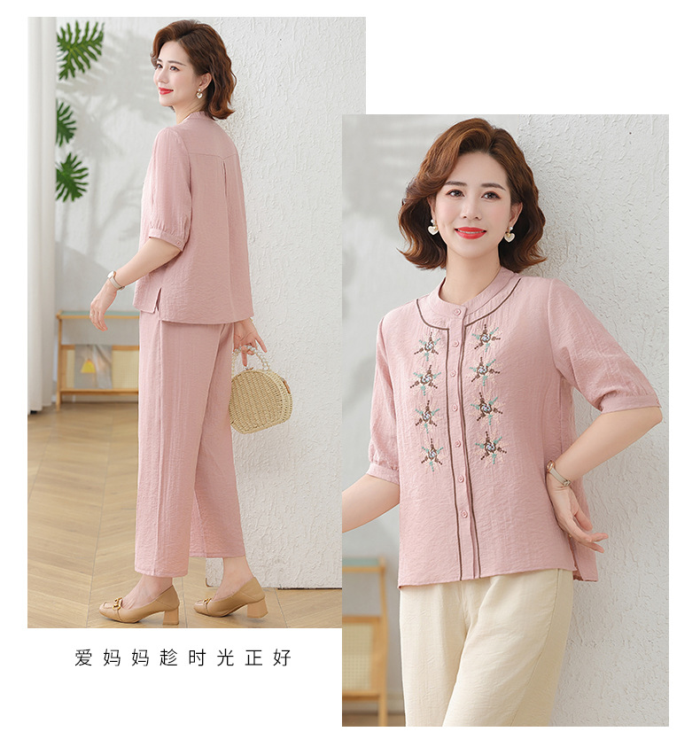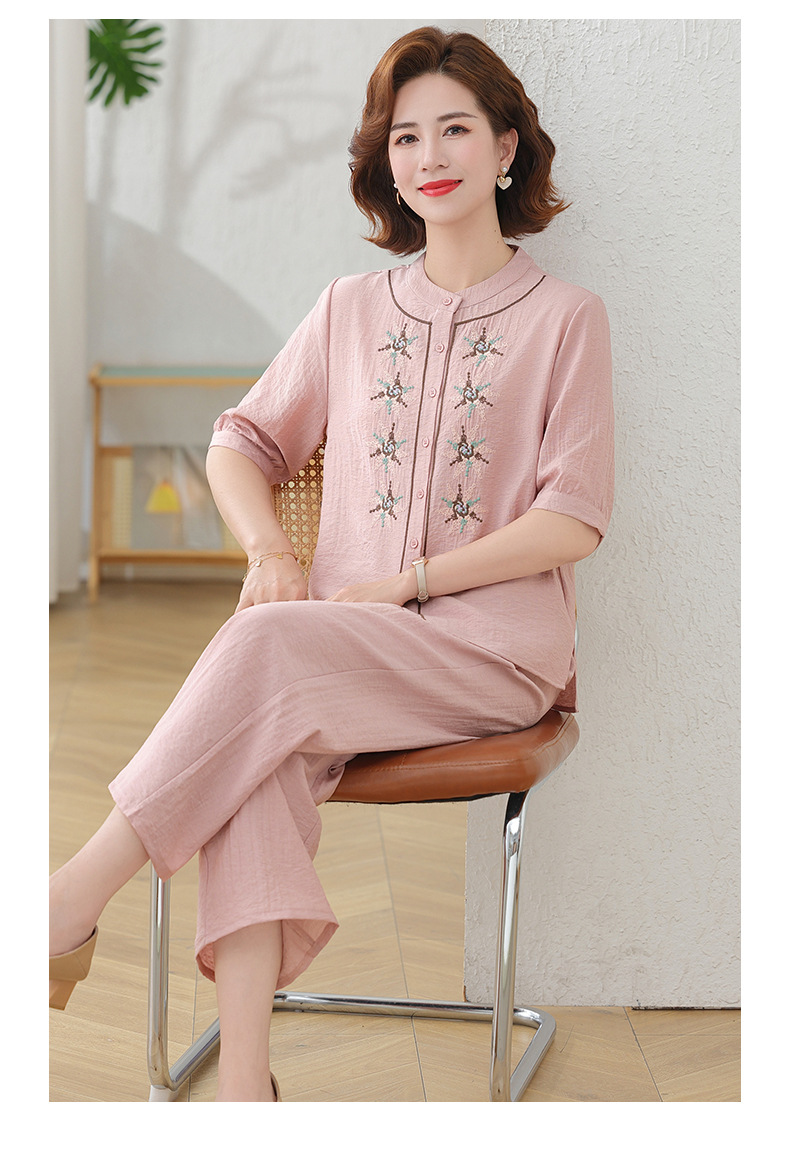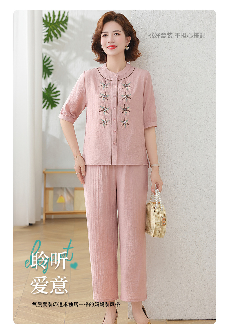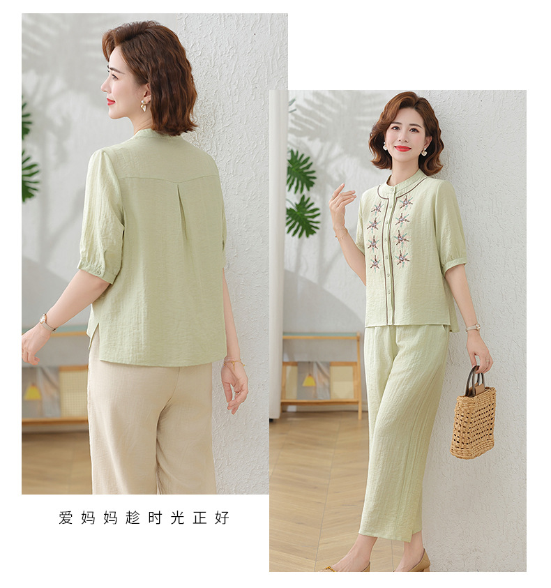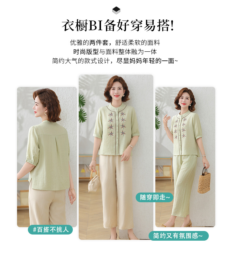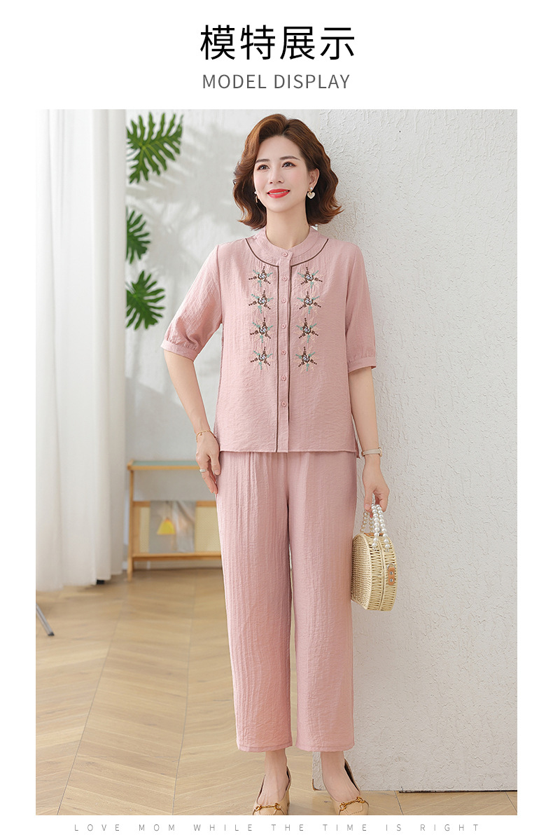 Новый летний комплект из двух предметов для мамы для людей среднего и пожилого возраста, широкие брюки, маленькие рубашки, модный повседневный облегающий костюм.