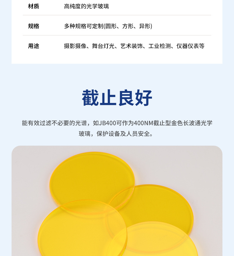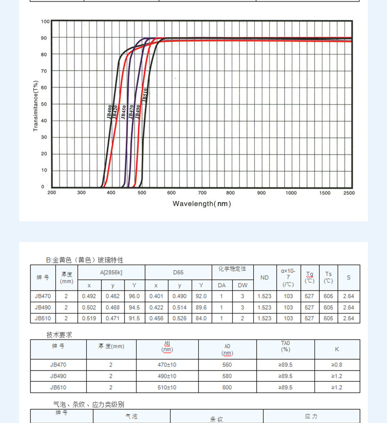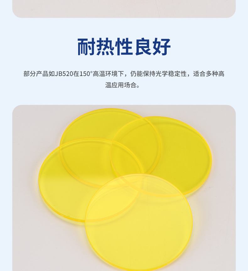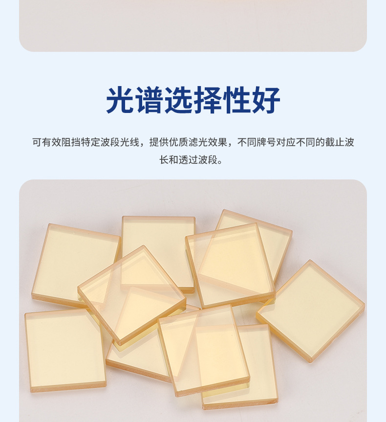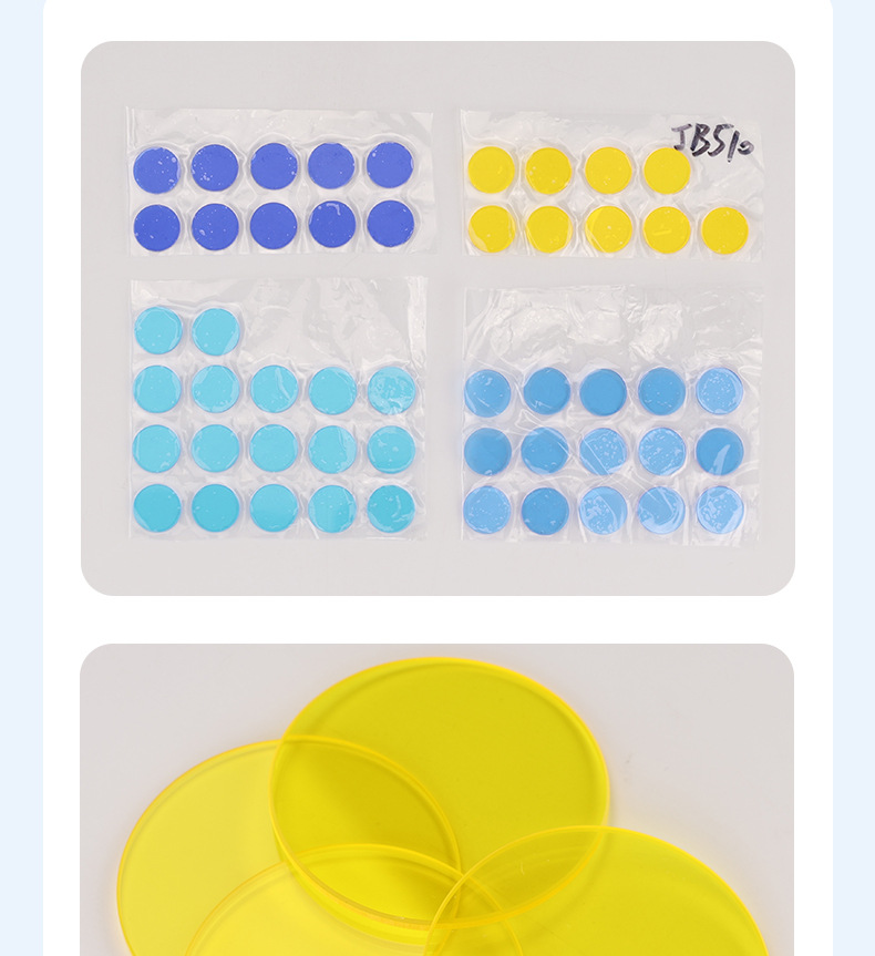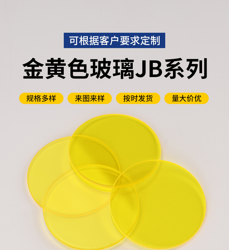 Производитель поставляет золотисто-желтые стеклянные оптические линзы JB490, цветные фильтры, цветные фильтры с функцией отсечки света и трансмиссивные фильтры.