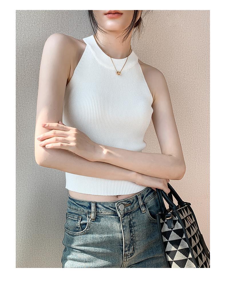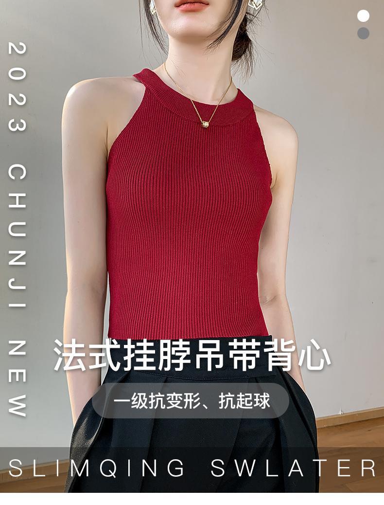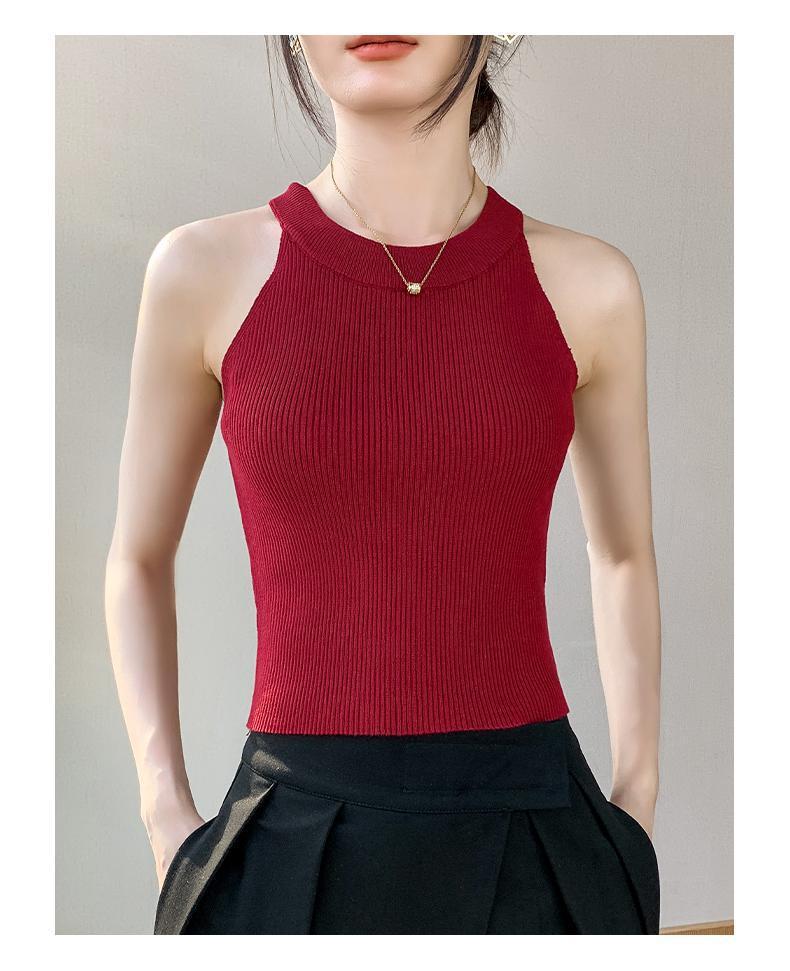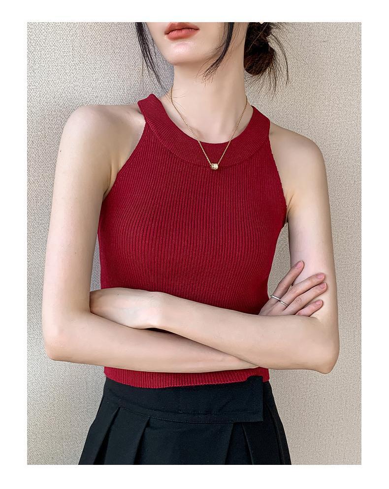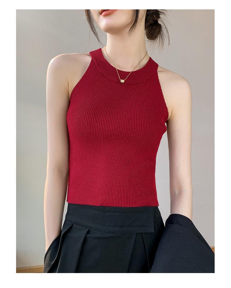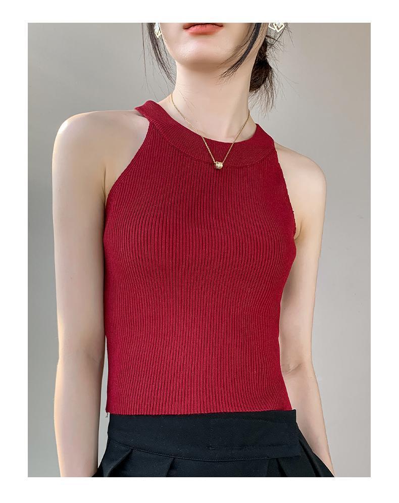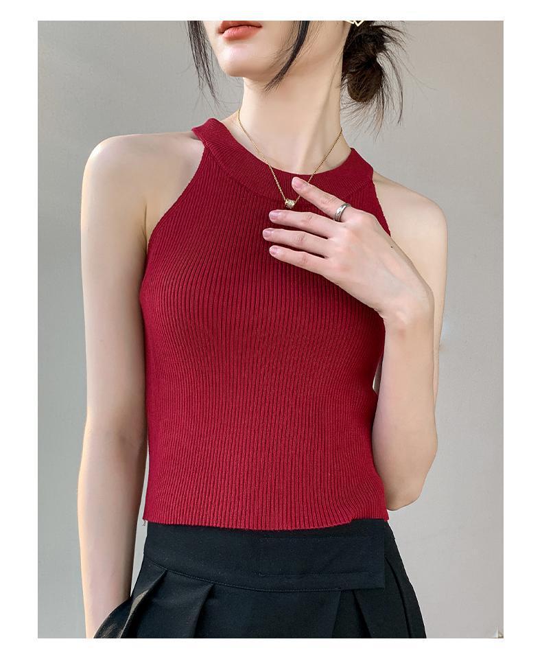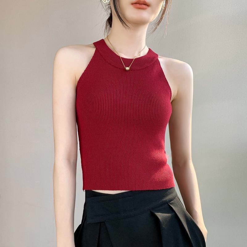 Женский топ из ледяного шелка, лето 2025, французский халтер, без рукавов, короткий, ретро, красный, трикотажный