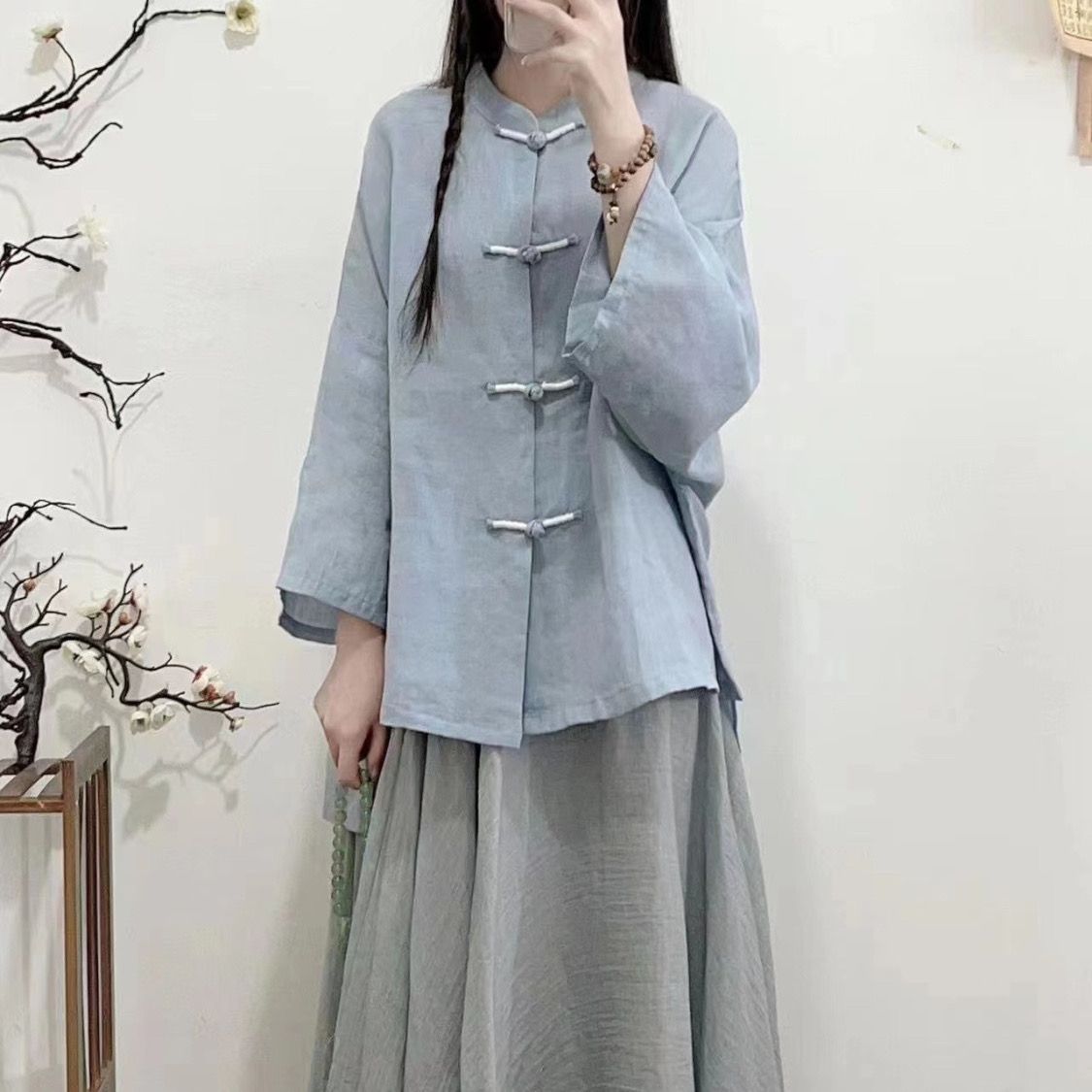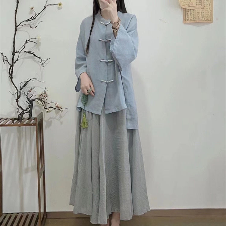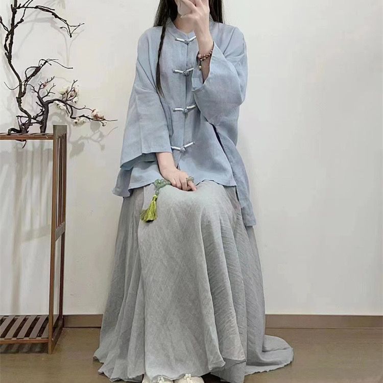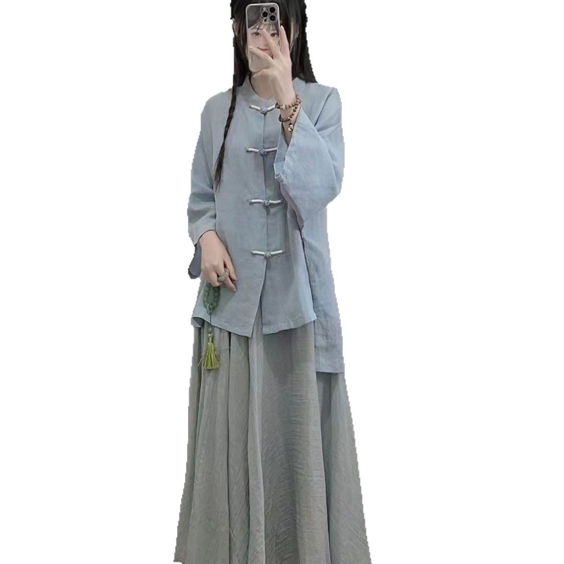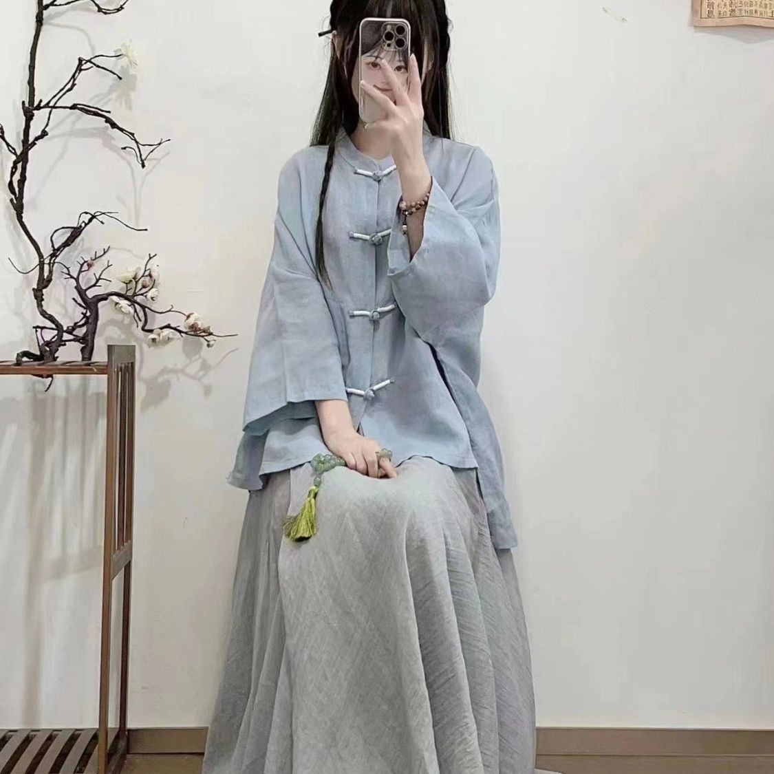 Новая свободная рубашка с воротником-стойкой в китайском стиле дзен, костюм для чайного искусства в древнем стиле, нежный дождевой костюм Цзяннань, юбка в крутом стиле Республики Китай