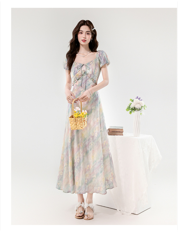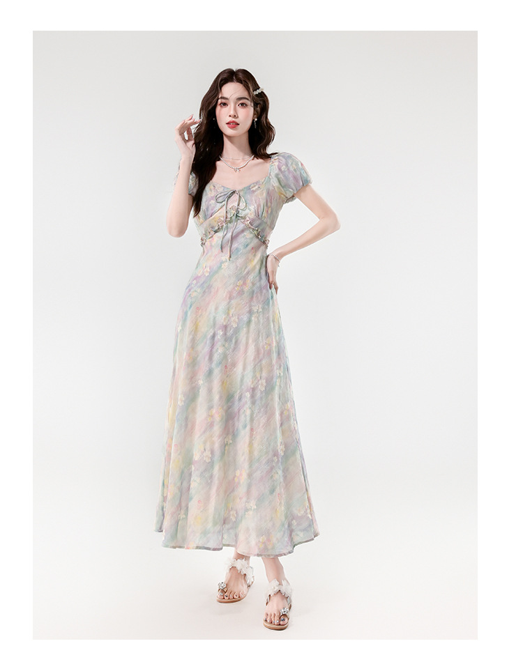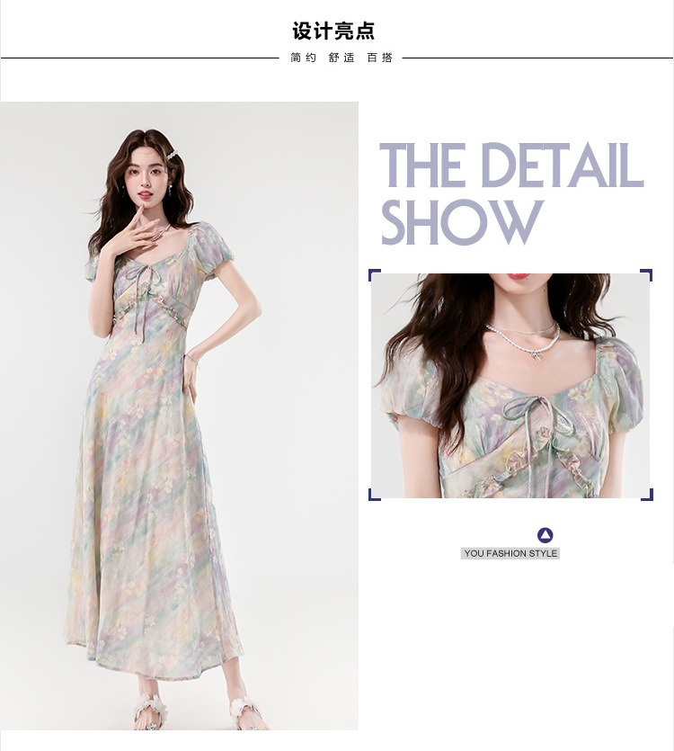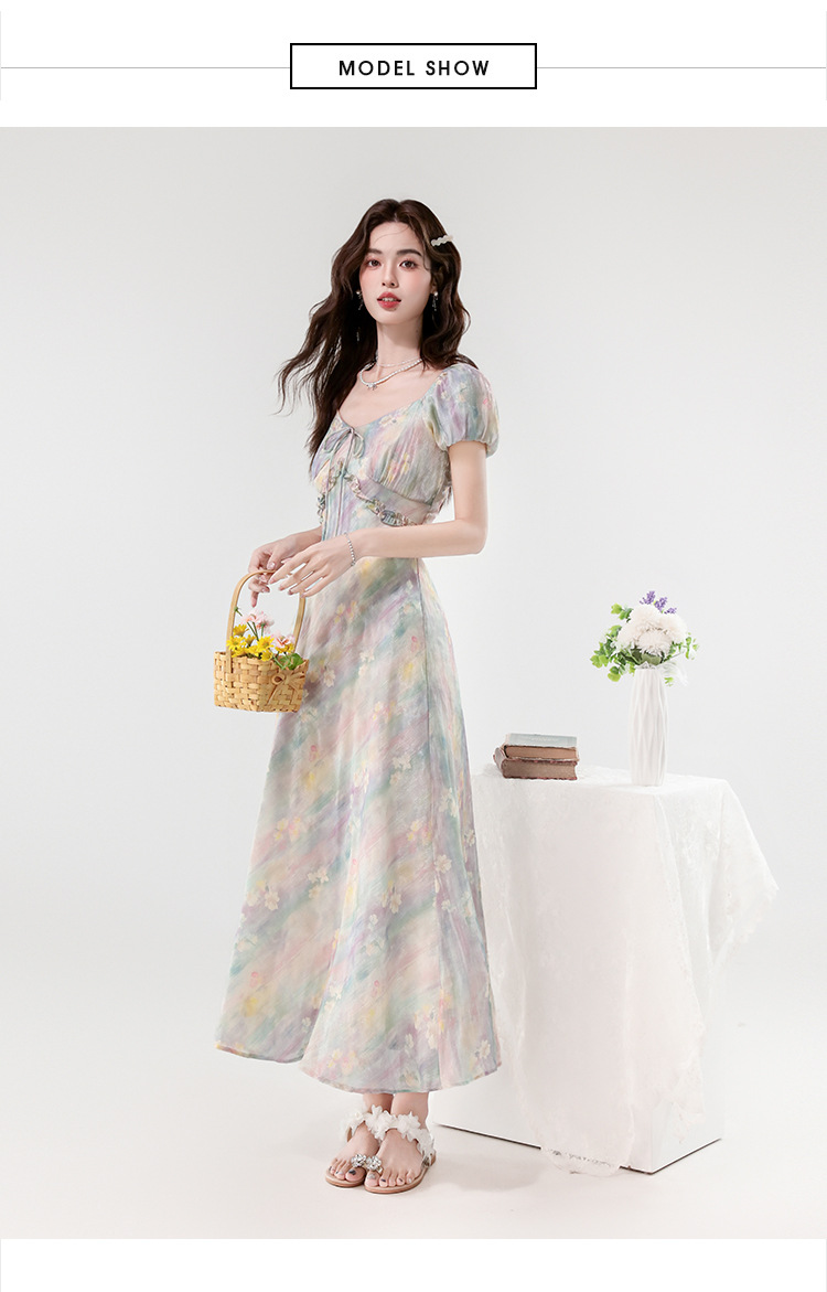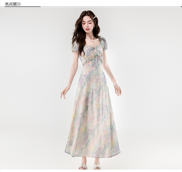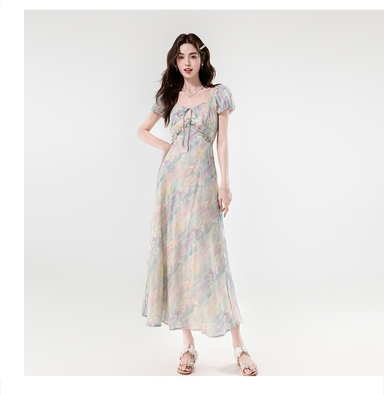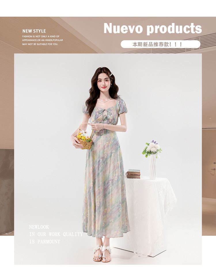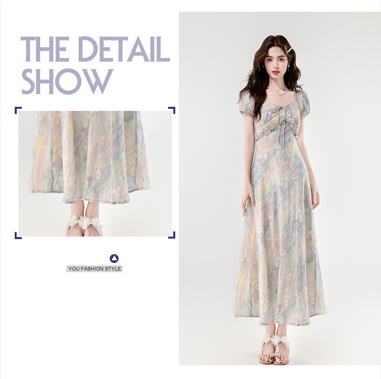 Фактический снимок нового летнего платья 2025 года: французское элегантное платье с V-образным вырезом, фиолетовое, романтичное, с цветочным принтом, длинное и стройнящее.