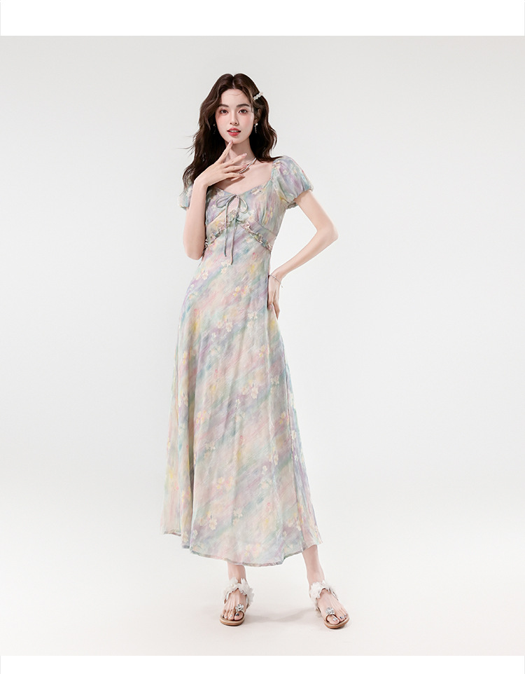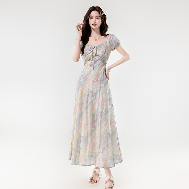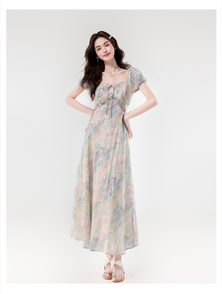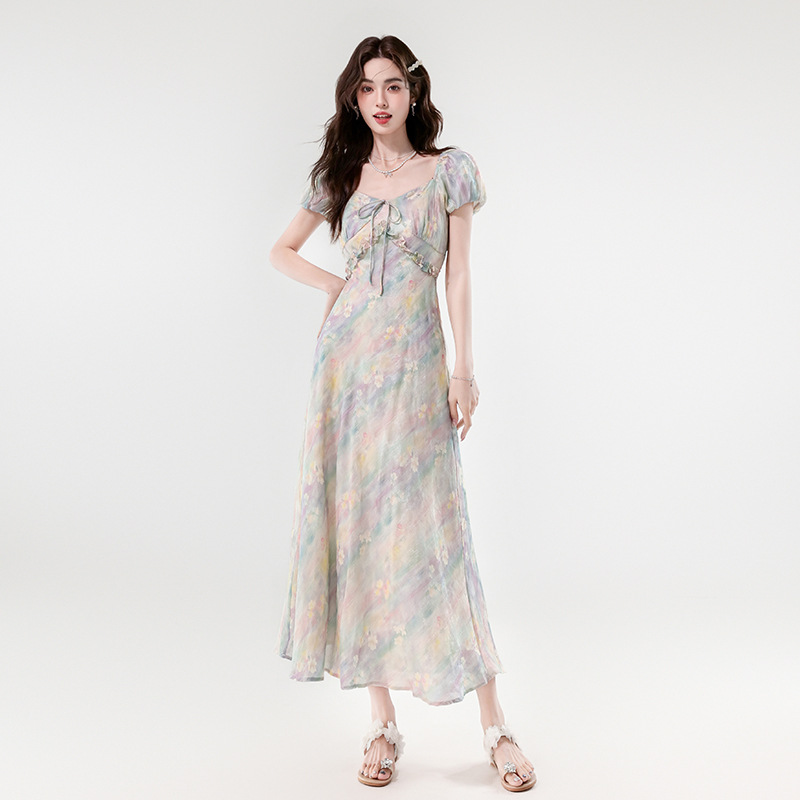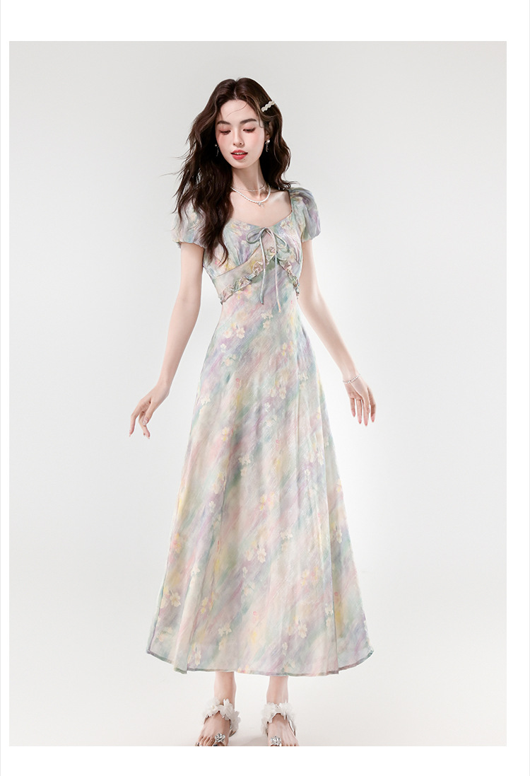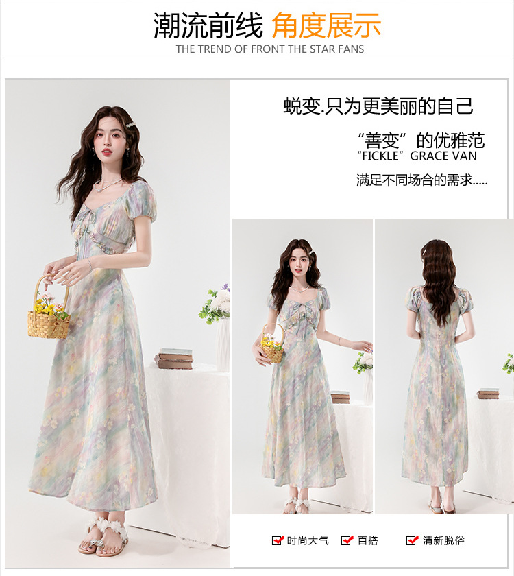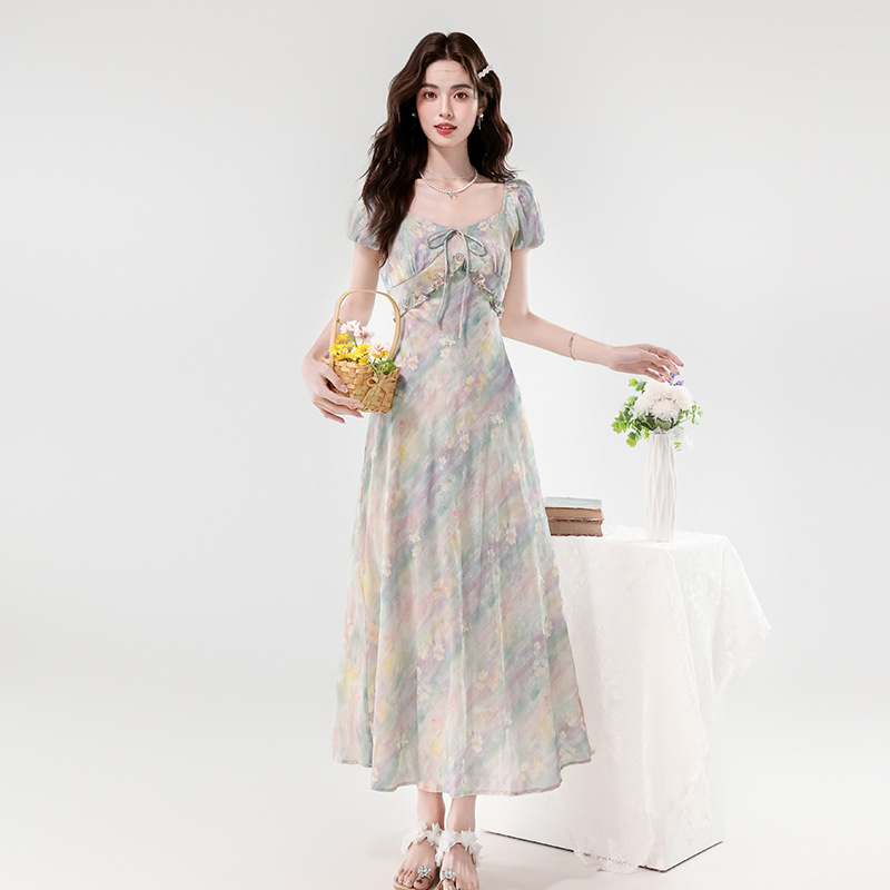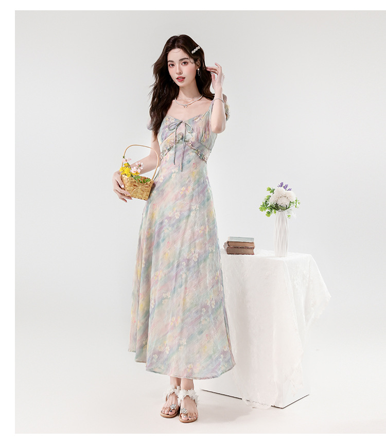 Фактический снимок нового летнего платья 2025 года: французское элегантное платье с V-образным вырезом, фиолетовое, романтичное, с цветочным принтом, длинное и стройнящее.