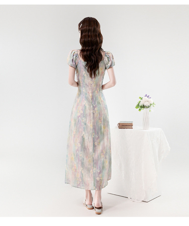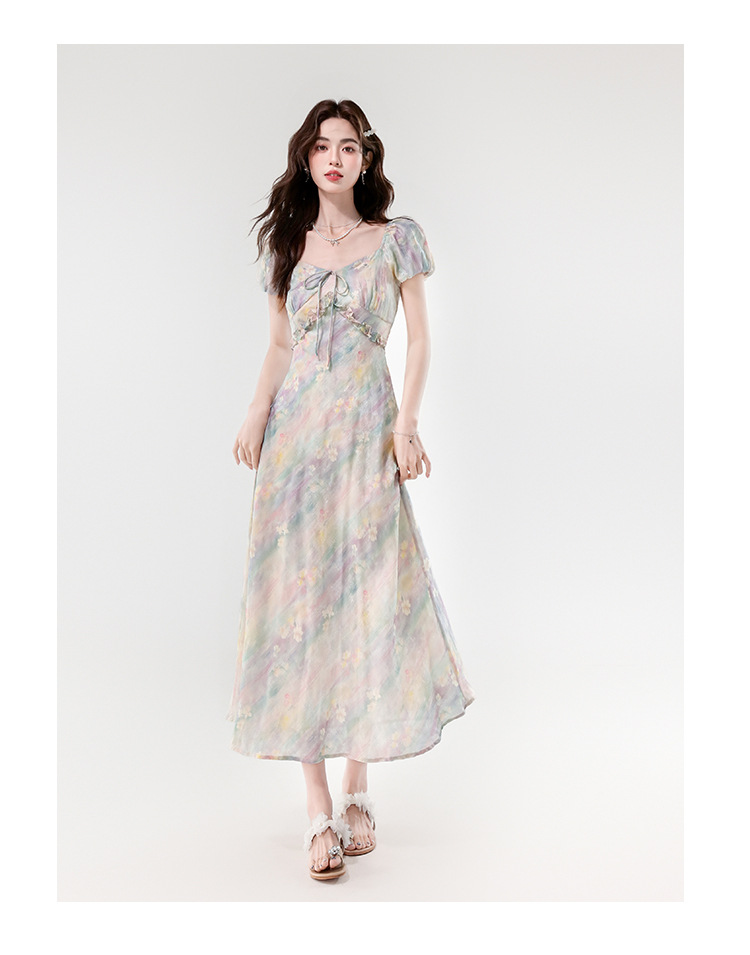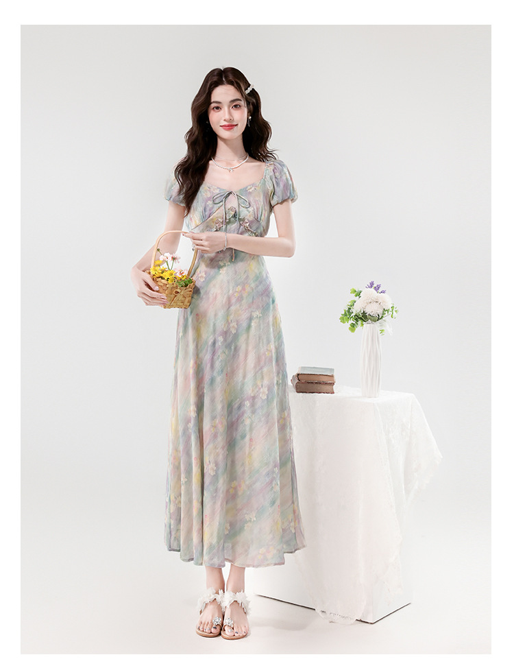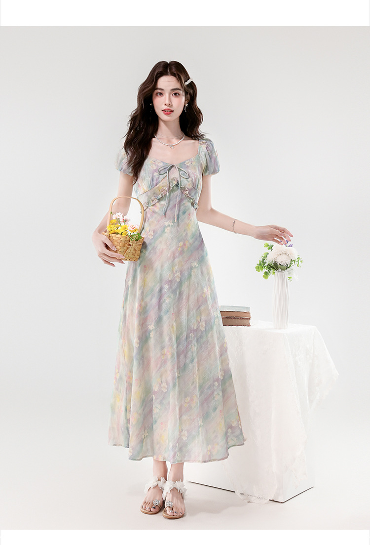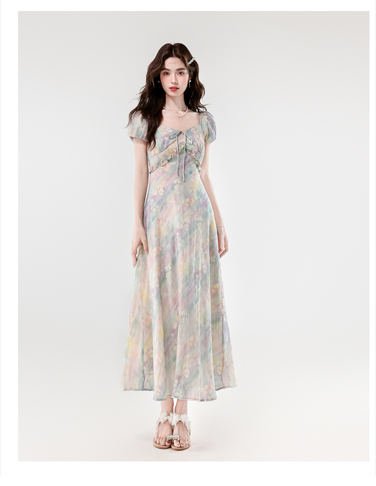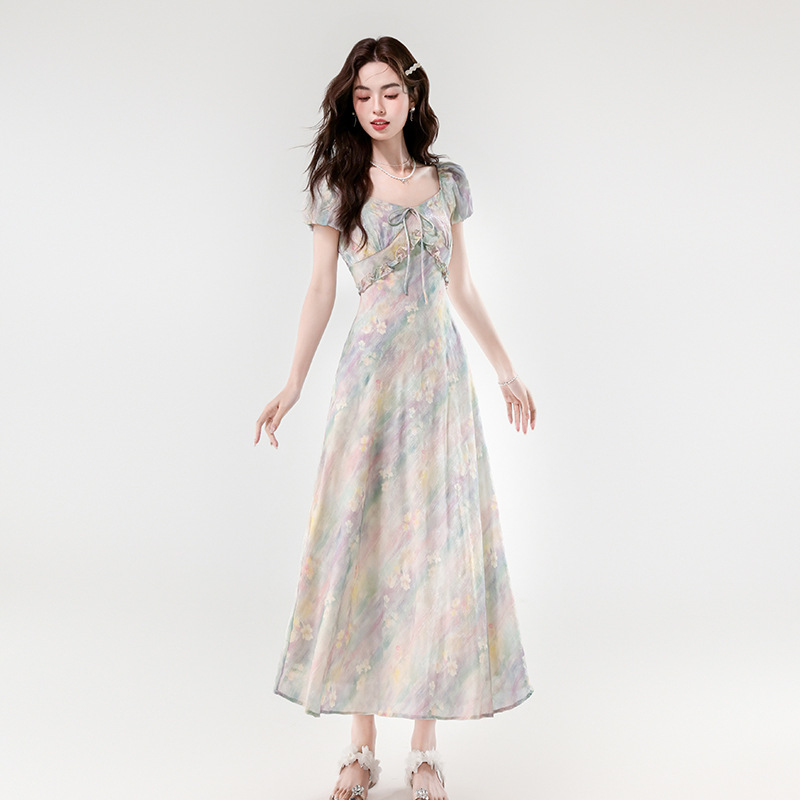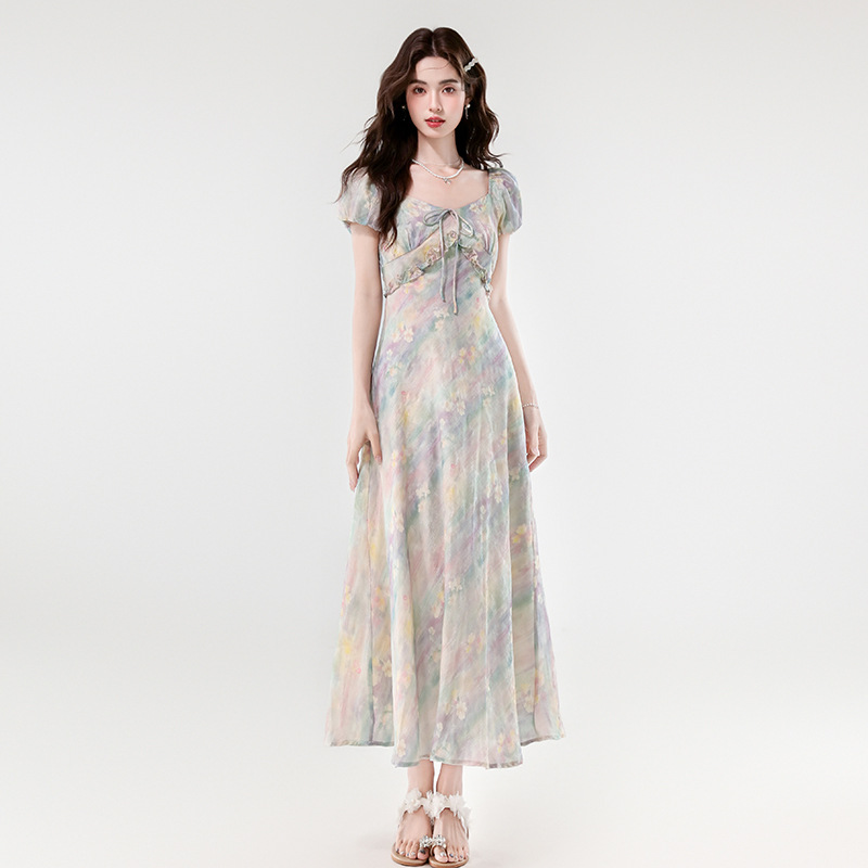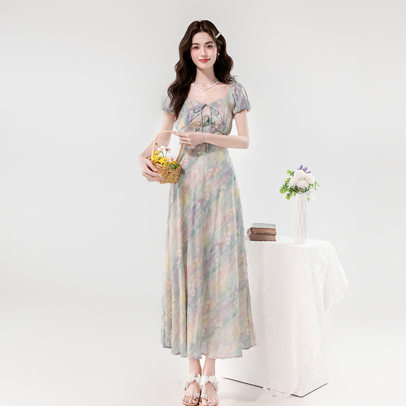 Фактический снимок нового летнего платья 2025 года: французское элегантное платье с V-образным вырезом, фиолетовое, романтичное, с цветочным принтом, длинное и стройнящее.