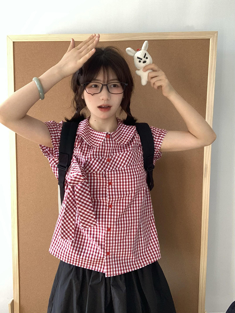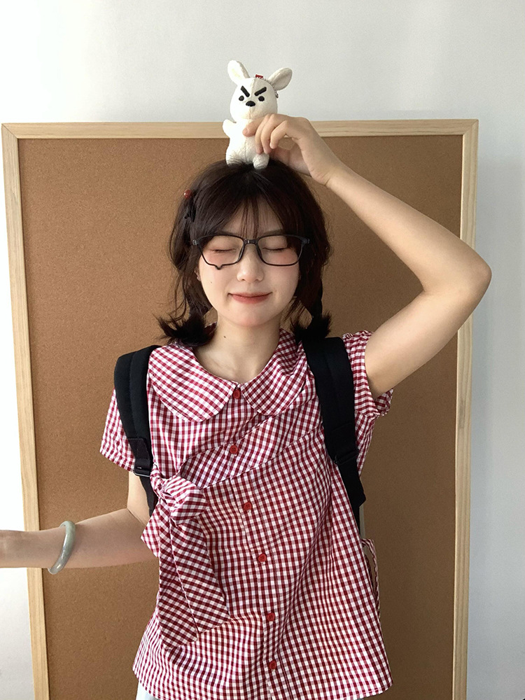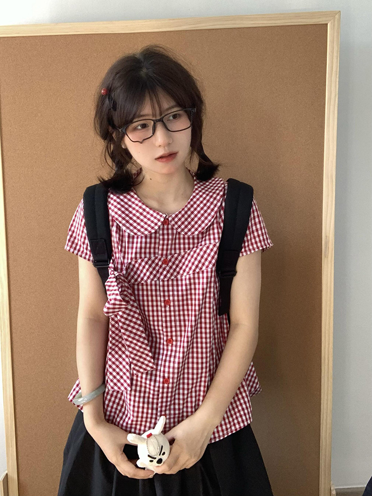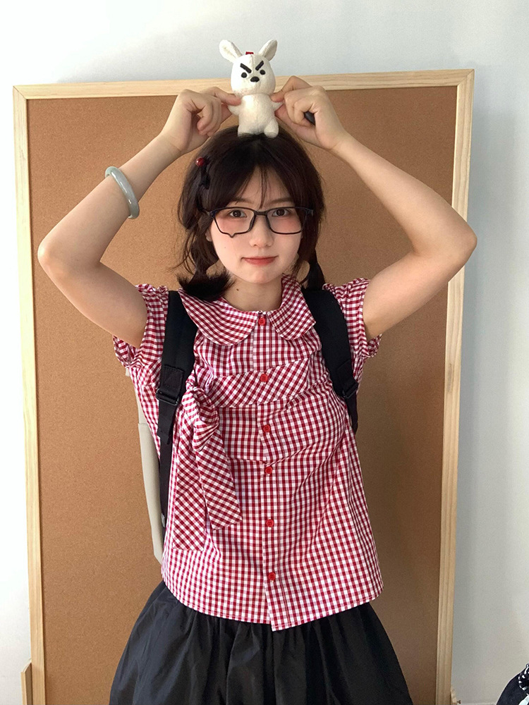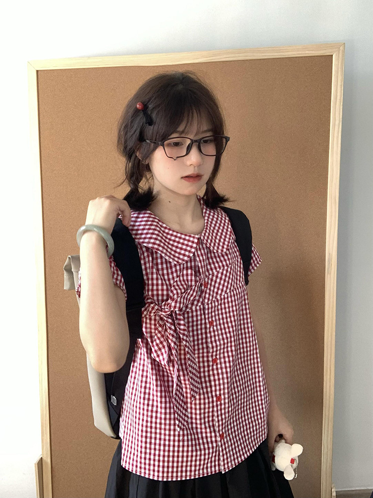 Летняя ретро нишевая клетчатая рубашка с короткими рукавами и кукольным воротником, женская рубашка с галстуком-бабочкой на талии, короткий модный топ