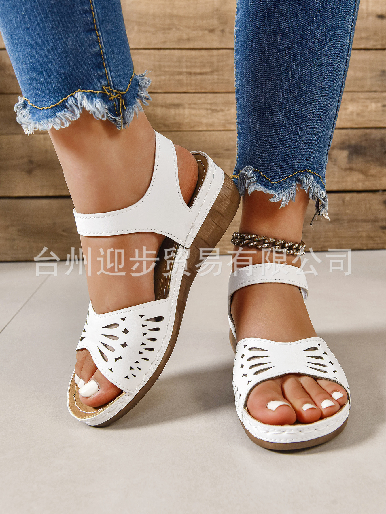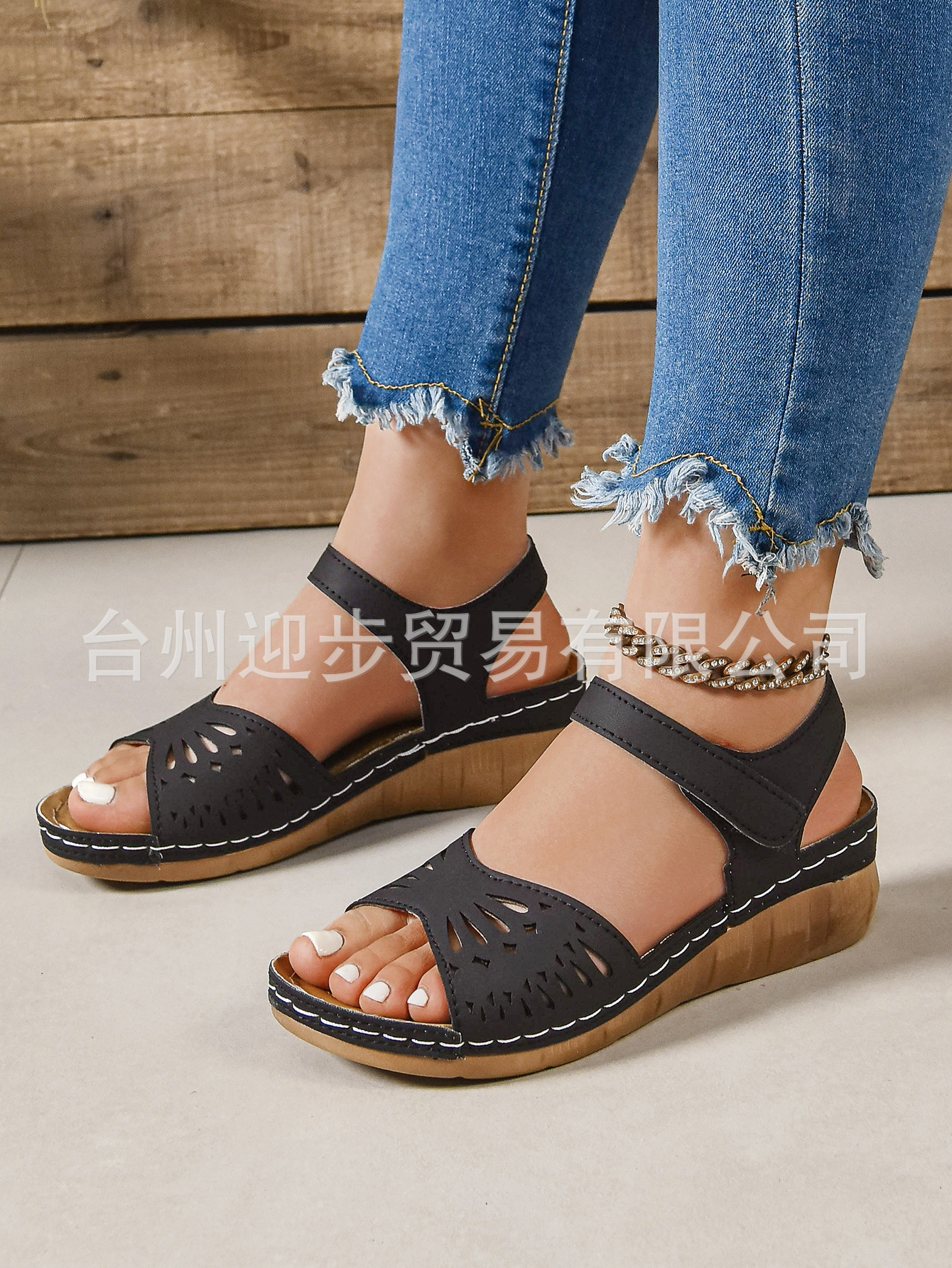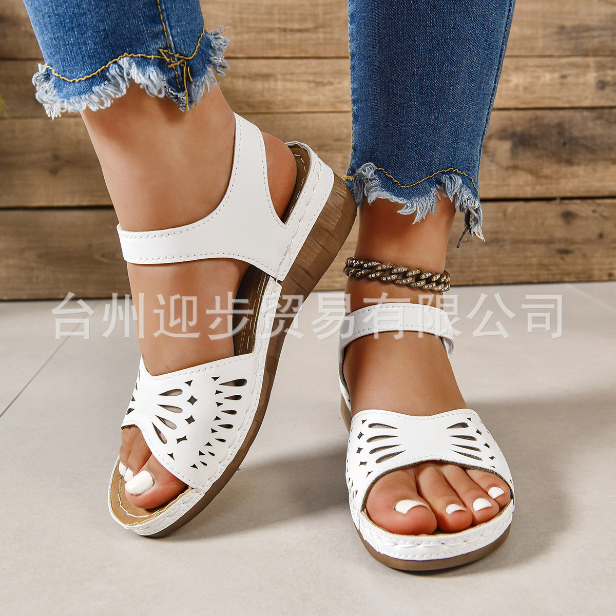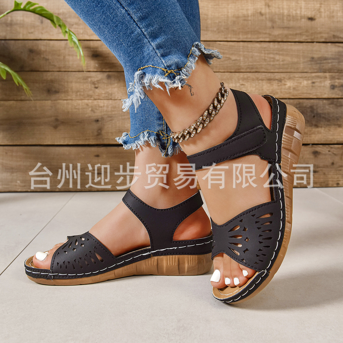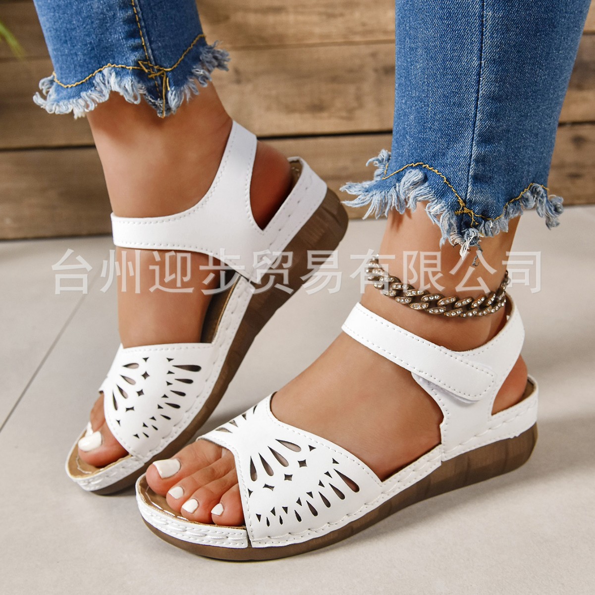 Женские сандалии на платформе больших размеров, лето 2025, новый стиль, с вырезами, цветочным принтом, толстой подошвой, на одной линии, с пряжкой и липучкой