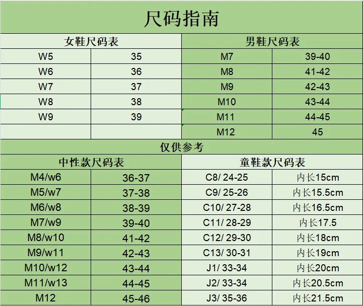 M4/W6 (подходит для размера 36 футов); M5/W7 (подходит для размера 37 футов); M6/W8 (подходит для размера 38 футов); M7/W9 (подходит для размера 39/40 футов); M8/W10 (подходит для размера 41 фут); M9/W11 (подходит для размера стопы 42/43); M10/W12 (подходит для размера 44 фута); M11/W13 (подходит для размера 45 футов)