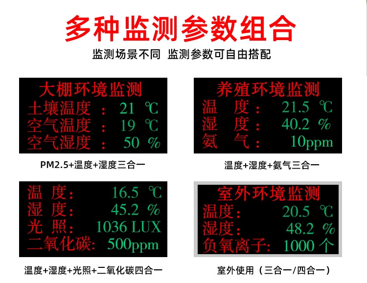 [Базовый пакет] Температура и влажность воздуха в теплице + мониторинг температуры почвы; [Пакет 4G] Мониторинг температуры и влажности в теплице; [Пакет 1] Освещение теплицы + мониторинг температуры и влажности почвы; [Пакет 2] Мониторинг качества воздуха в теплице (температура и влажность + PM2,5); [Пакет 3] Мониторинг состояния теплицы (температура и влажность + углекислый газ); [Пакет 4] Температура и влажность + углекислый газ (CO2) + свет; [Пакет 5] Мониторинг условий разведения (температура и влажность + аммиак); [Двухцветный экран 3*2] Внутренний двухцветный дисплей (температура + влажность + CO2 + освещенность + температура почвы); [Двухцветный экран 2*3] Двухцветный дисплей (температура и влажность + температура и влажность почвы + CO2 + свет); [1* 0.56m водонепроницаемый экран] температура, влажность + свет; [Шесть в одном] Температура и влажность окружающей среды + свет + CO2 + температура и влажность почвы; Удаленный мониторинг мобильного телефона; Отображение температуры и влажности; Решение для мониторинга теплиц