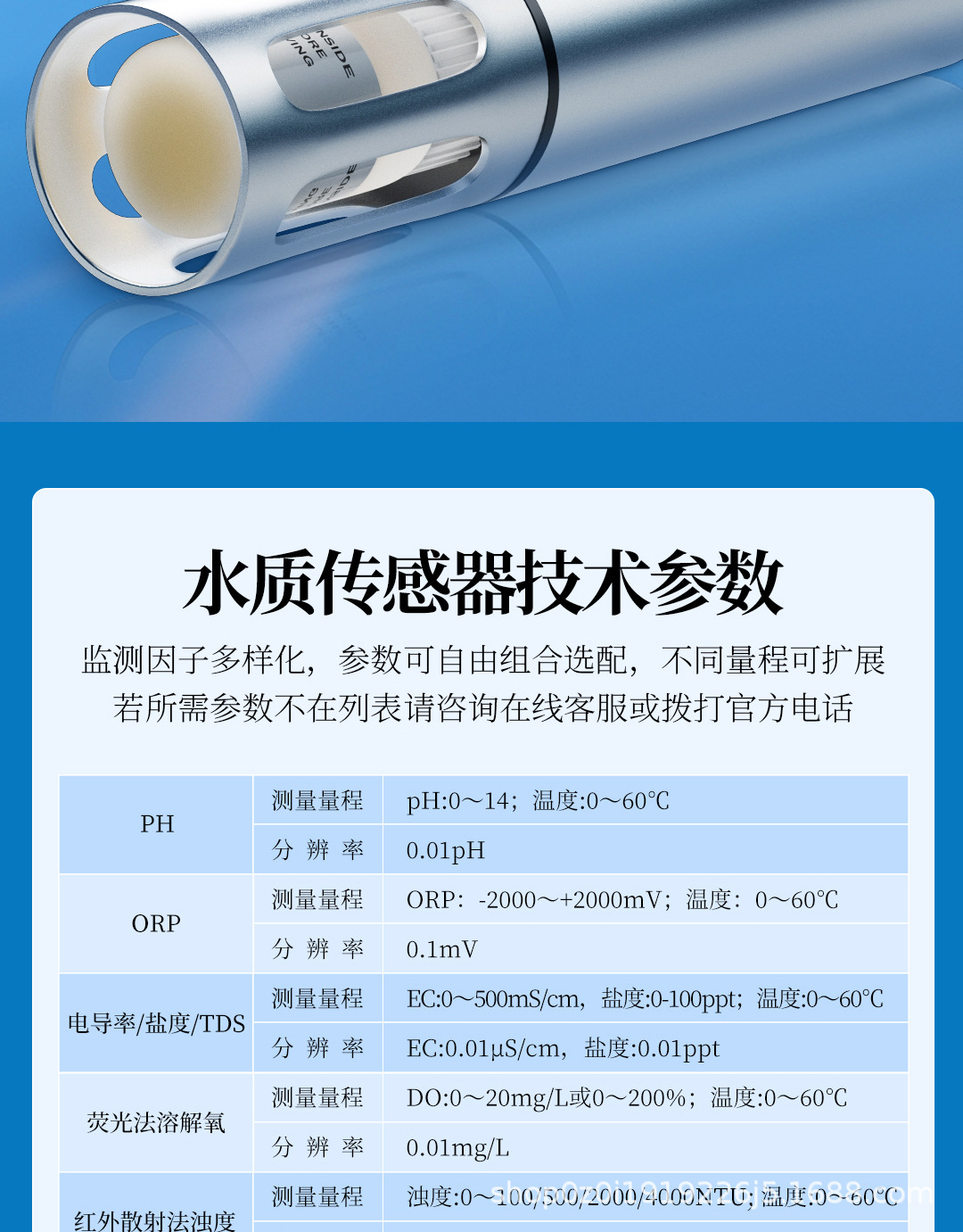 Датчик pH (только для сточных вод); буй; Цифровой датчик ХПК; Цифровой датчик ОВП; Цифровой датчик PH; Цифровой датчик нитратов/аммиачного азота; Цифровой датчик аммиачного азота; Датчик проводимости/солености/TDS; Цифровой датчик цианобактерий; Ионно-электродный датчик; датчик погоды; Флуоресцентный датчик растворенного кислорода; Цифровой колориметрический датчик; Цифровой датчик воды и масла; Датчик концентрации осадка; Цифровой нитрат/PH/температура; Цифровой нитрат/PH/хлоридный ион/температура; Цифровой датчик взвешенных веществ; Цифровой датчик хлорофилла; Цифровой датчик мутности