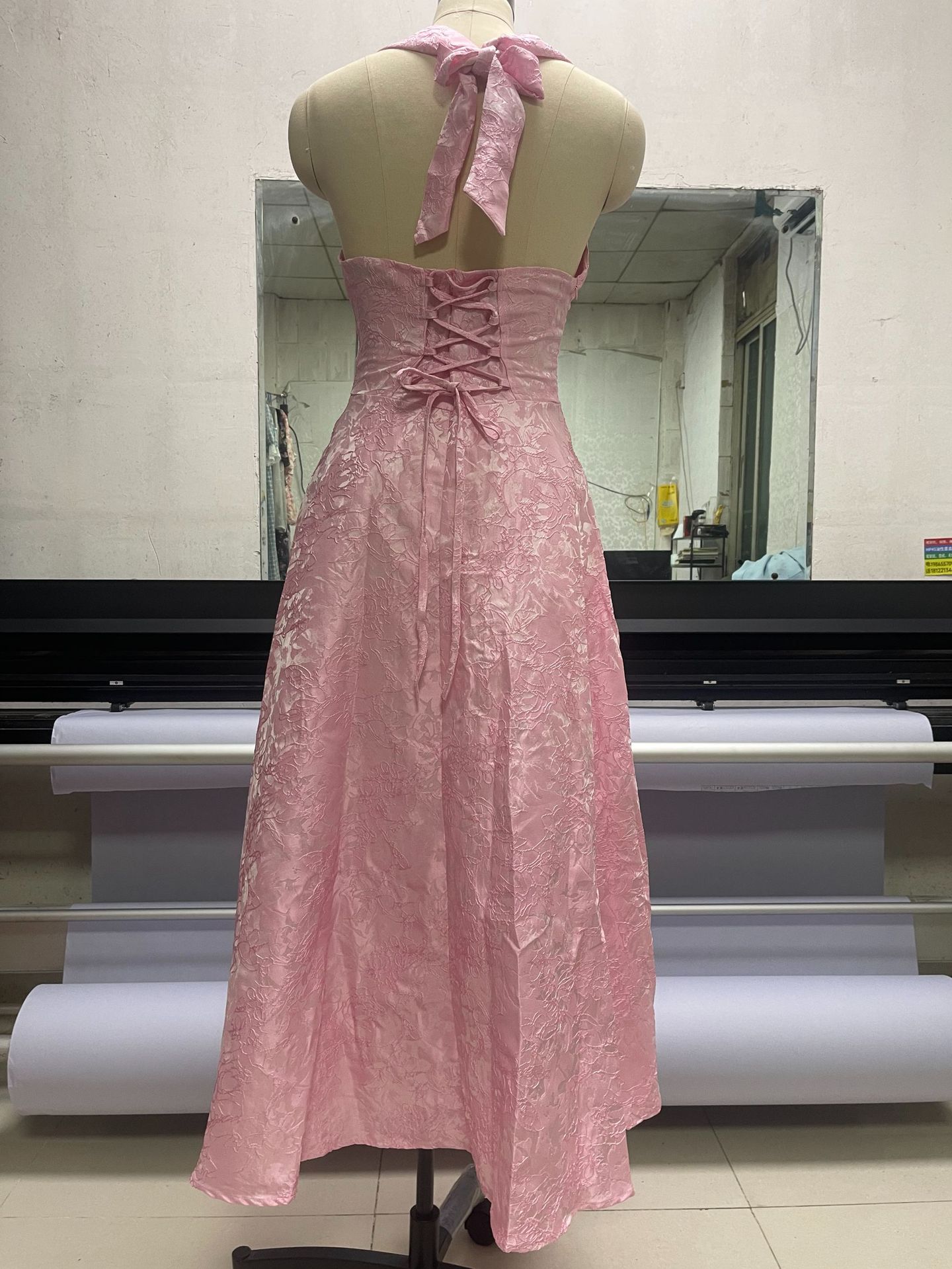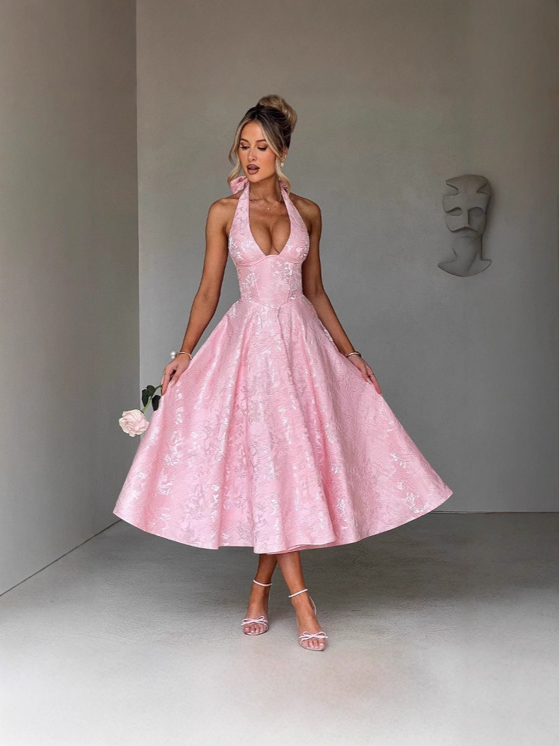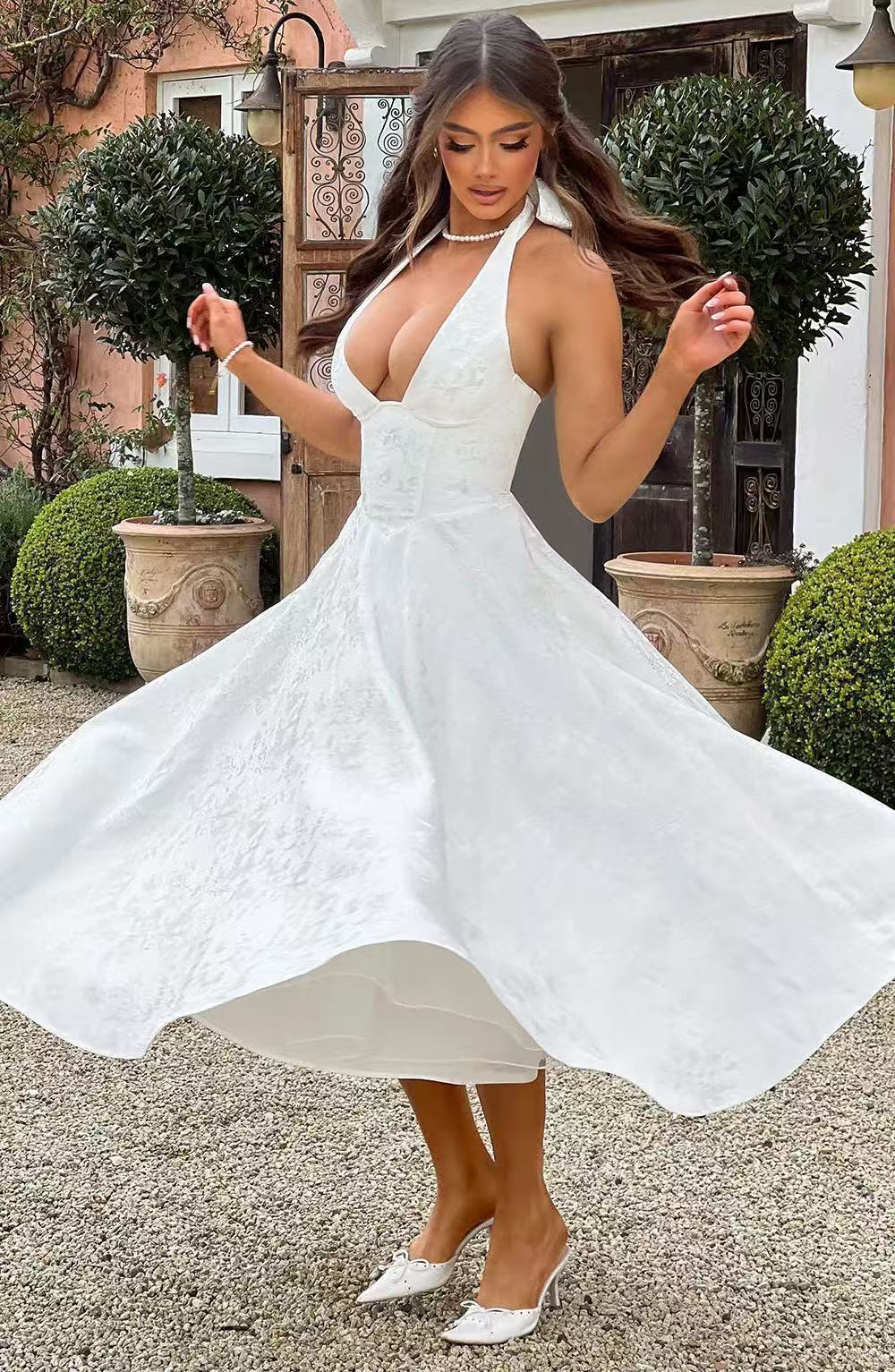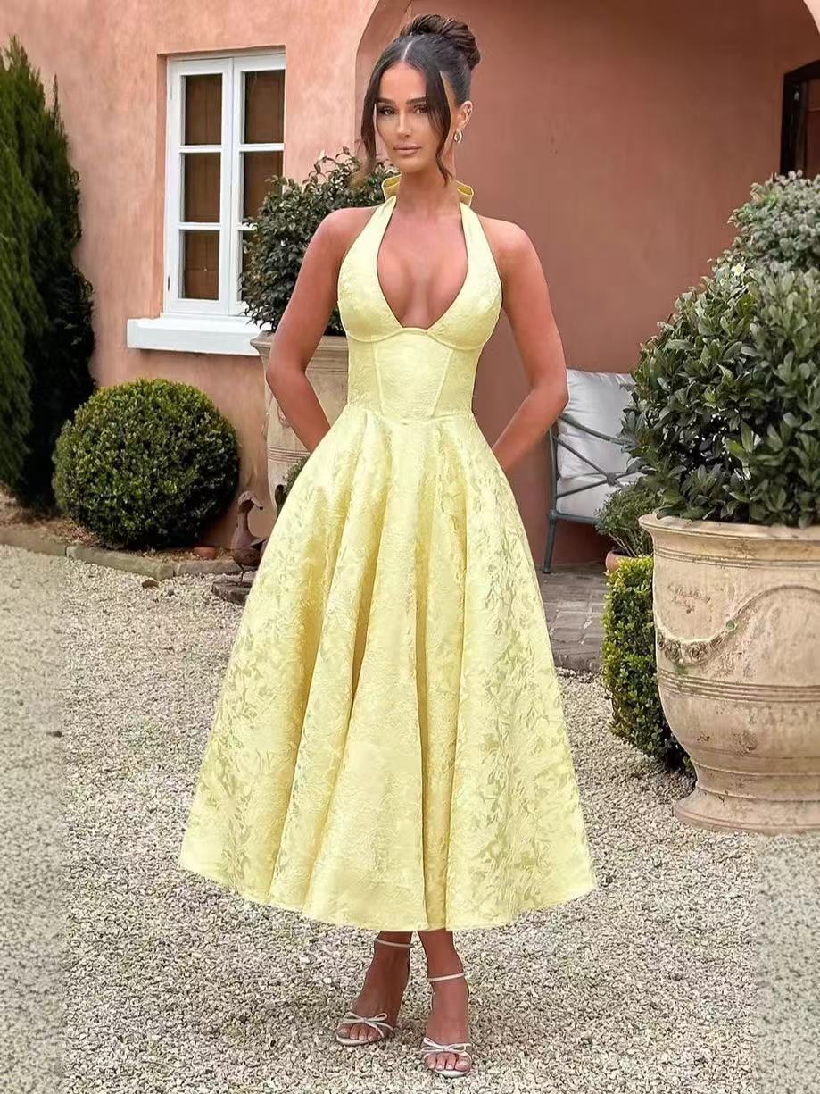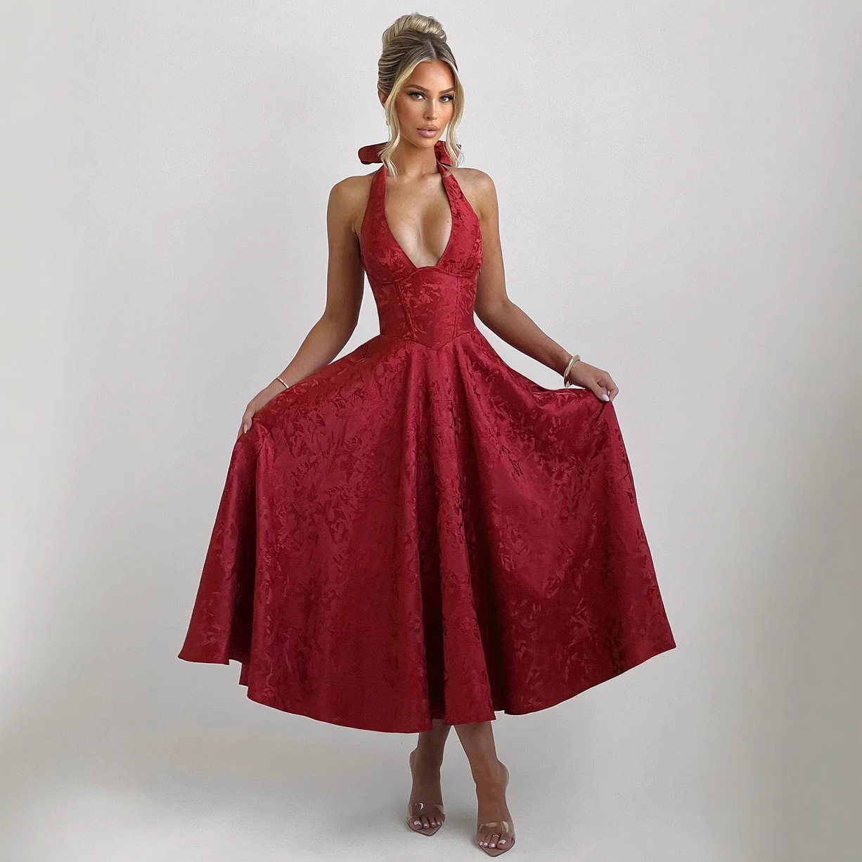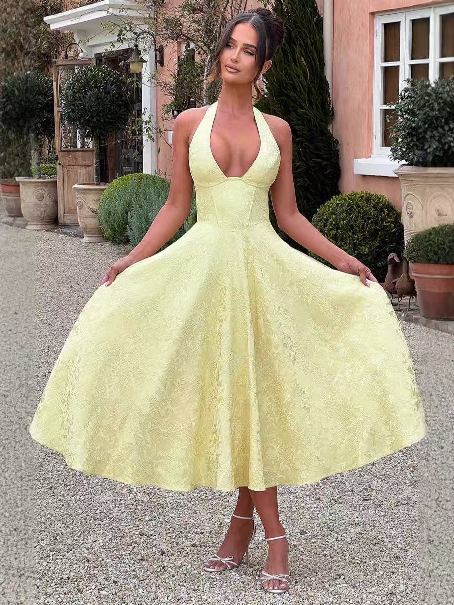 2025 Европейский и американский новый стиль V-образный вырез с завязками на шее без рукавов жаккардовое платье со шнуровкой на талии средней длины элитное модное платье