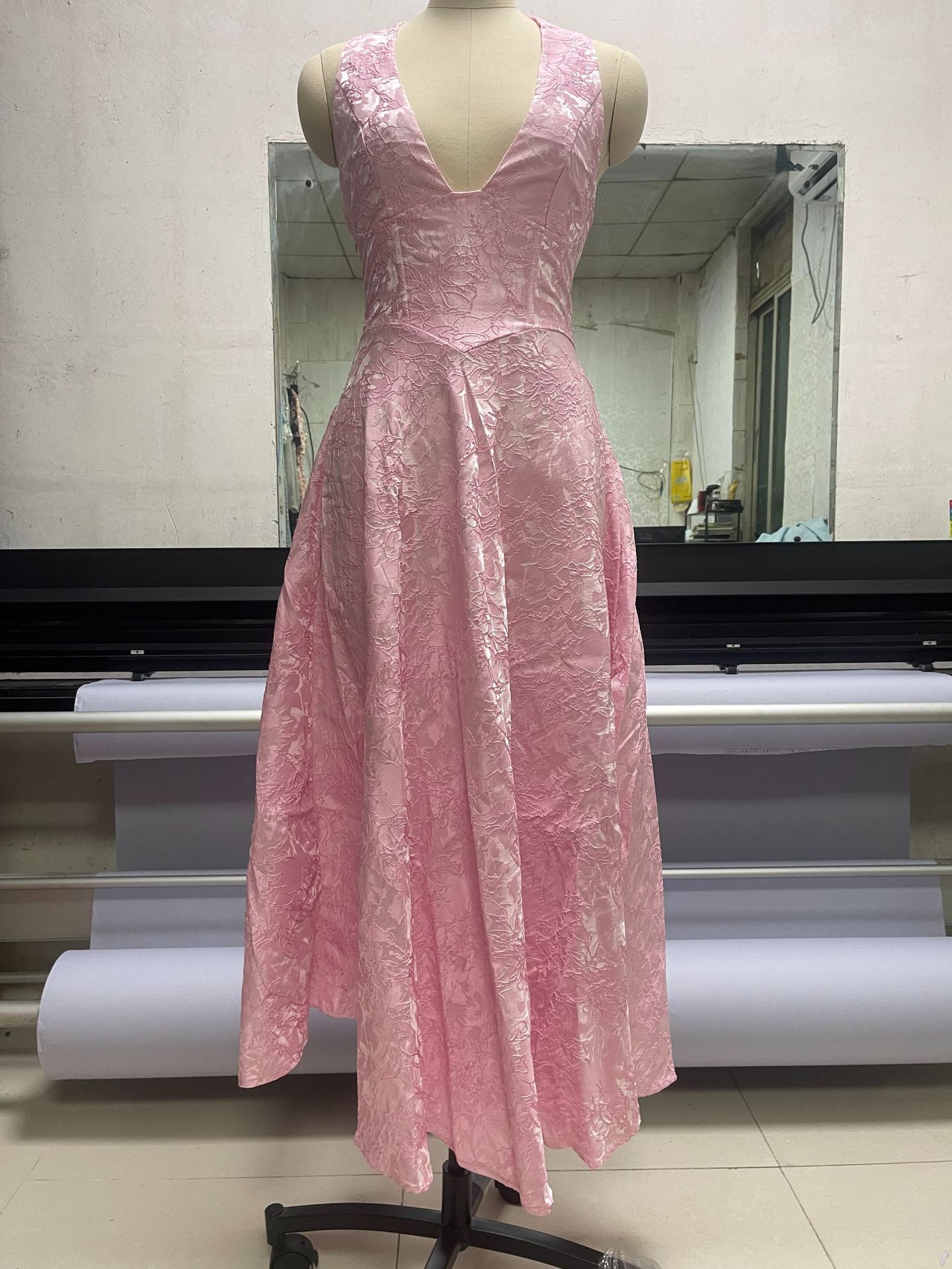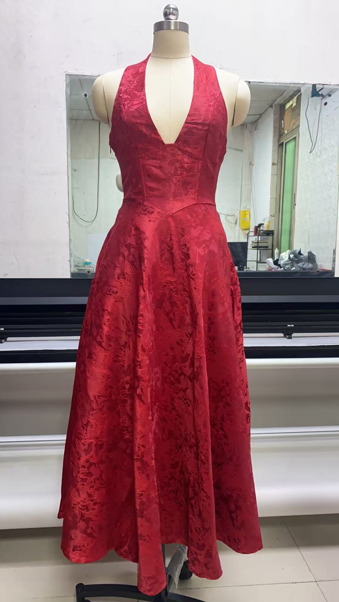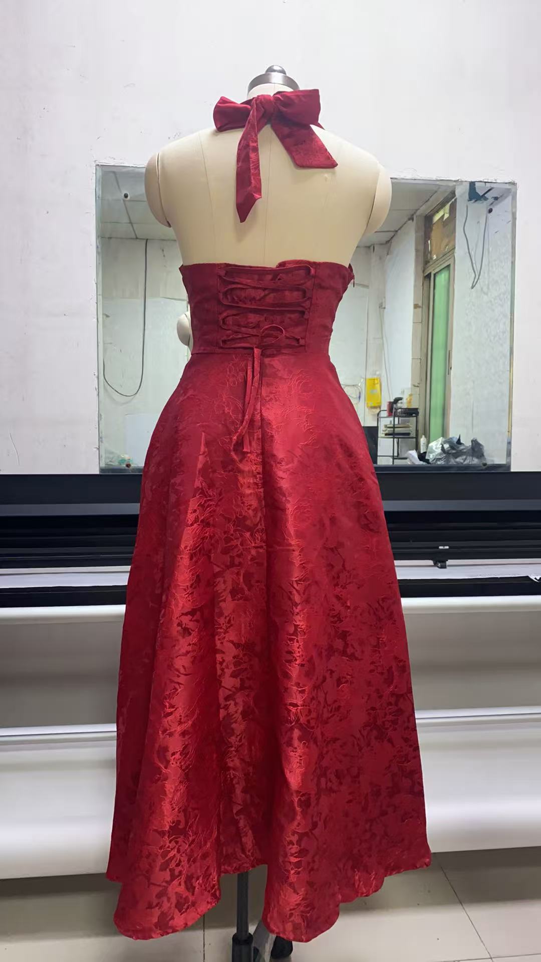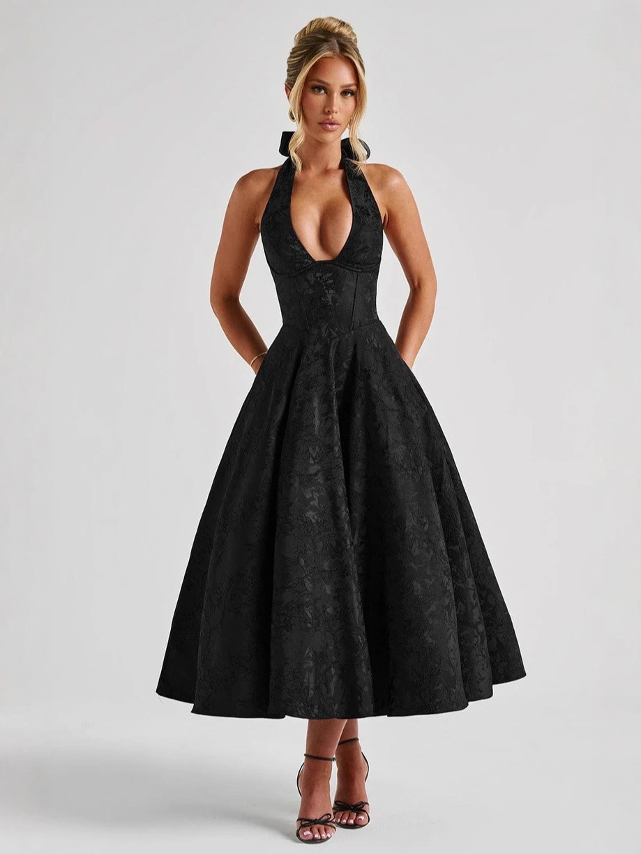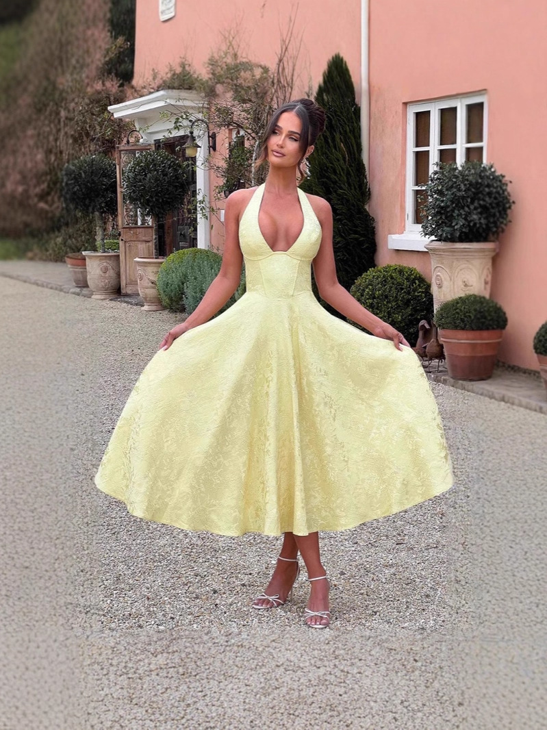 2025 Европейский и американский новый стиль V-образный вырез с завязками на шее без рукавов жаккардовое платье со шнуровкой на талии средней длины элитное модное платье