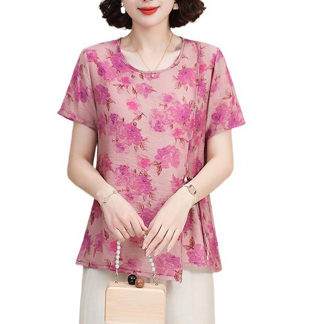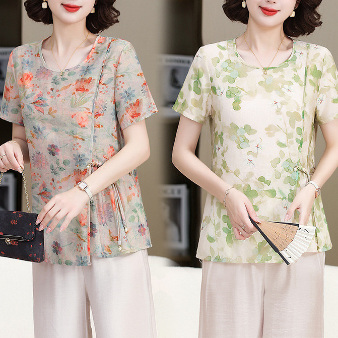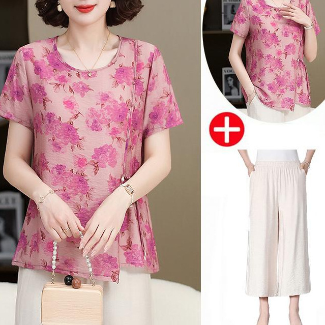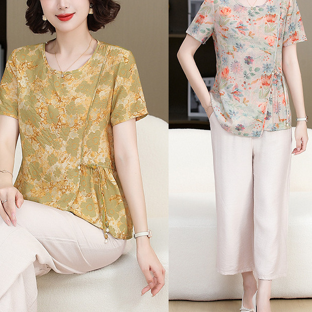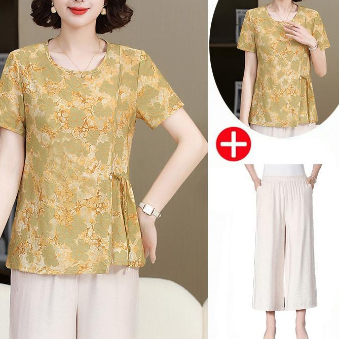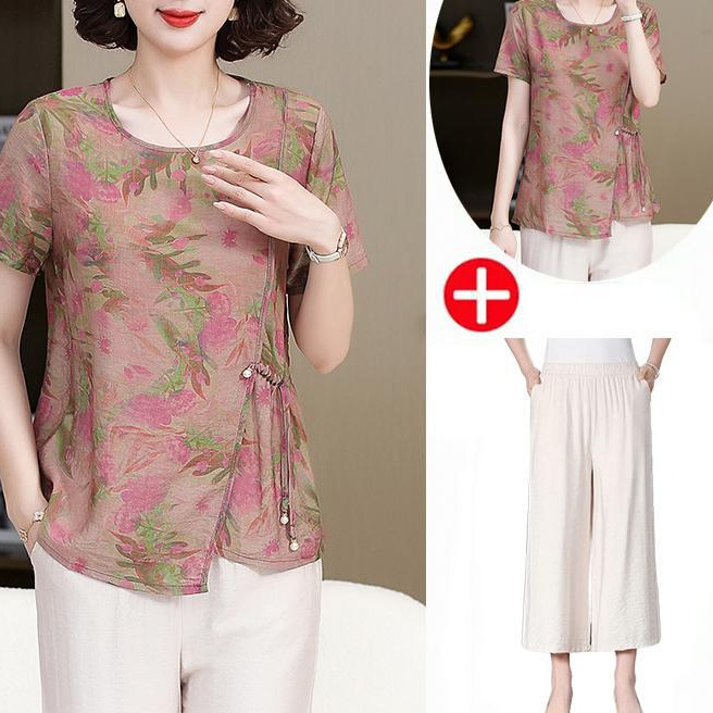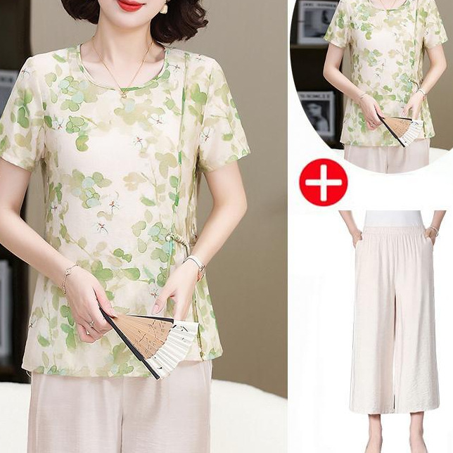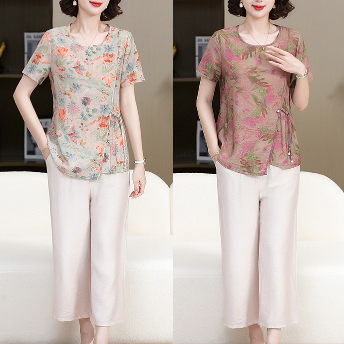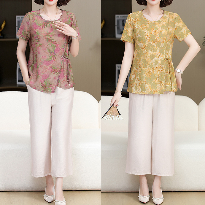 Костюм в западном стиле для мамы 2025, новый повседневный принтованный комплект с короткими рукавами для женщин среднего и старшего возраста, свободный и стройнящий двухсоставной набор.
