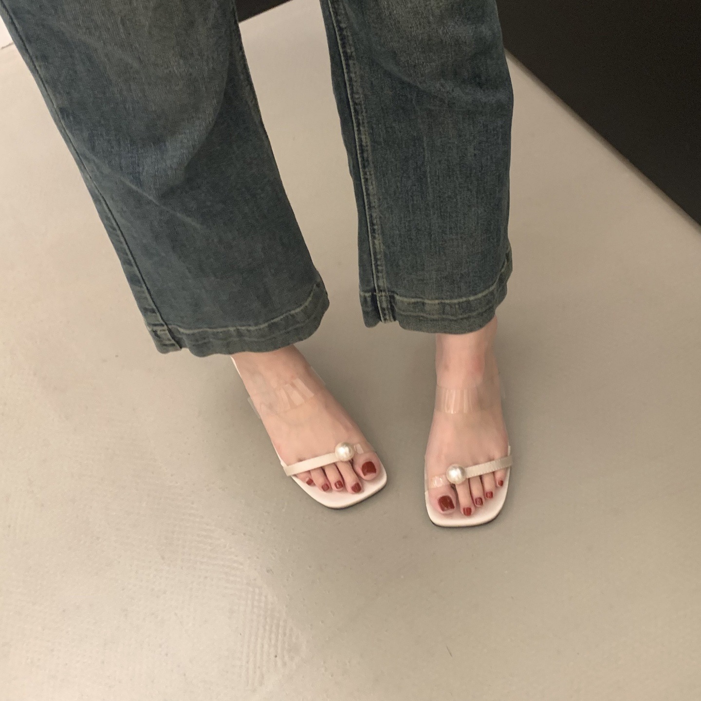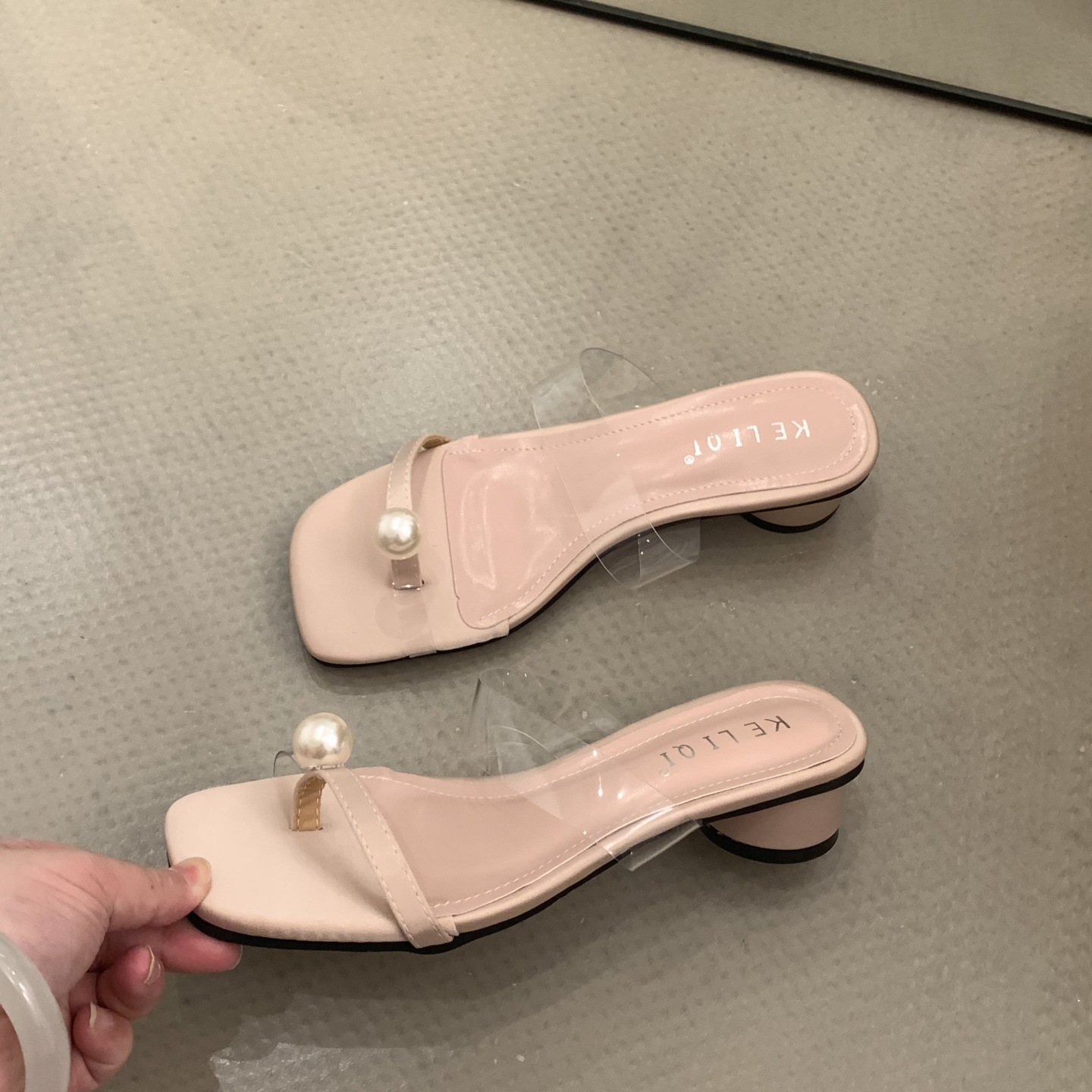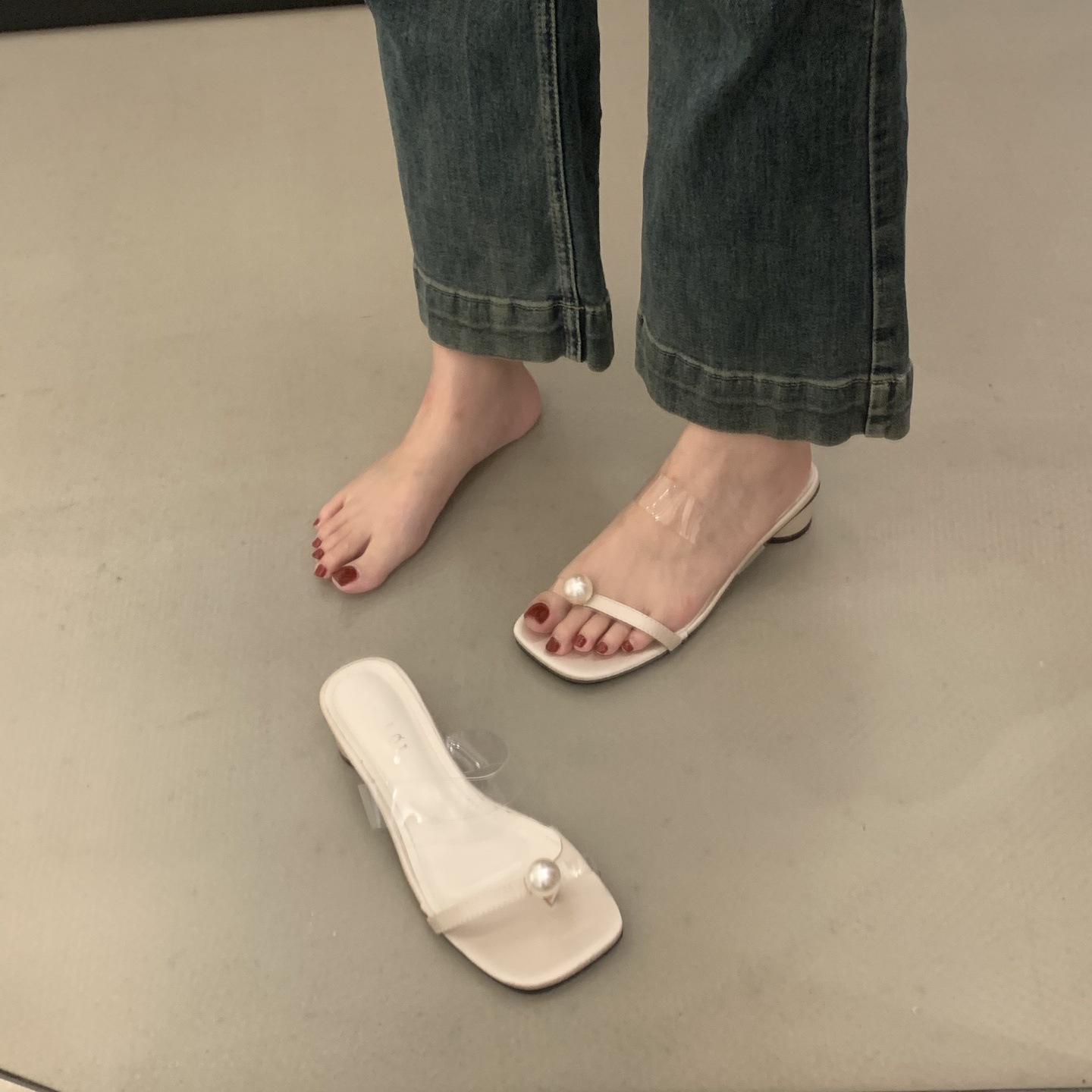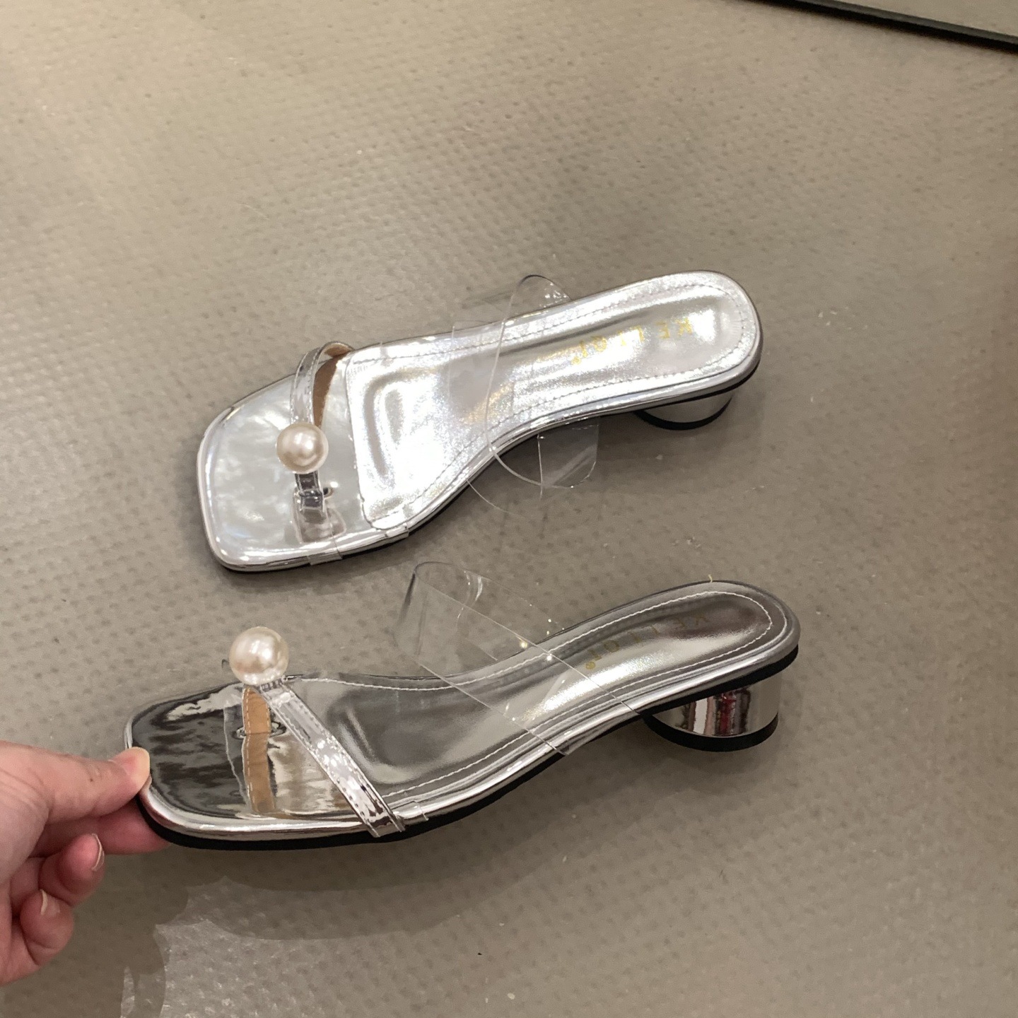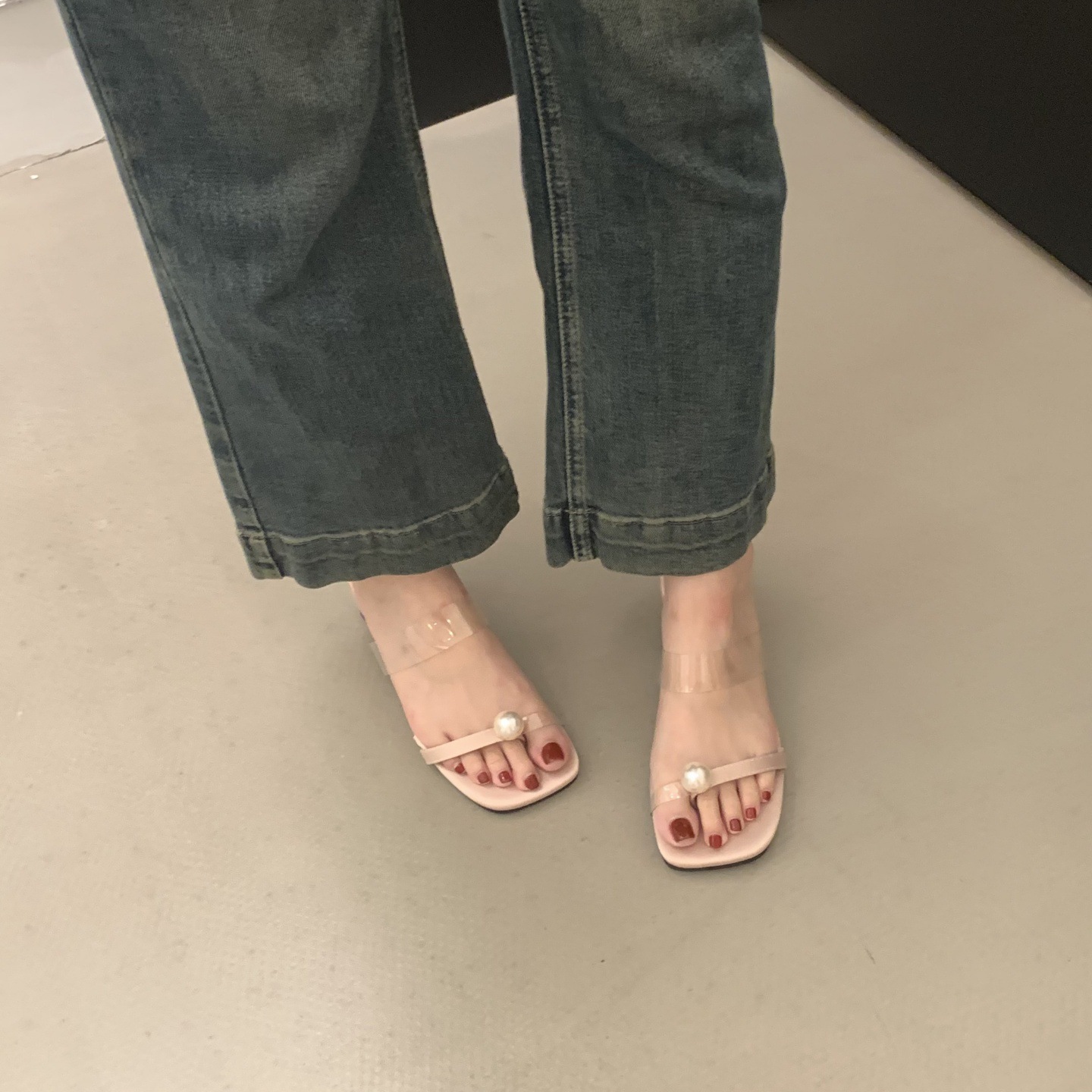 Толстый каблук, прозрачный ремешок, красивые тапочки для женщин 2025, новая летняя обувь для улицы с юбкой, высококачественные сандалии с открытым носком и жемчугом.