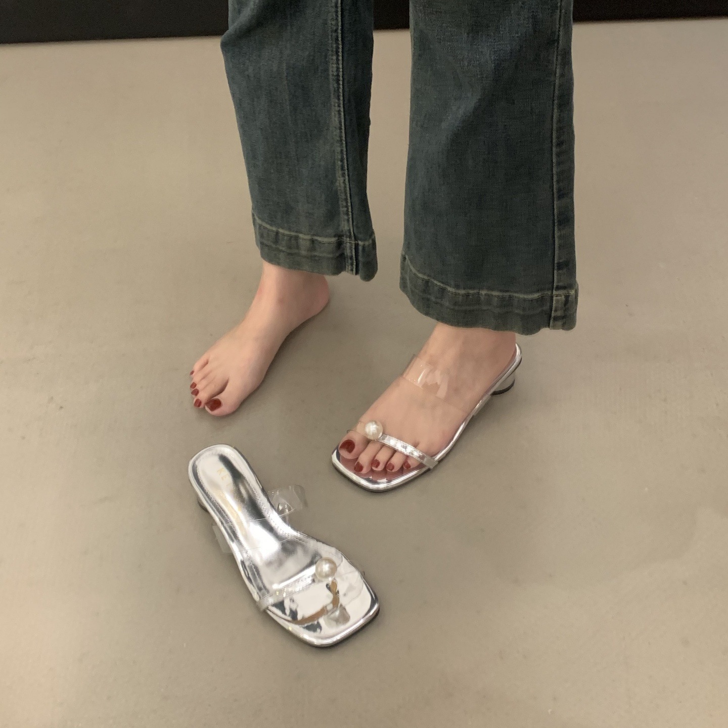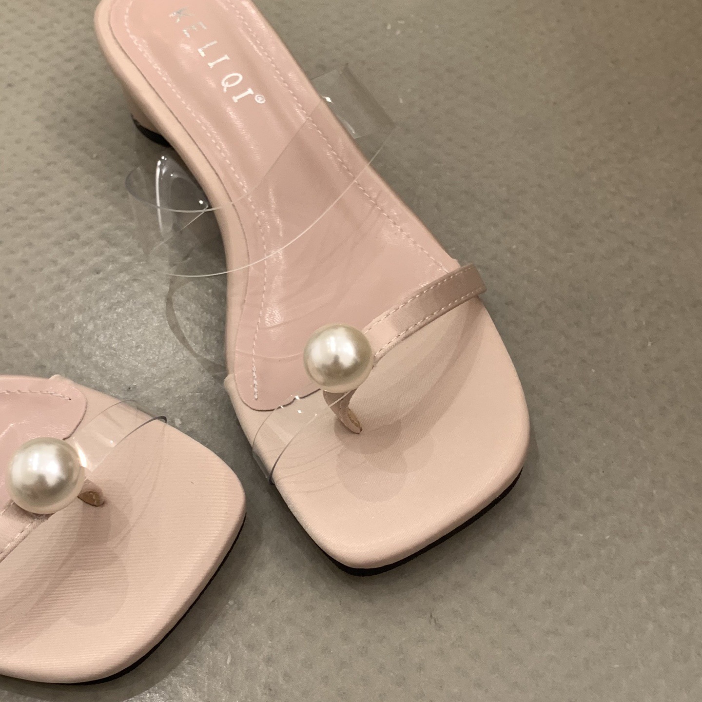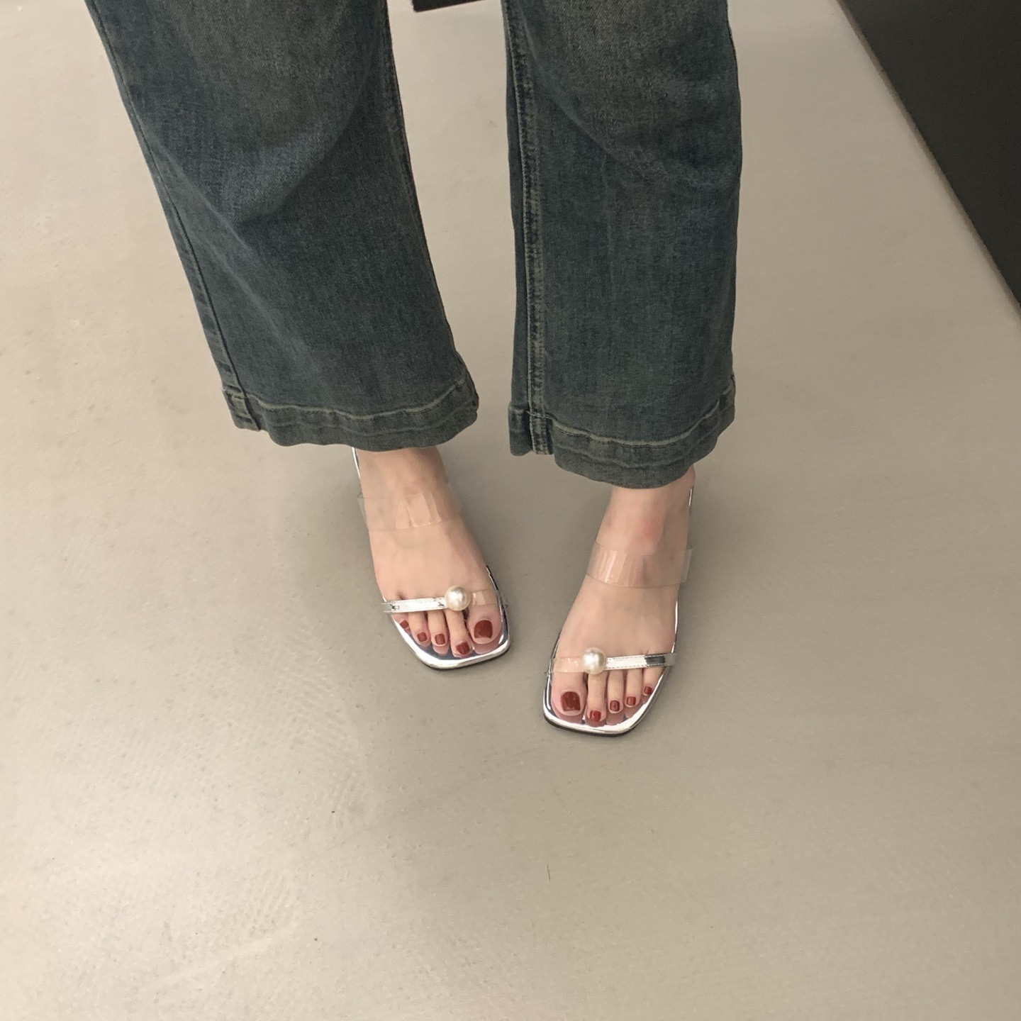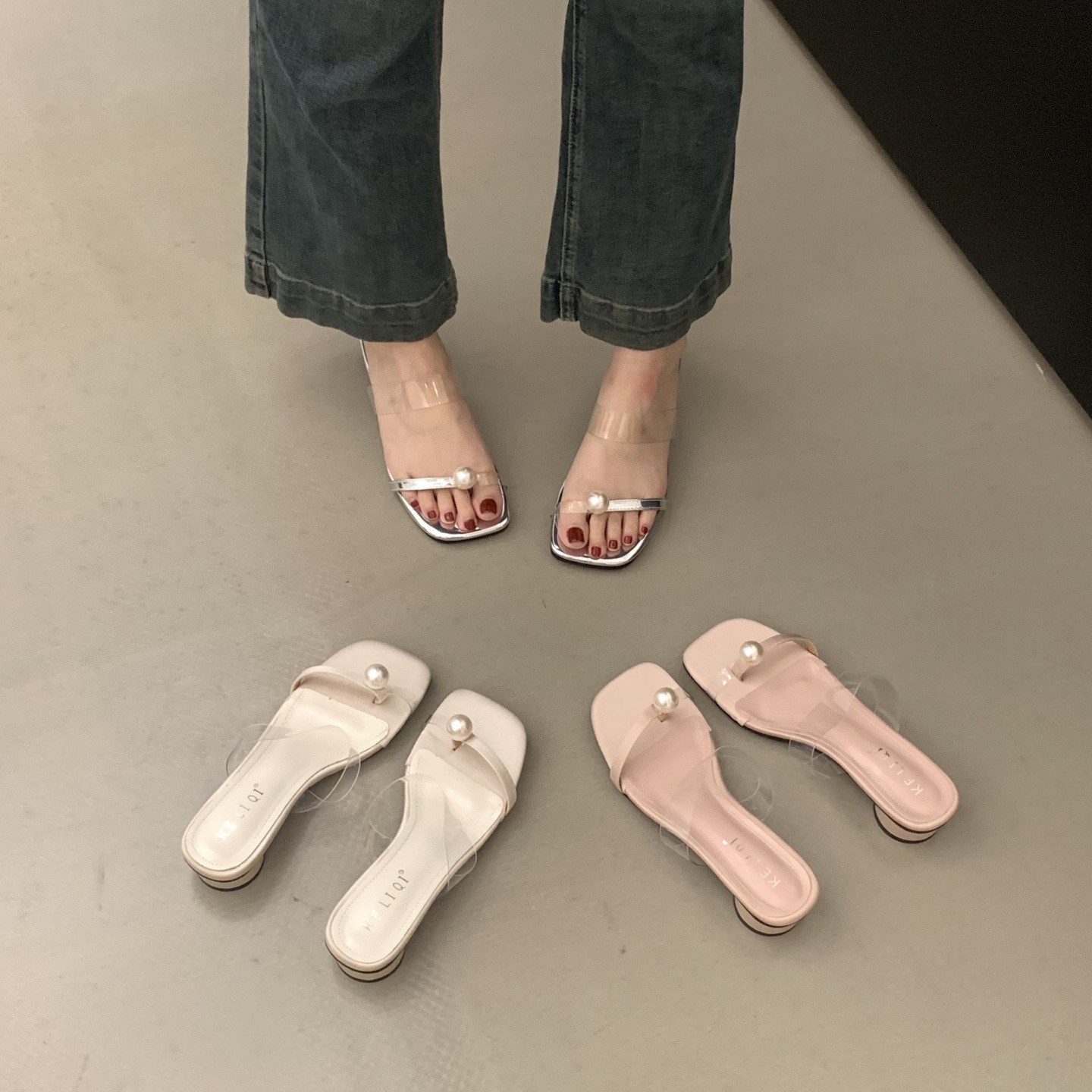 Толстый каблук, прозрачный ремешок, красивые тапочки для женщин 2025, новая летняя обувь для улицы с юбкой, высококачественные сандалии с открытым носком и жемчугом.