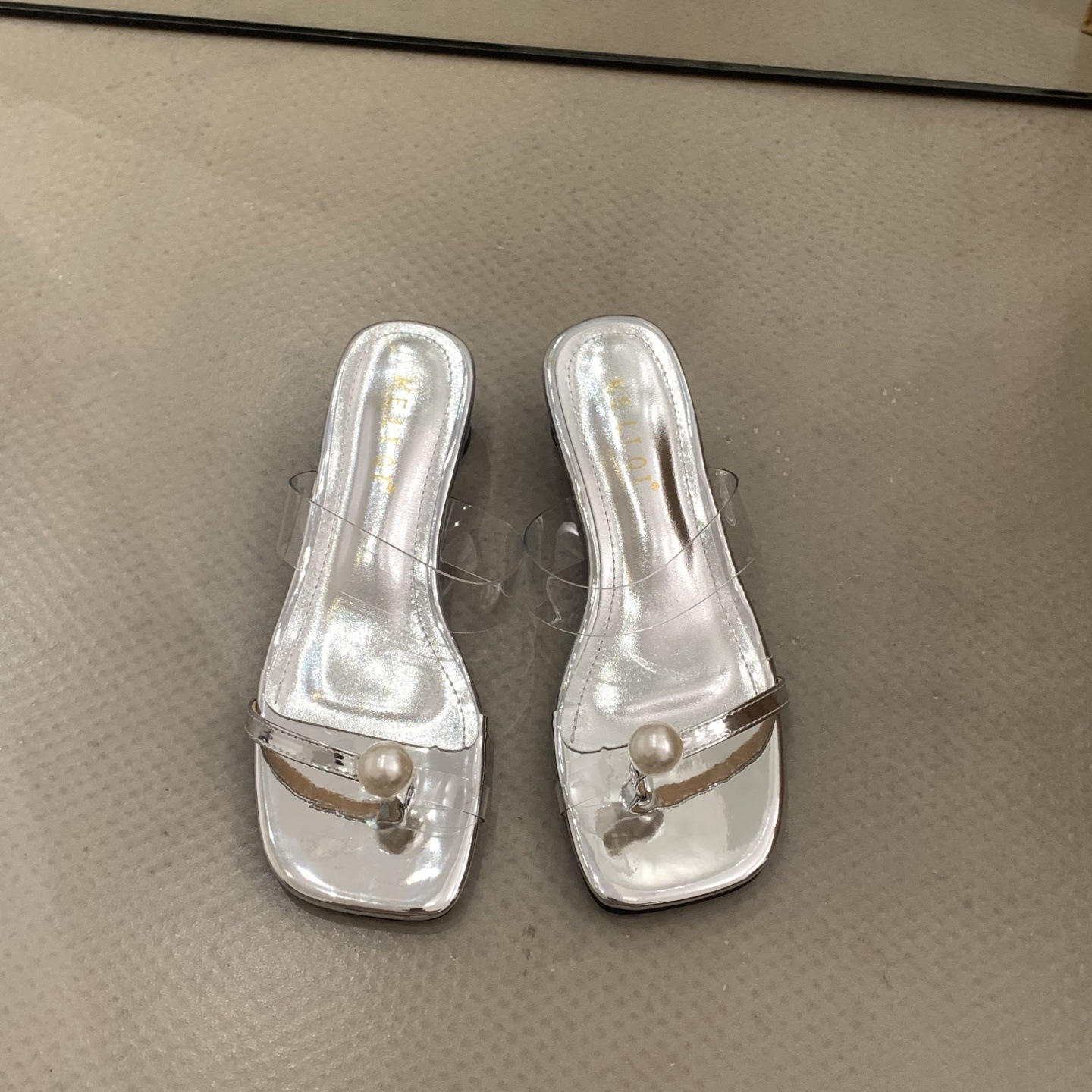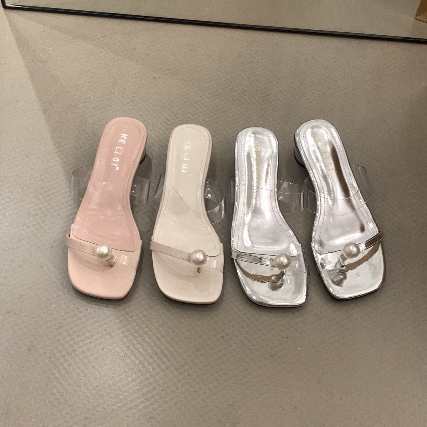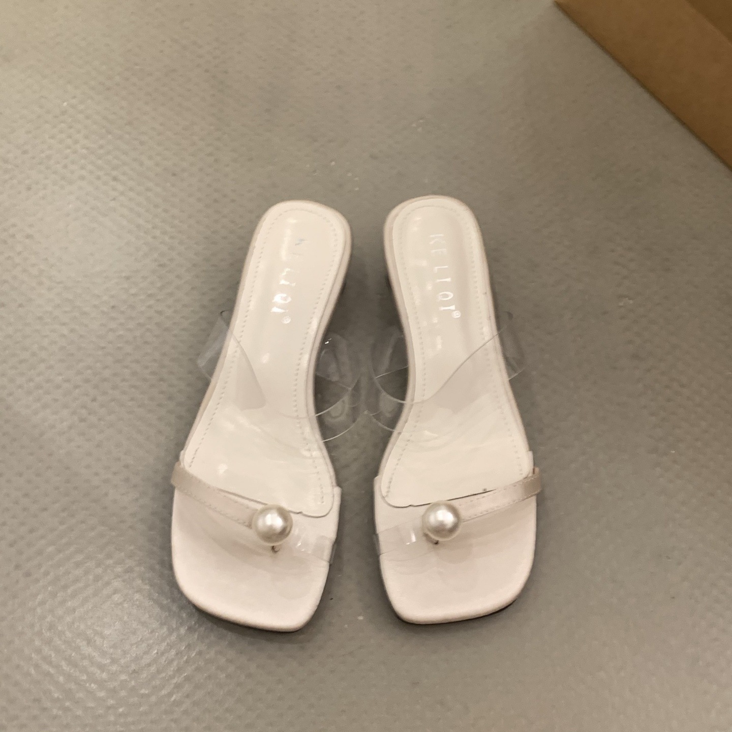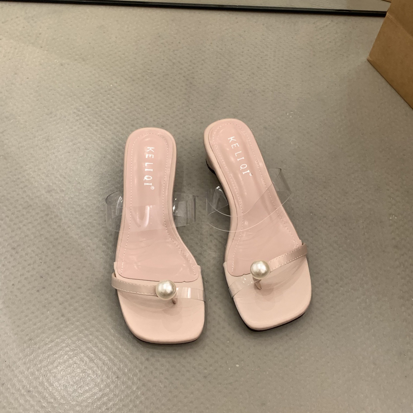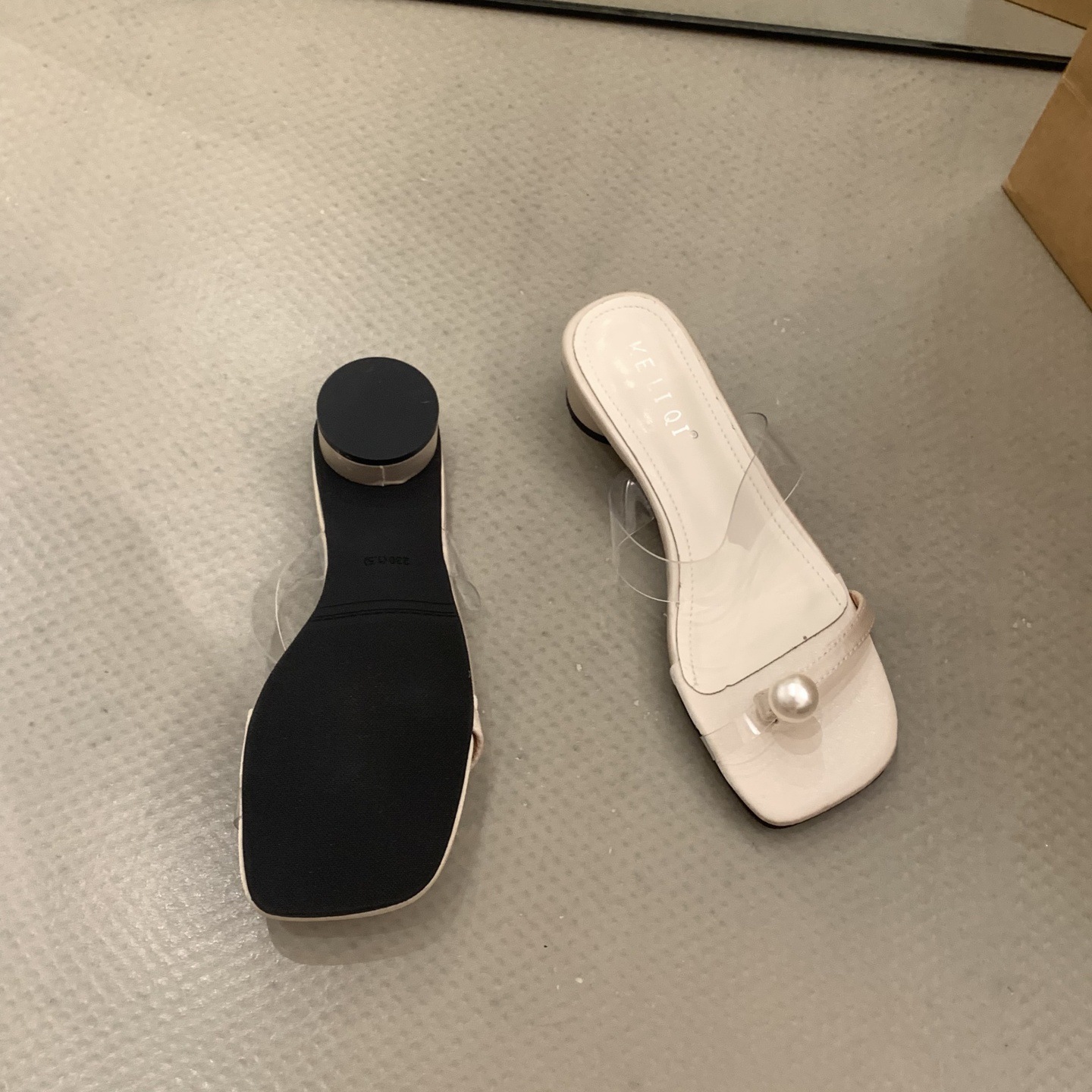 Толстый каблук, прозрачный ремешок, красивые тапочки для женщин 2025, новая летняя обувь для улицы с юбкой, высококачественные сандалии с открытым носком и жемчугом.