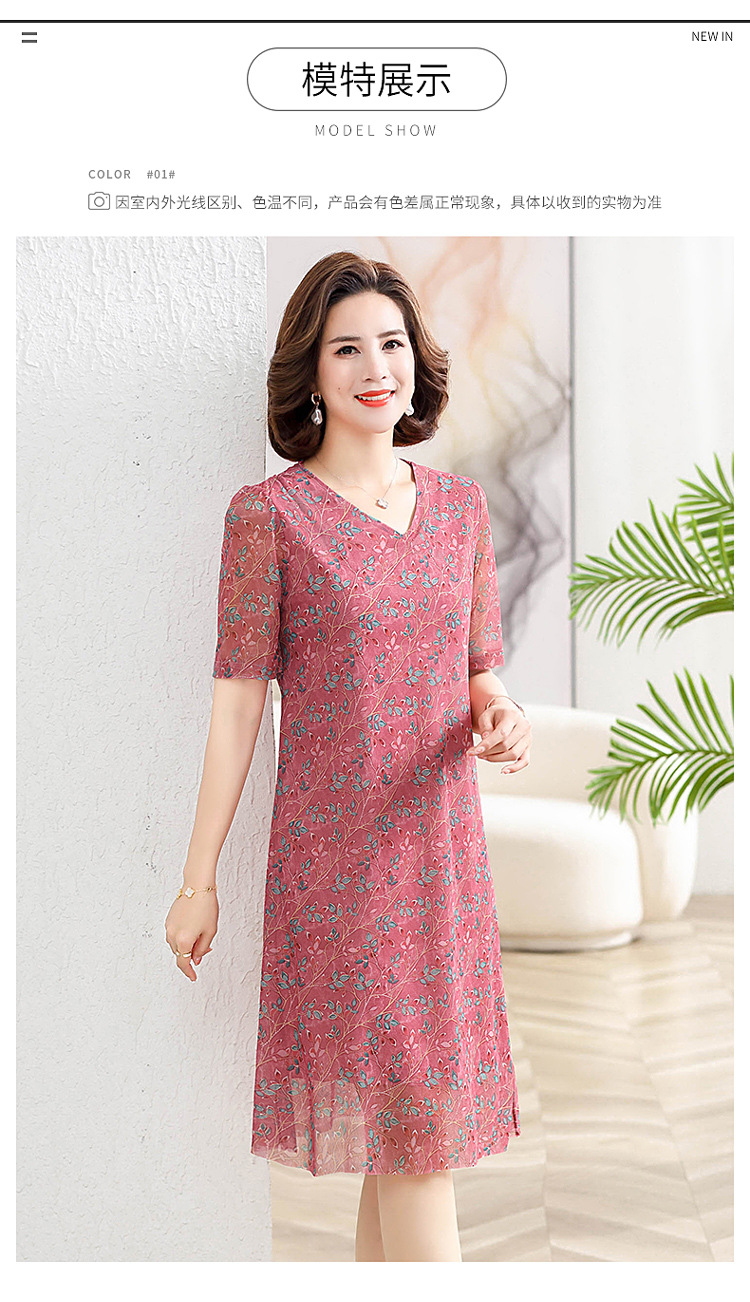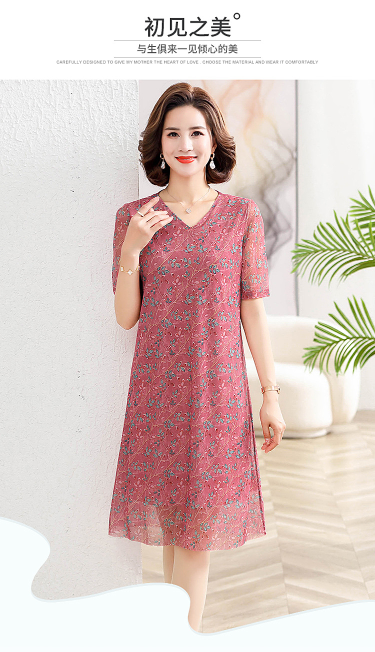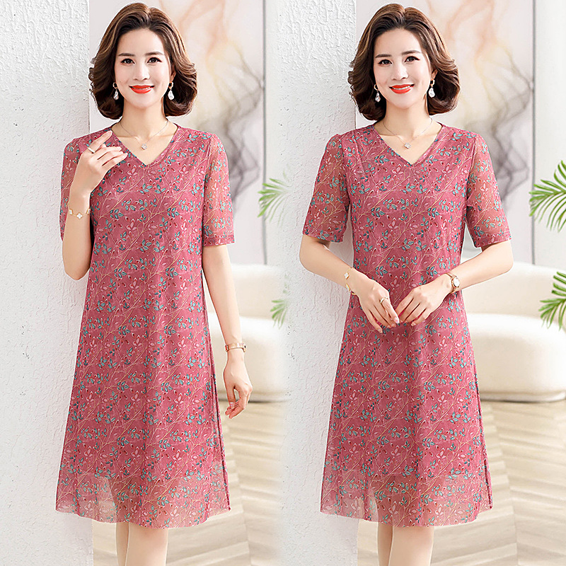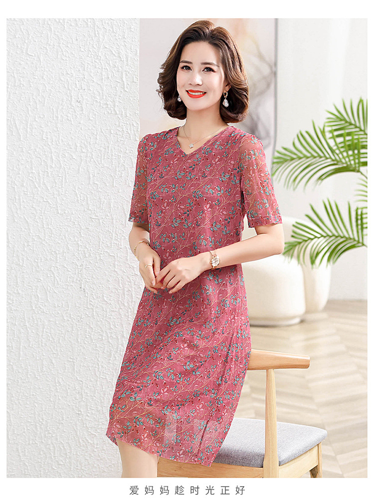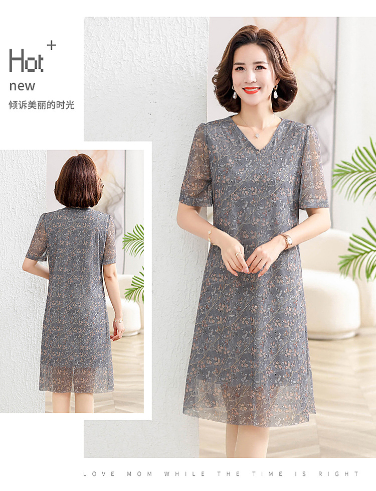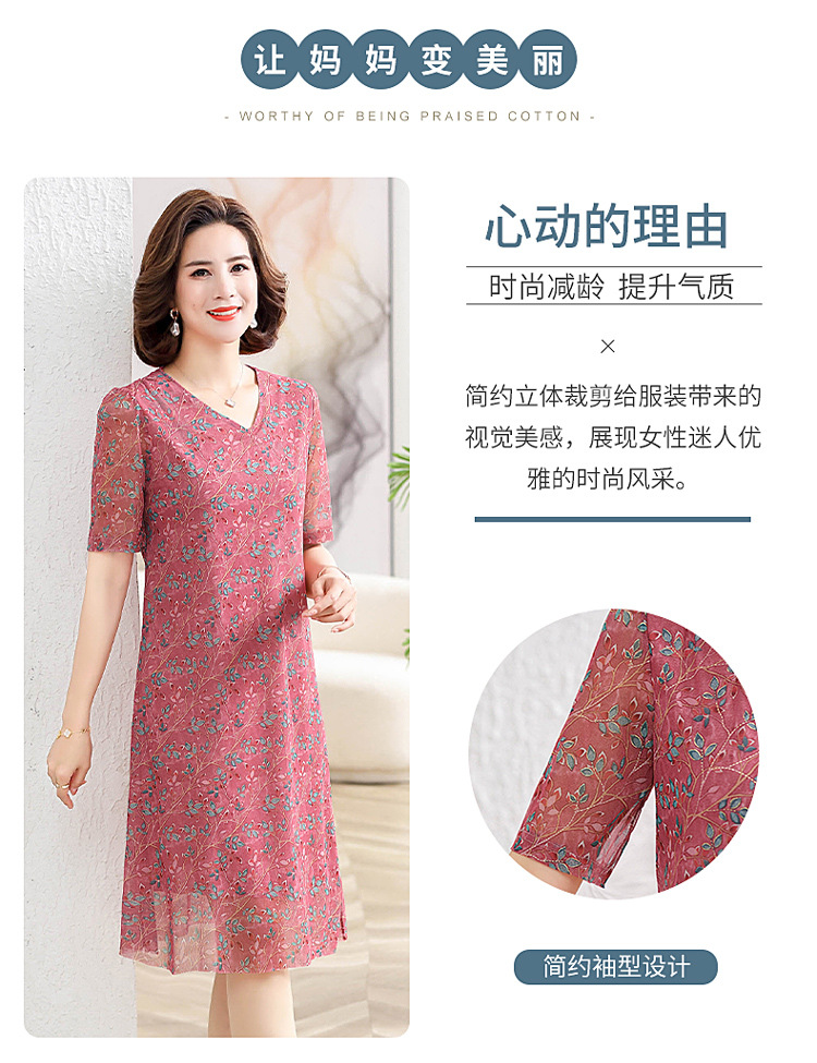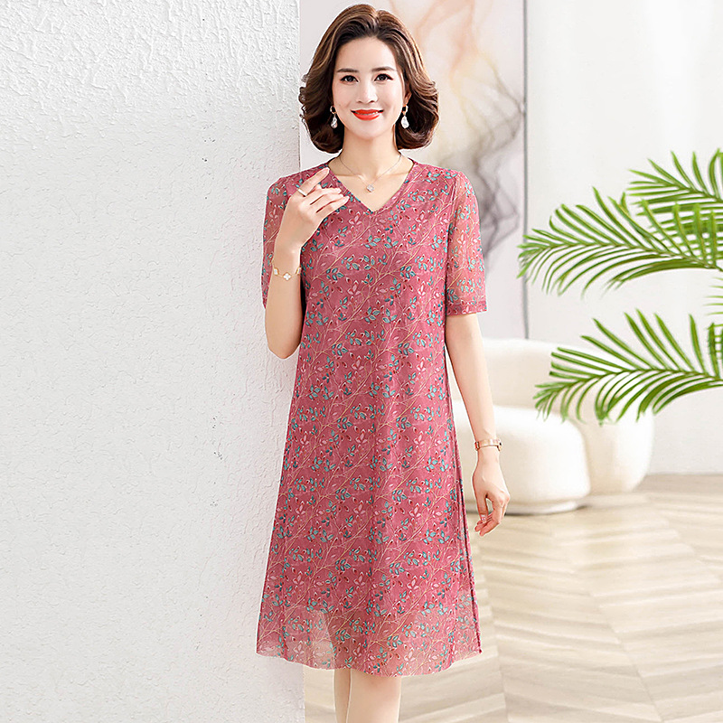 Новая летняя одежда для мам, платье с v-образным вырезом и короткими рукавами, чтобы уменьшить возраст и похудеть, модная юбка с цветочным принтом для женщин среднего и пожилого возраста.