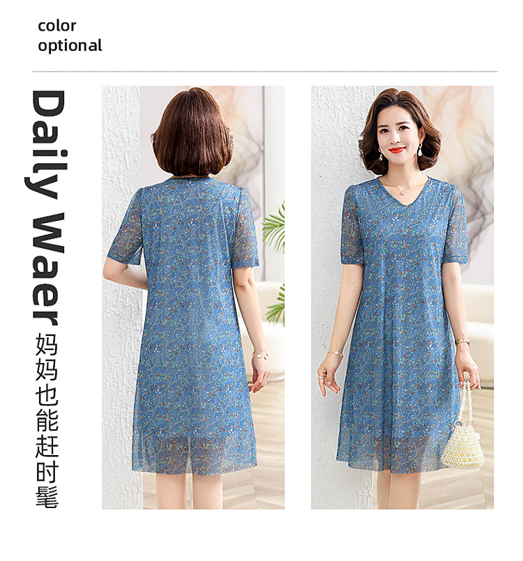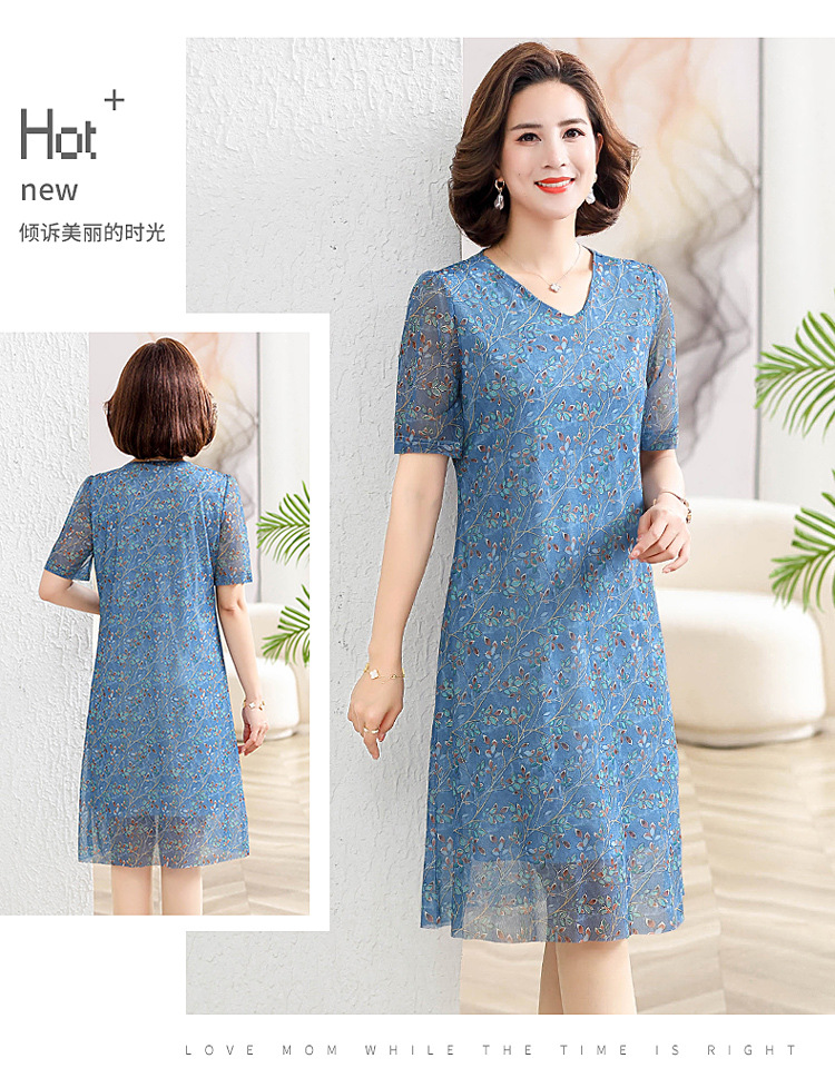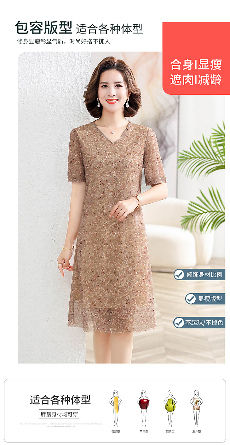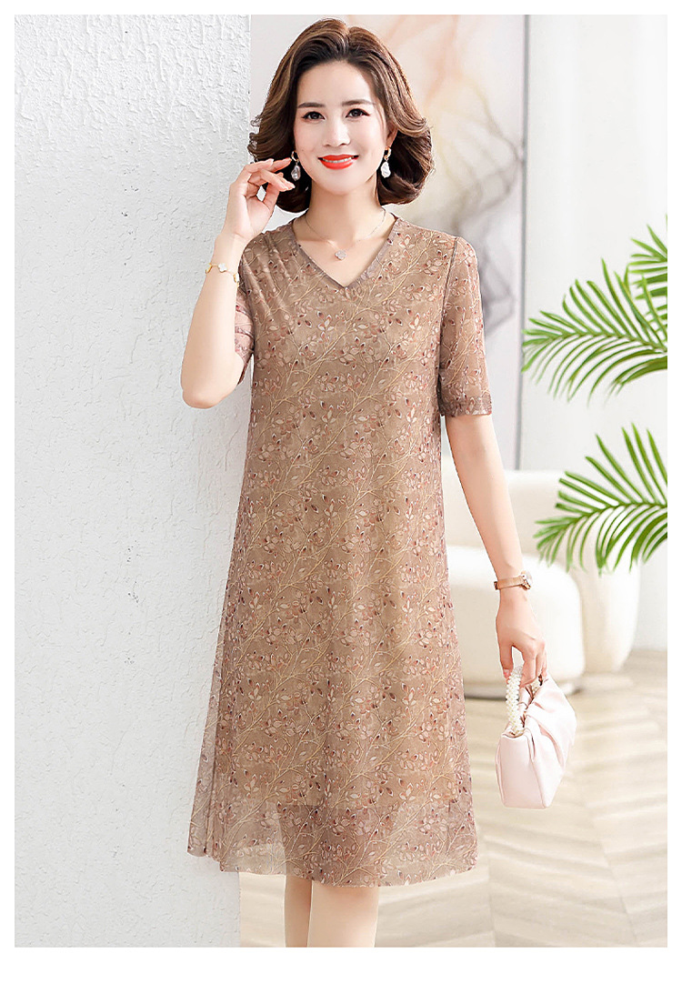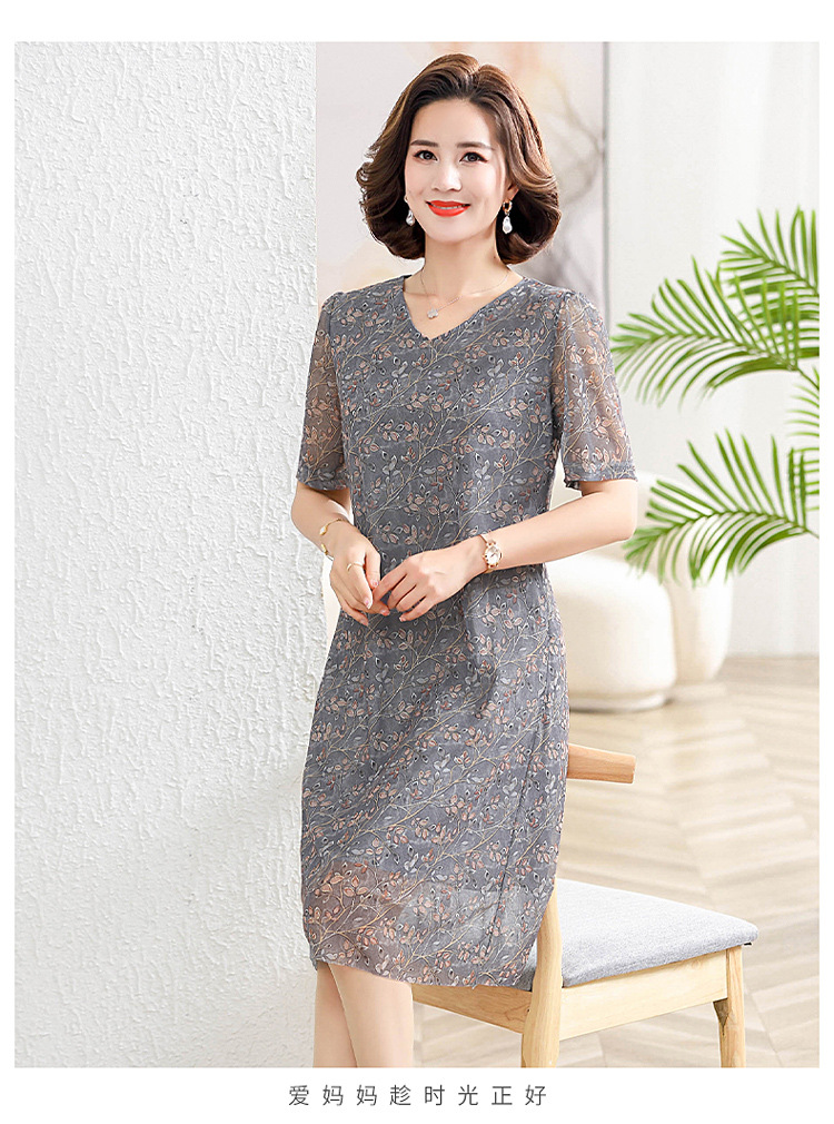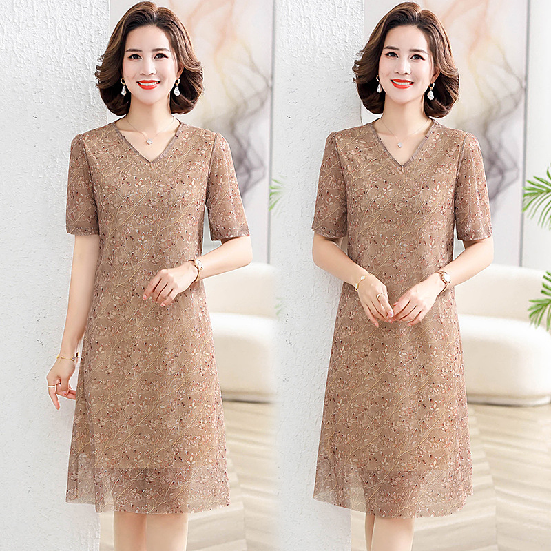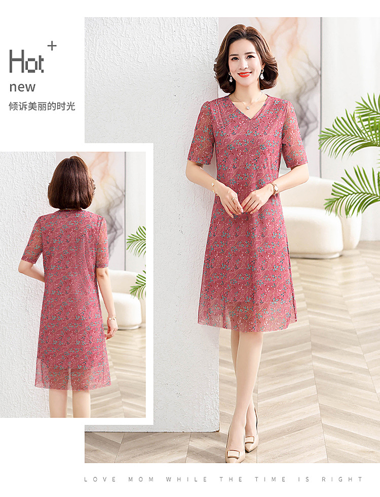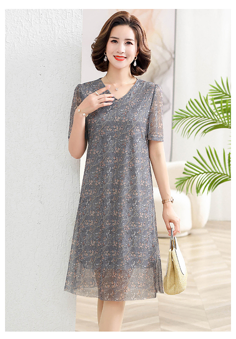 Новая летняя одежда для мам, платье с v-образным вырезом и короткими рукавами, чтобы уменьшить возраст и похудеть, модная юбка с цветочным принтом для женщин среднего и пожилого возраста.