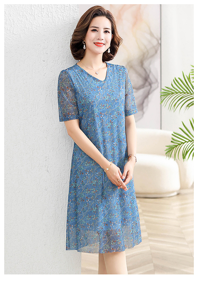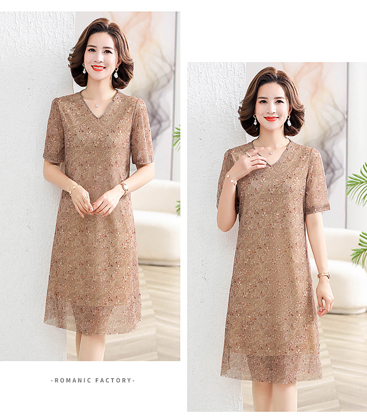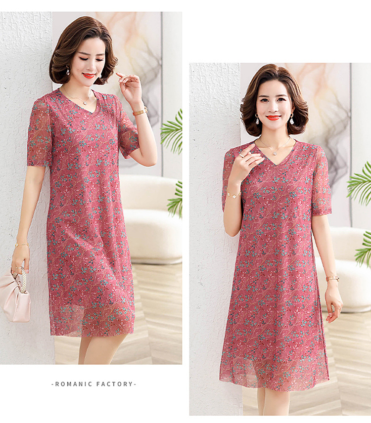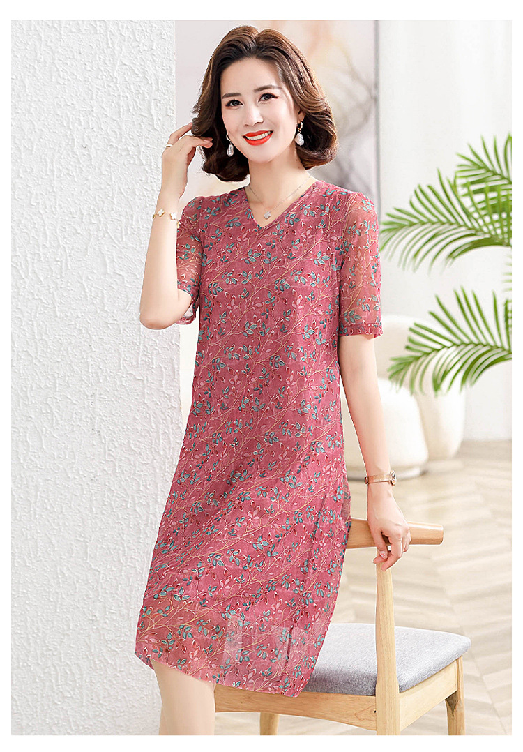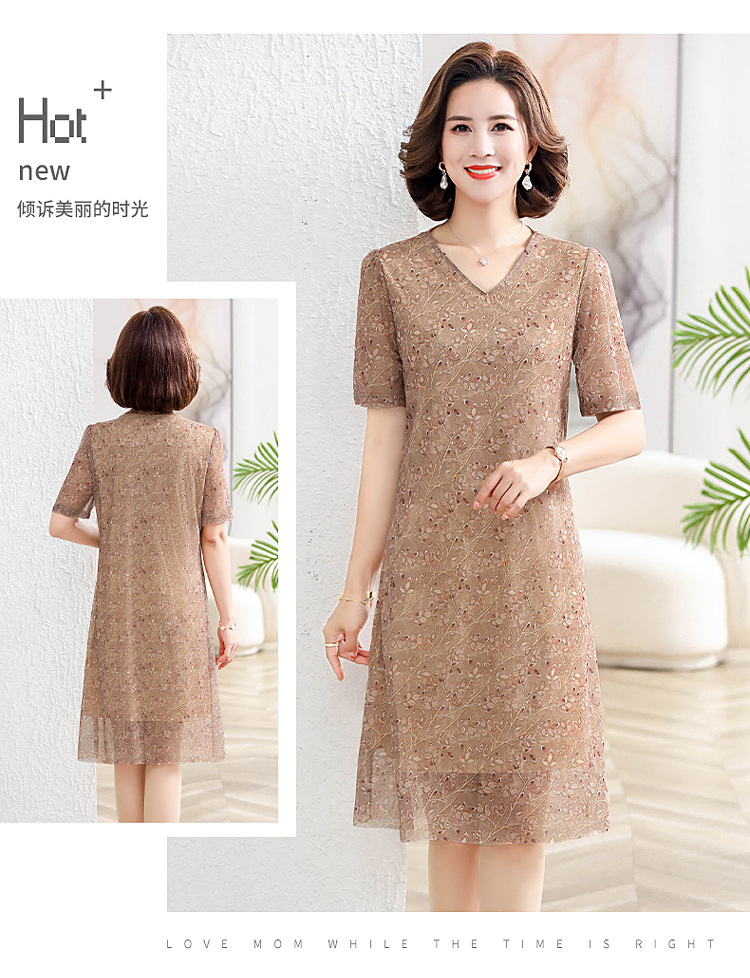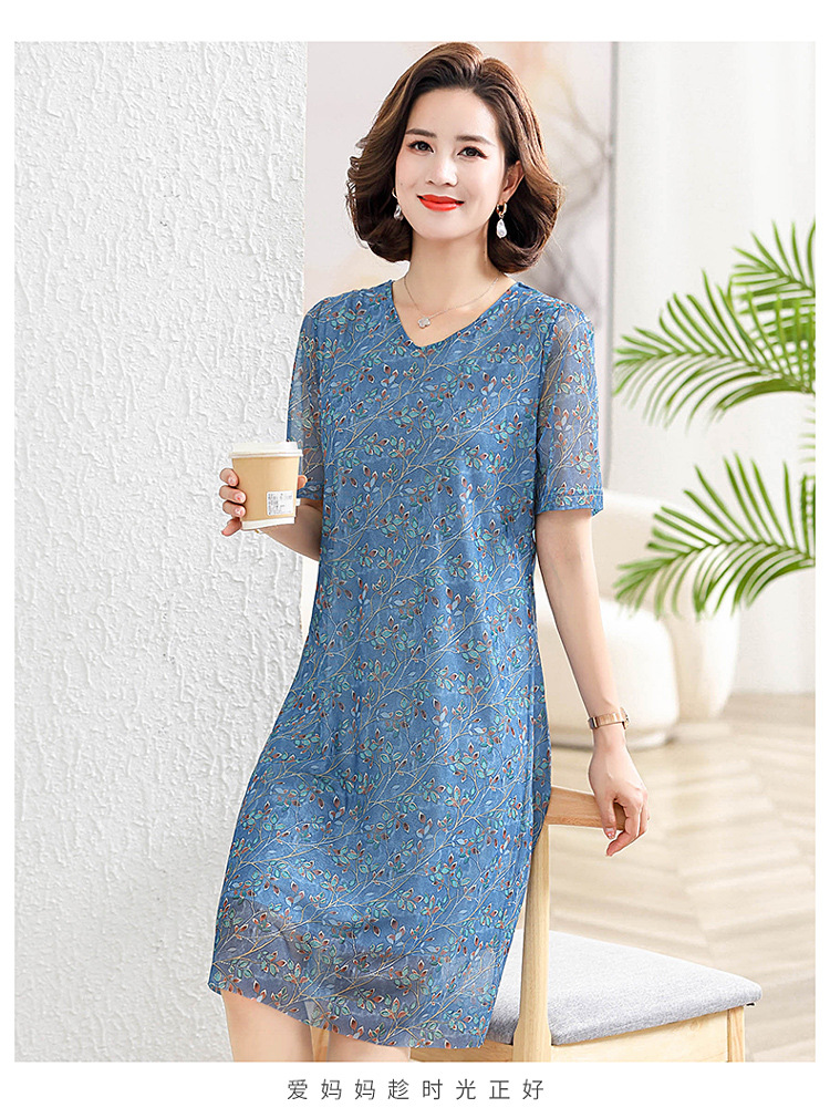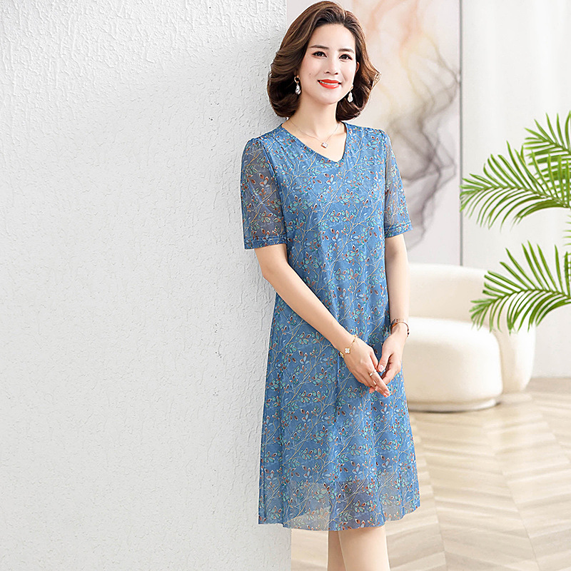 Новая летняя одежда для мам, платье с v-образным вырезом и короткими рукавами, чтобы уменьшить возраст и похудеть, модная юбка с цветочным принтом для женщин среднего и пожилого возраста.