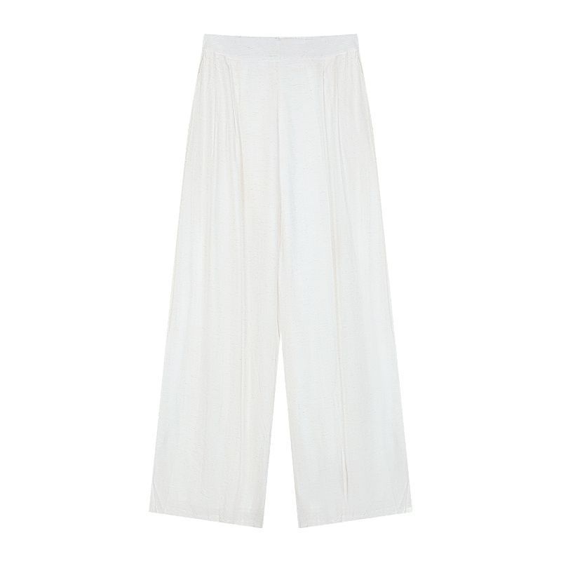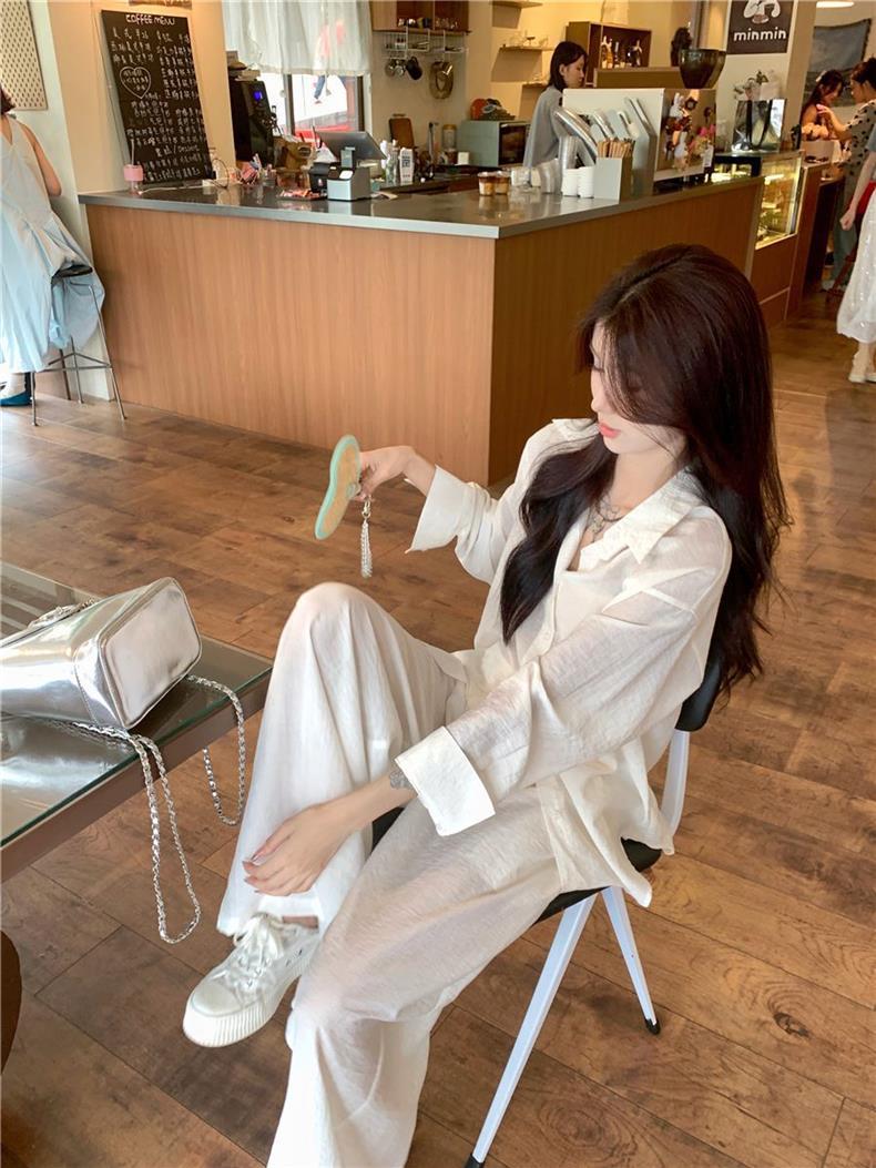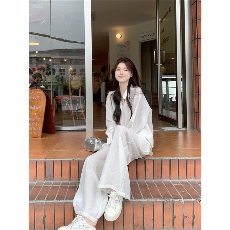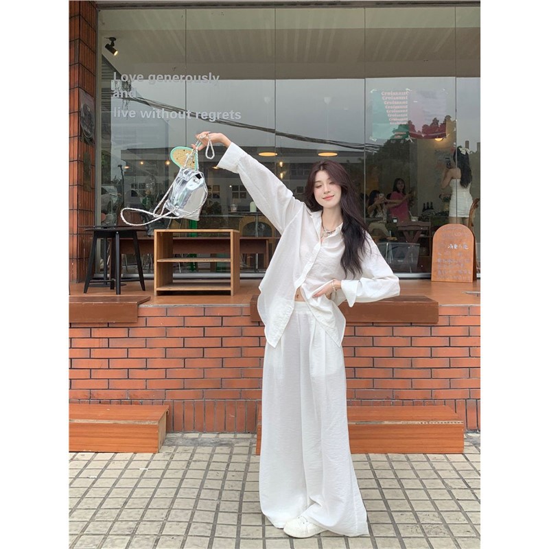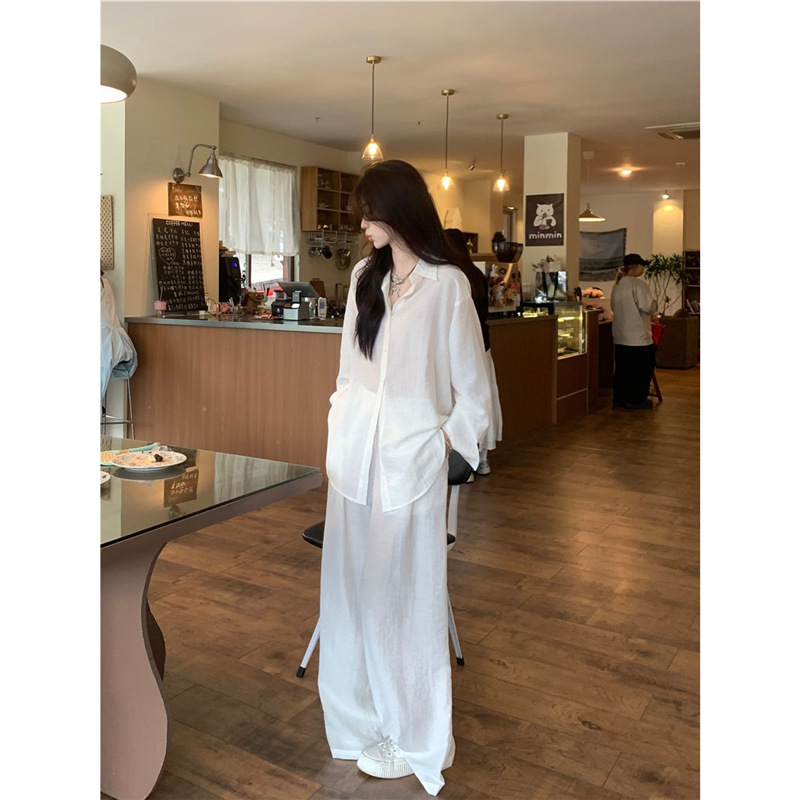 Летний костюм-двойка 2025 года: элегантная рубашка средней длины и широкие брюки в пол с высокой талией