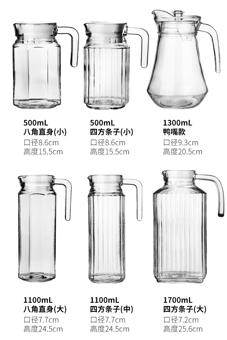 耐热壶-八角-1.1L; 耐热壶-条纹-1.1L; 耐热壶-条纹-1.7L; 冷水壶-八角大1.1L; 冷水壶-四方中1.1L; 冷水壶-四方大1.7L; 葫芦壶-120毫升(ml); 葫芦壶-315毫升(ml); 葫芦壶-550毫升(ml)
