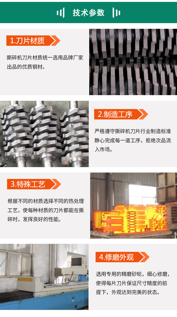 撕碎机刀厚度分为15mm、20mm、40mm、50mm、75mm、100mm可根据物体破碎后颗粒大小来选择刀体。