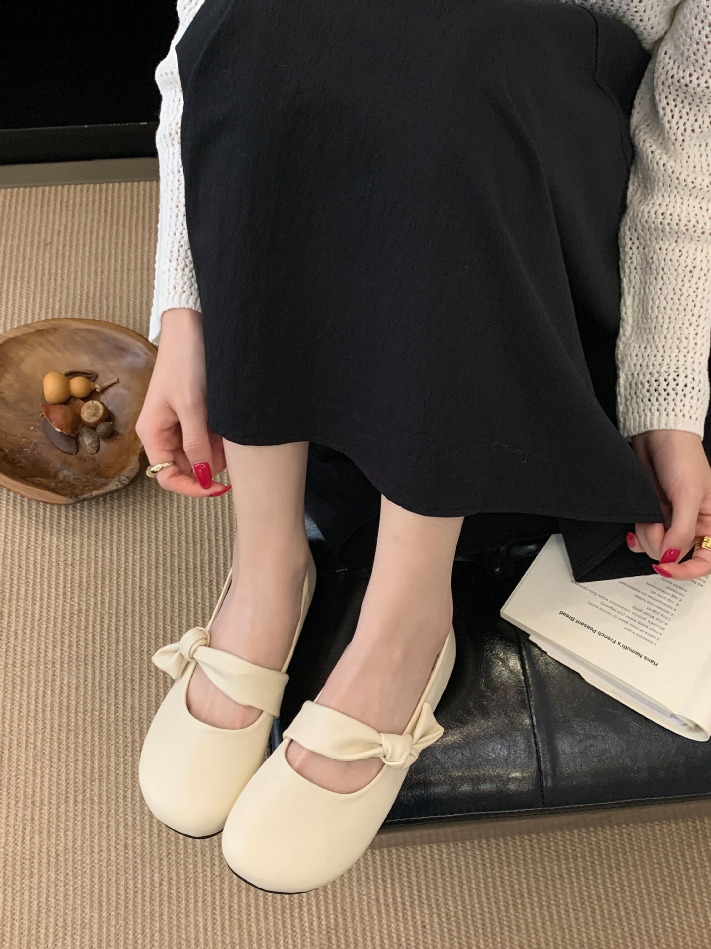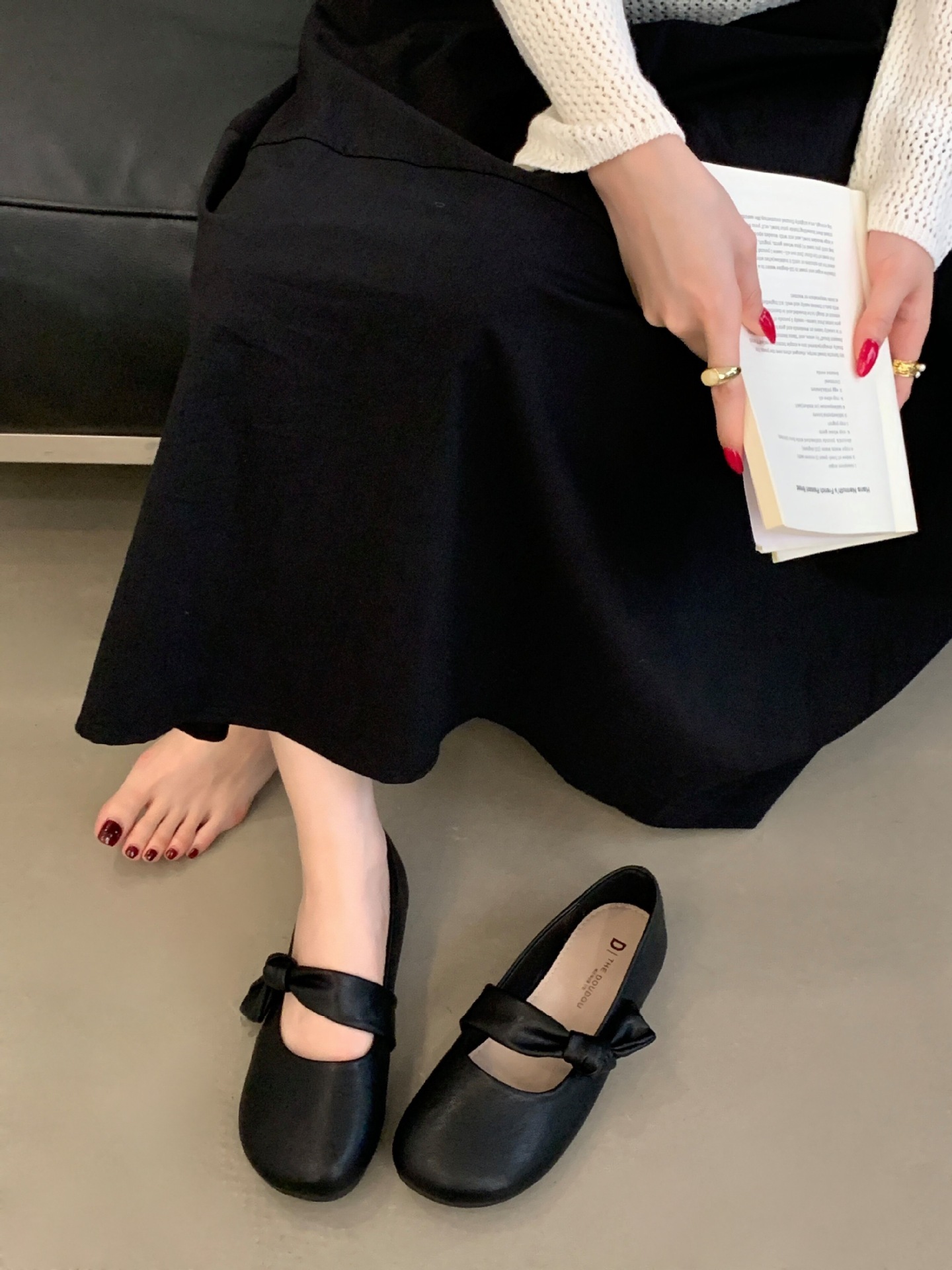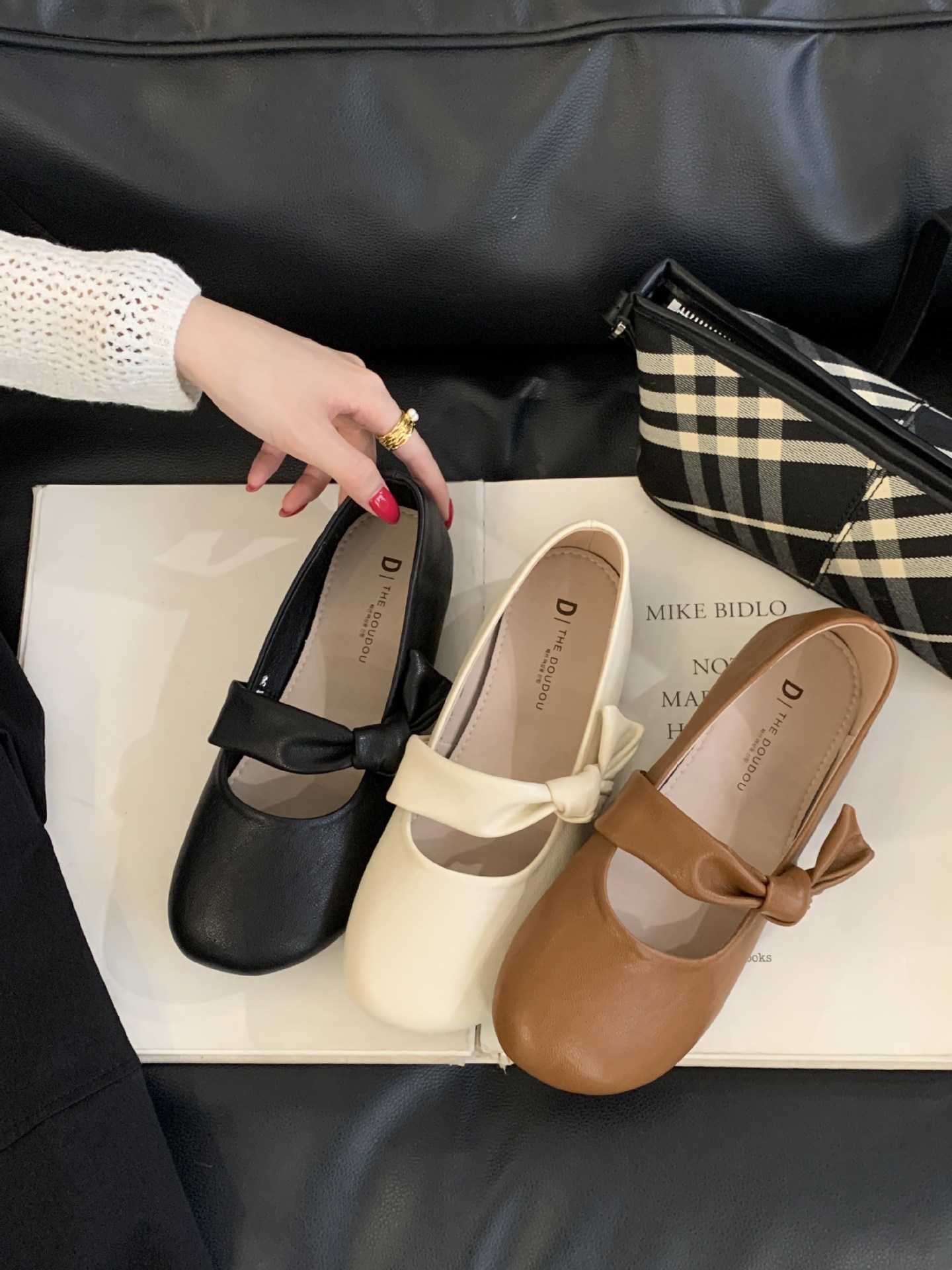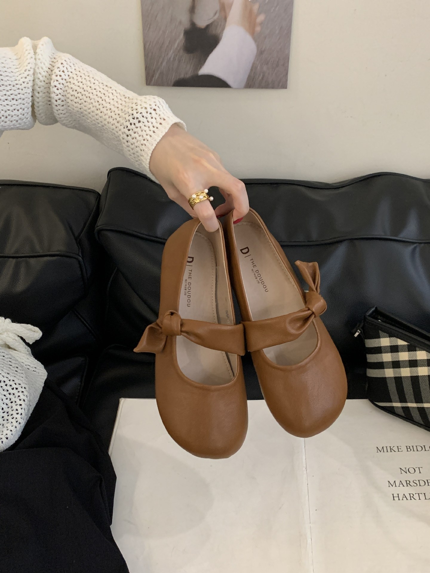 平跟设计感一字带棕色通勤单鞋女鞋子2025新款圆头法式晚晚奶奶鞋