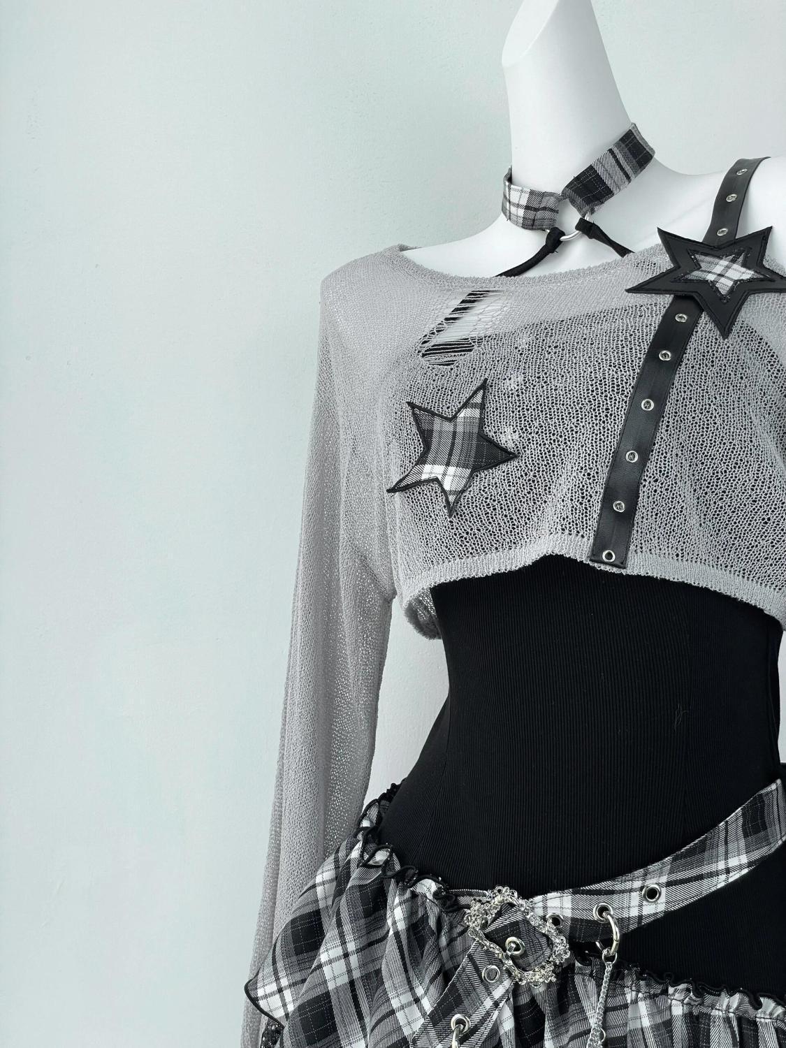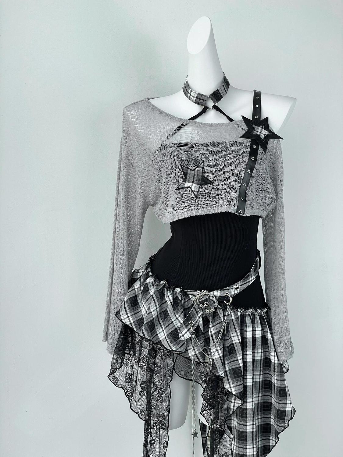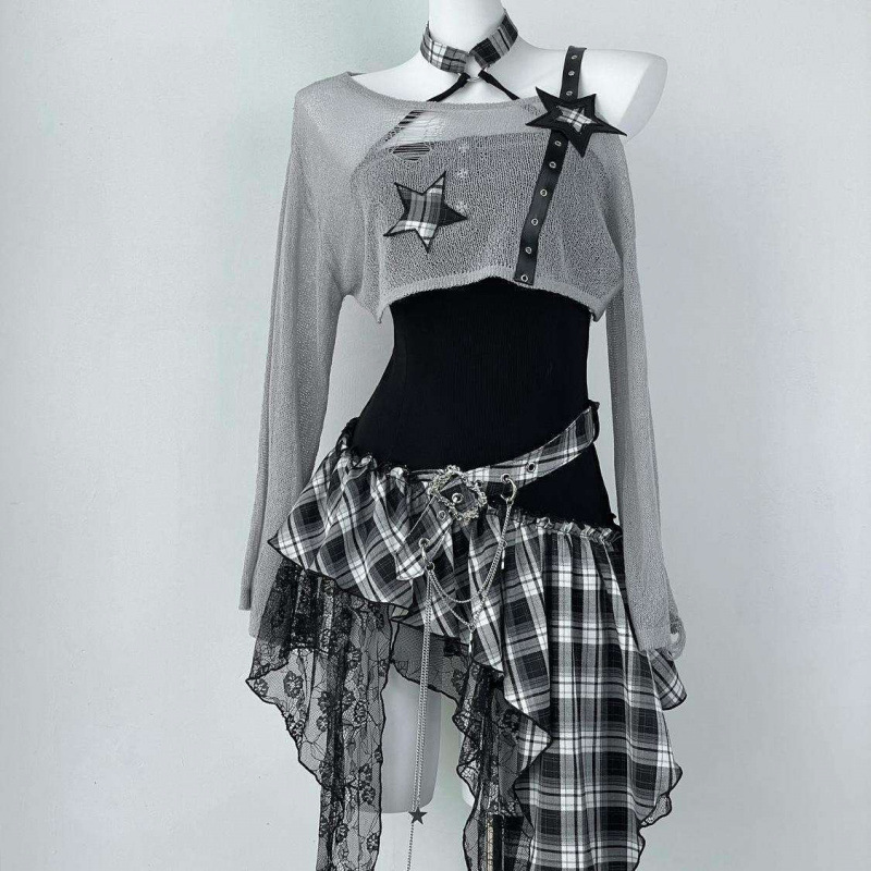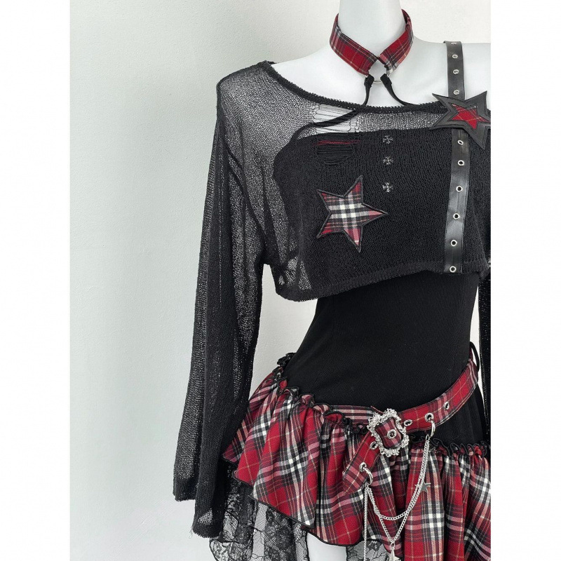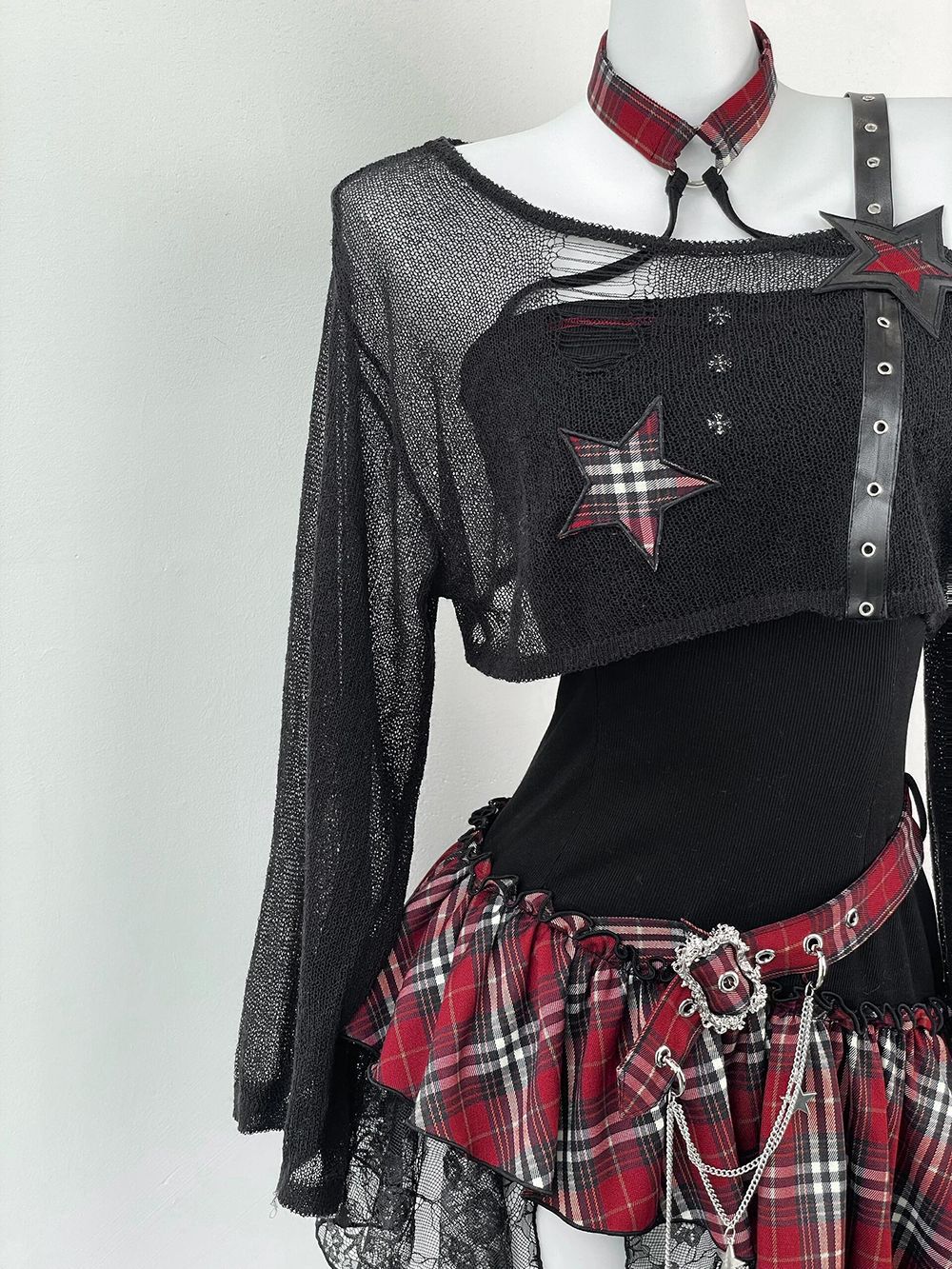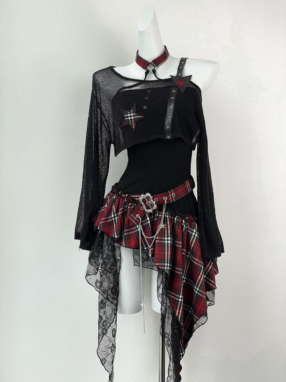 黑色镂空罩衫; 红格拼接连衣裙; 黑色镂空罩衫+红格拼接连衣裙; 浅灰镂空罩衫+黑白拼接连衣裙; 浅灰镂空罩衫; 黑白拼接连衣裙