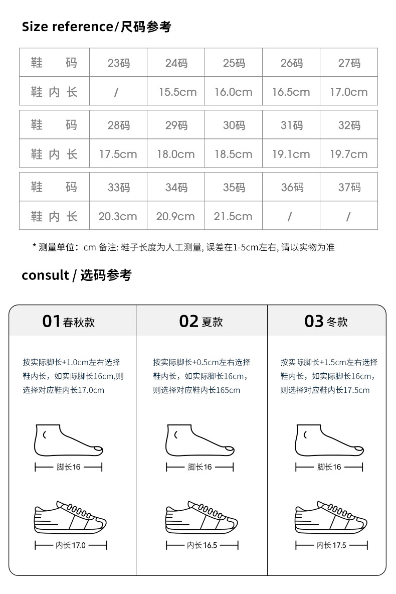 24内长15.5cm; 25内长16cm; 26内长16.5cm; 27内长17cm; 28内长17.5cm; 29内长18cm; 30内长18.5cm; 31内长19.1cm; 32内长19.7cm; 33内长20.3cm; 34内长20.9cm; 35内长21.5cm