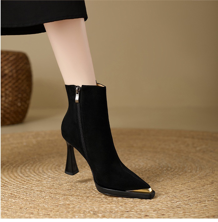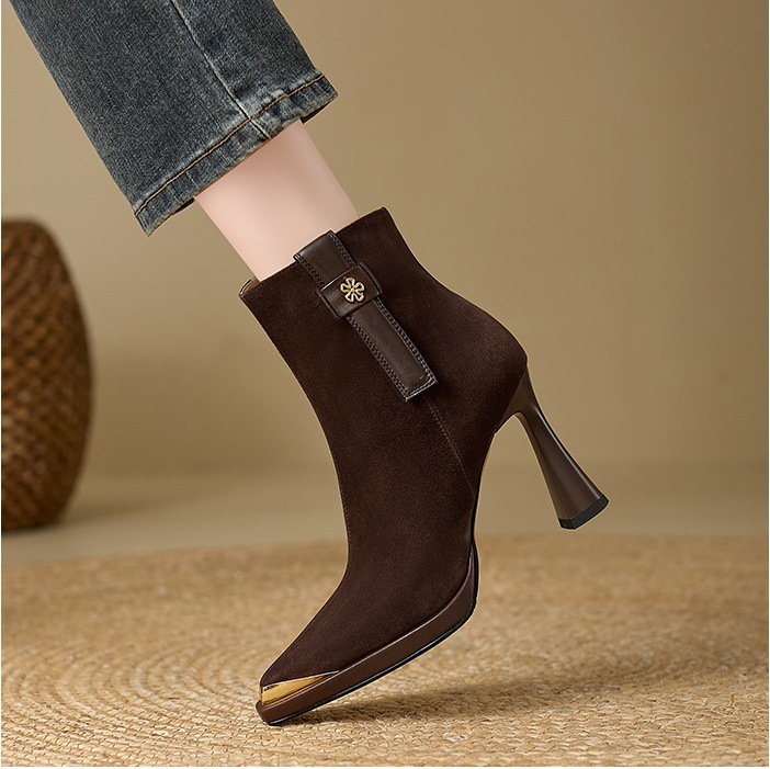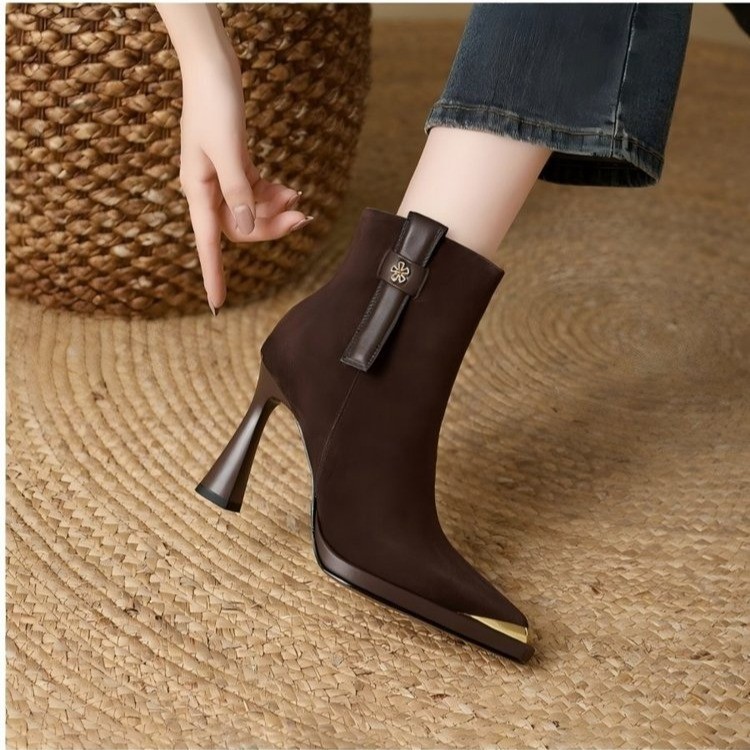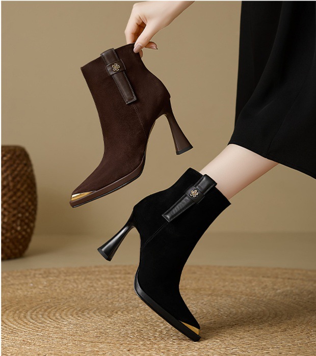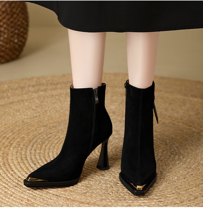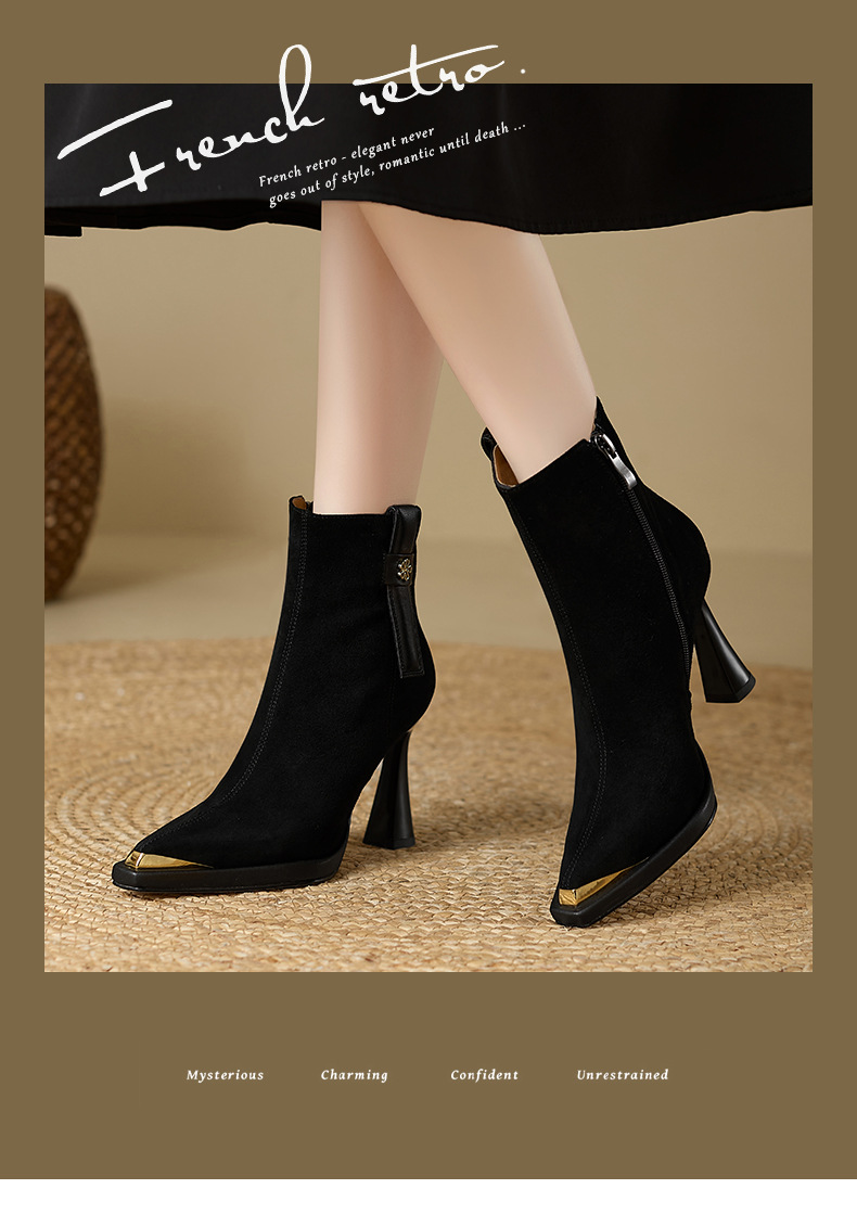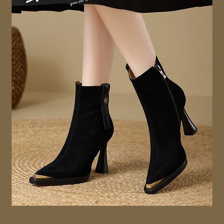 复古英伦风防水台高跟女2025秋冬新款金属尖头细跟时装靴瘦瘦靴